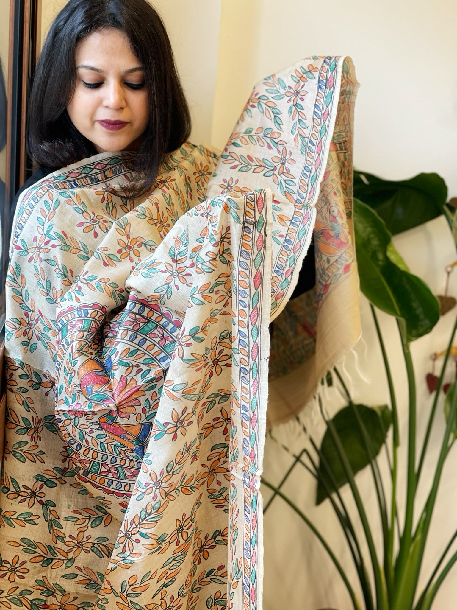 Handpainted Madhubani Dupatta in Pure Tussar Silk
