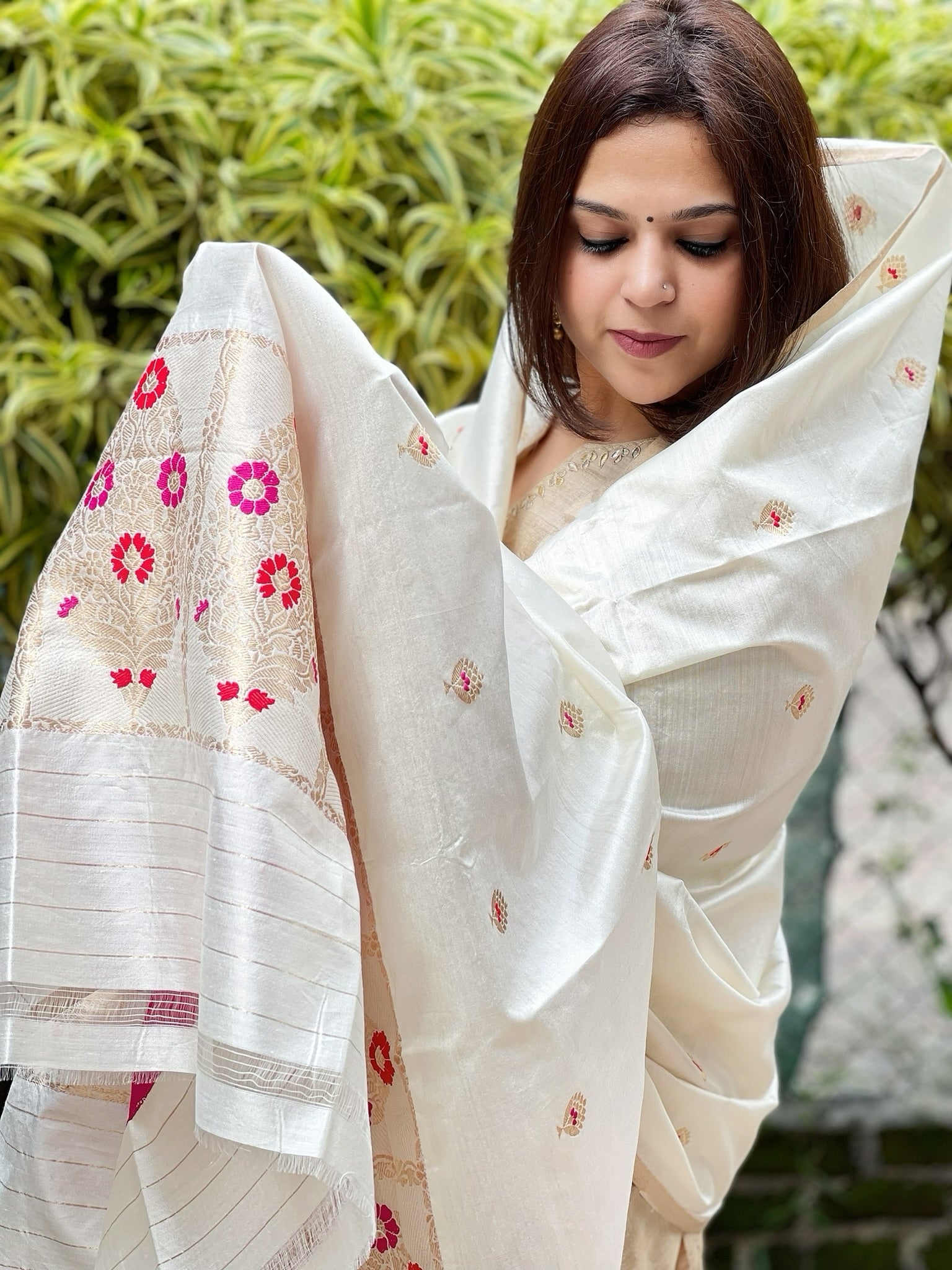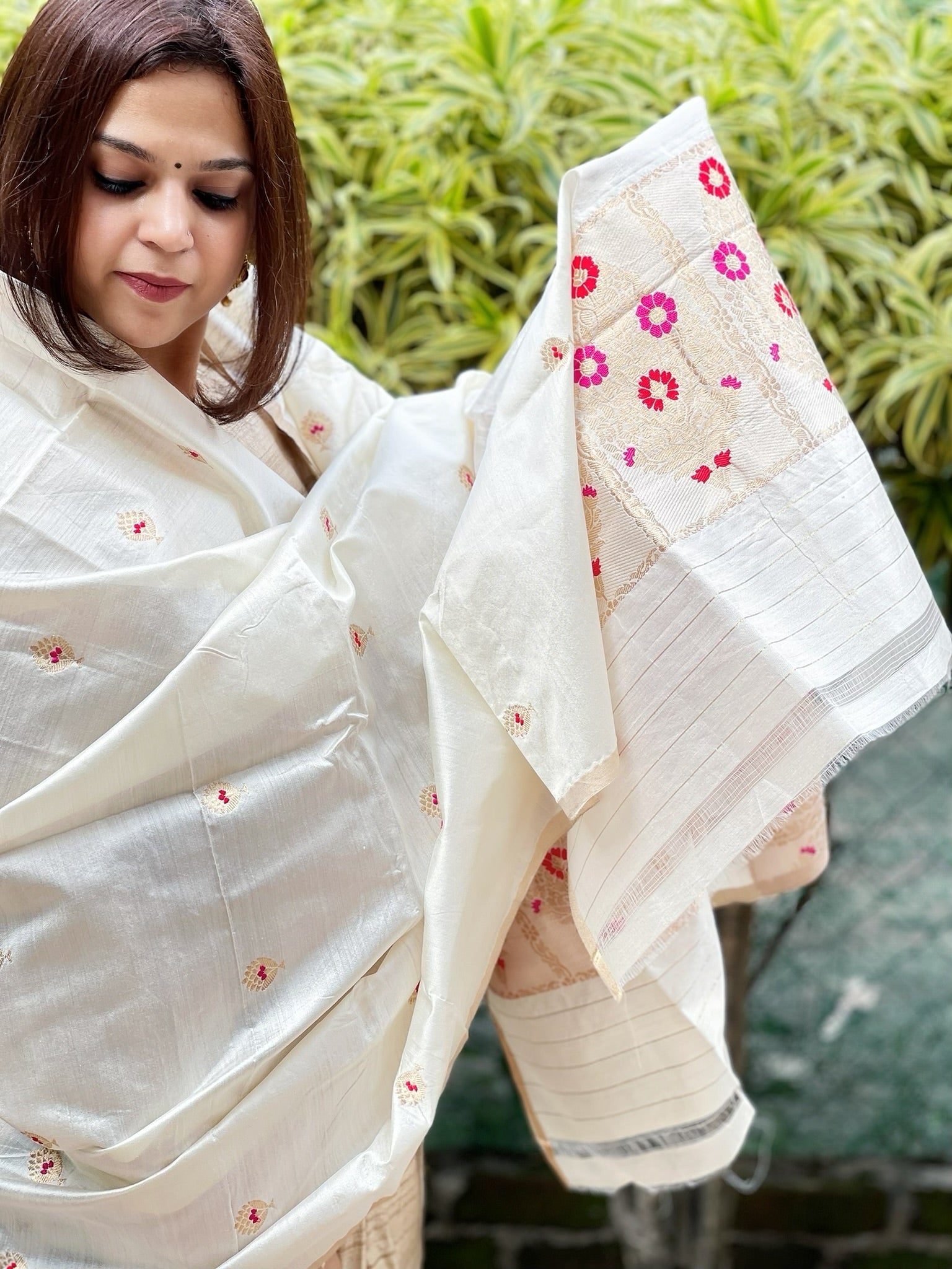 This Ivory Handwoven Banarasi Dupatta is crafted from pure silk, showcasing exquisite craftsmanship through intricate weaving techniques. Its elegant design and luxurious texture make it an ideal choice for festive occasions, adding a timeless touch of sophistication to your attire. Perfect for those who value tradition and fine artistry in their wardrobe.