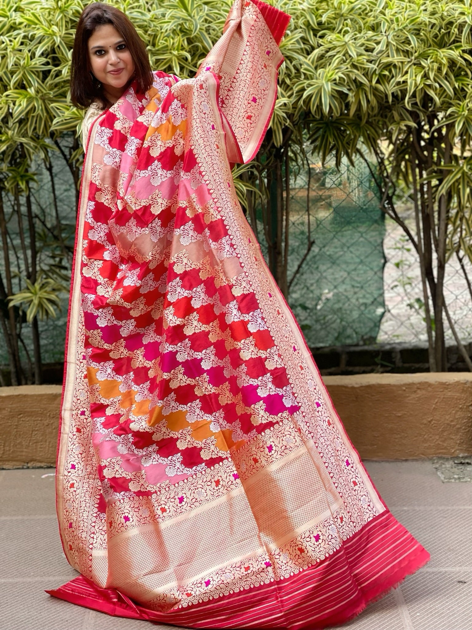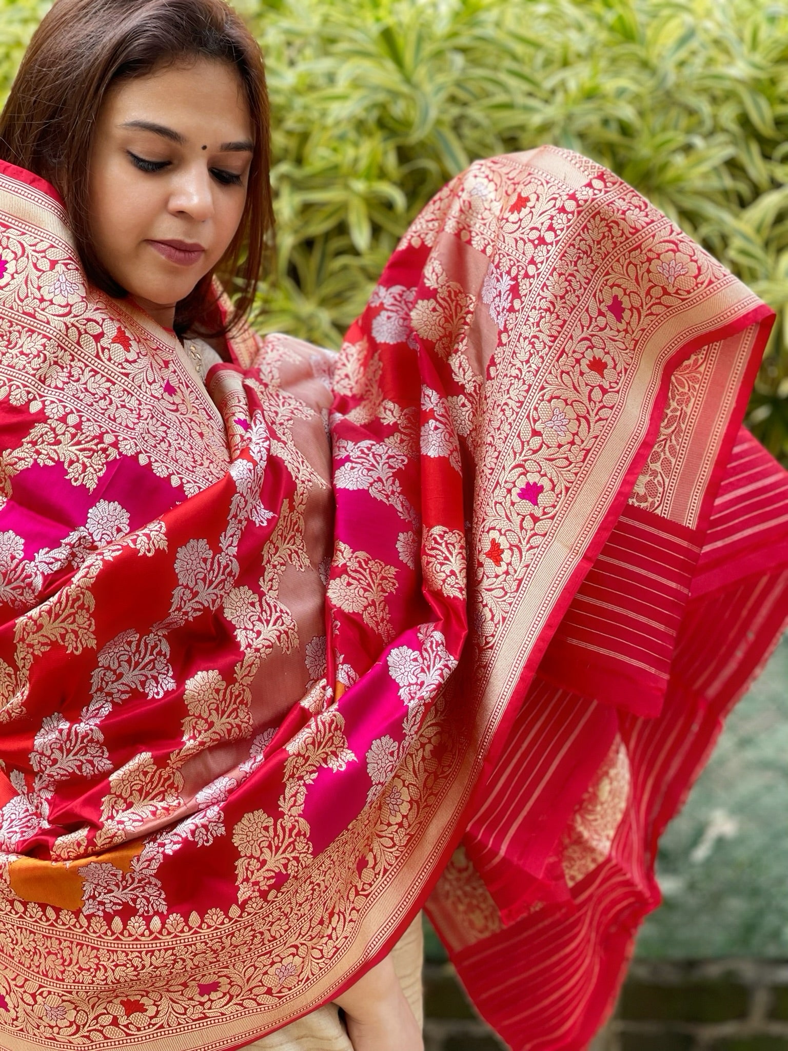 Experience the elegance of tradition with this Royal Handwoven Banarasi Rangkhat Dupatta crafted from pure Katan silk. Featuring intricate Kadhwa hand weaving, it showcases the rich heritage and exceptional craftsmanship of Banarasi textiles.