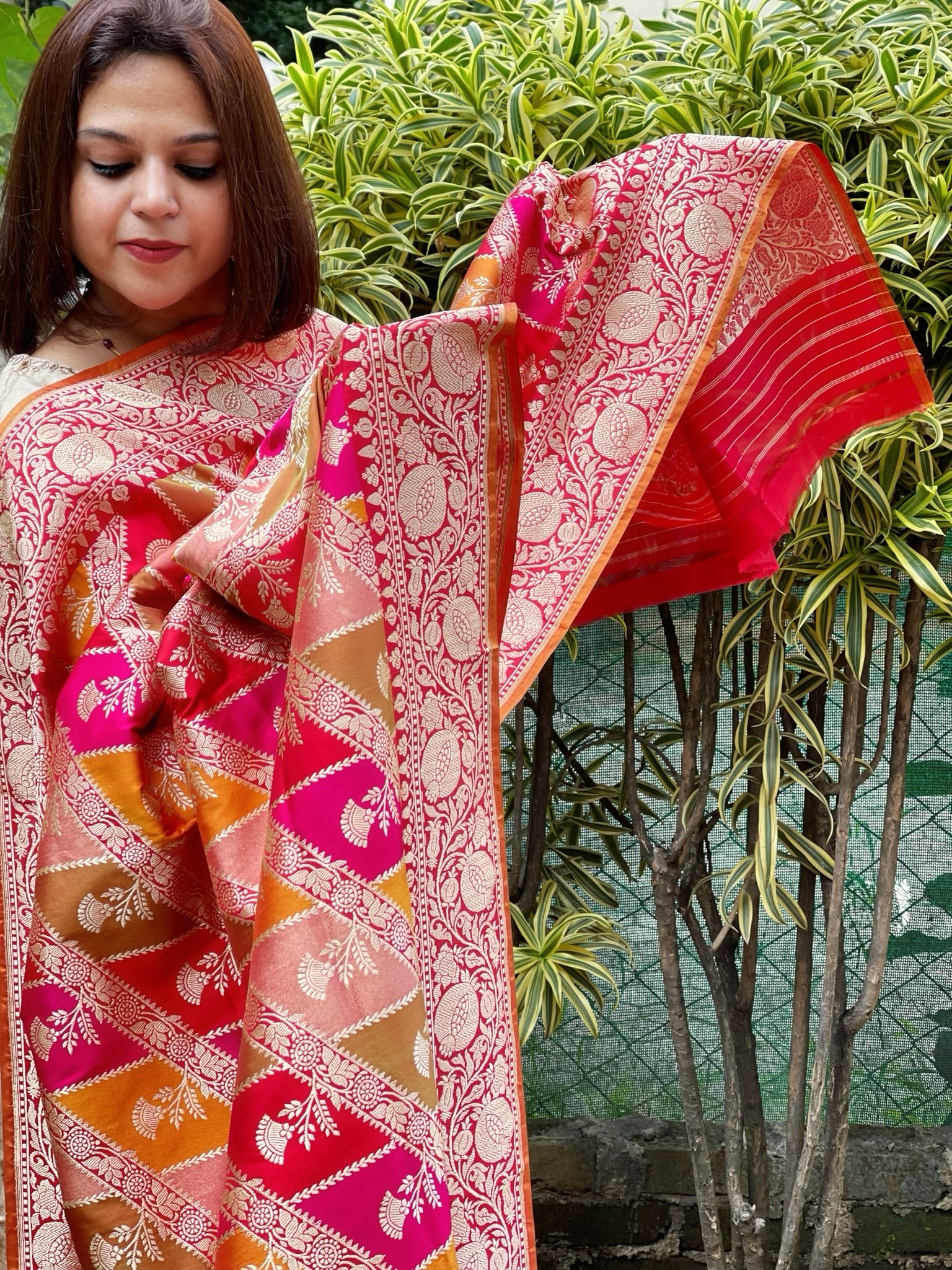 Experience the elegance of tradition with this Royal Handwoven Banarasi Rangkhat Dupatta crafted from pure Katan silk. Featuring intricate Kadhwa hand weaving, it showcases the rich heritage and exceptional craftsmanship of Banarasi textiles.