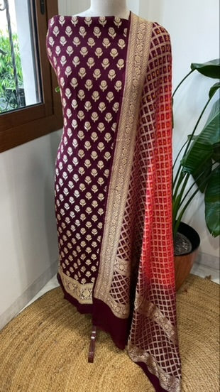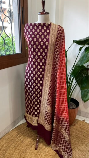 Elevate your festive wardrobe with this exquisite three-piece Banarasi suit set, meticulously handwoven to showcase timeless craftsmanship. The pure georgette kurta fabric features the signature golden zari work characteristic of authentic Banarasi weaving. Paired with a handwoven Neemzari Bandhej dupatta that adds traditional charm through its intricate tie-dye patterns, and complemented by a pure crepe bottom for comfort and elegance.