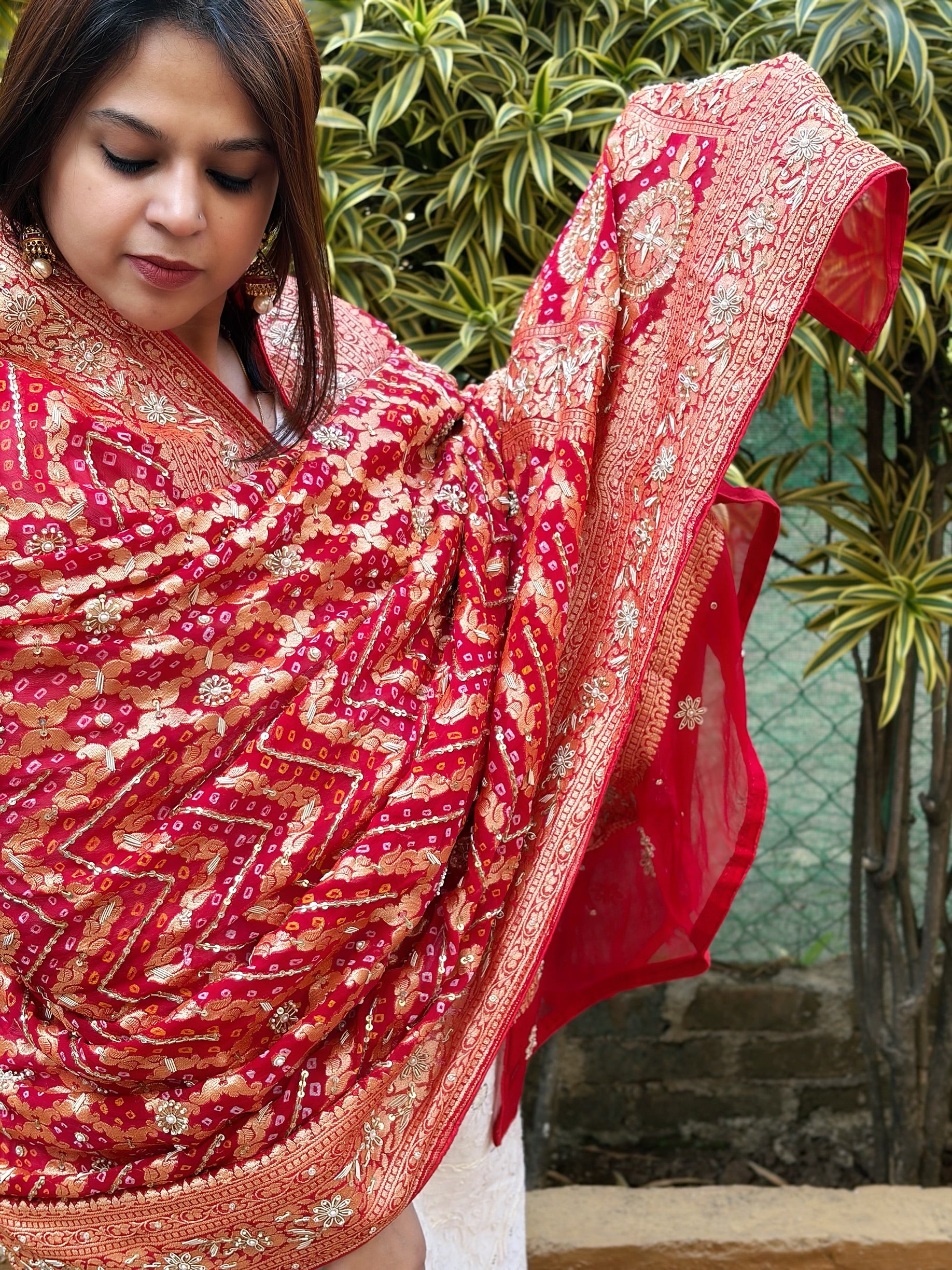 This timeless pure georgette dupatta features intricate handwoven neemzari bareek bandhani and delicate dabka and pearl handwork, making it the perfect addition to any Indian wedding ensemble.