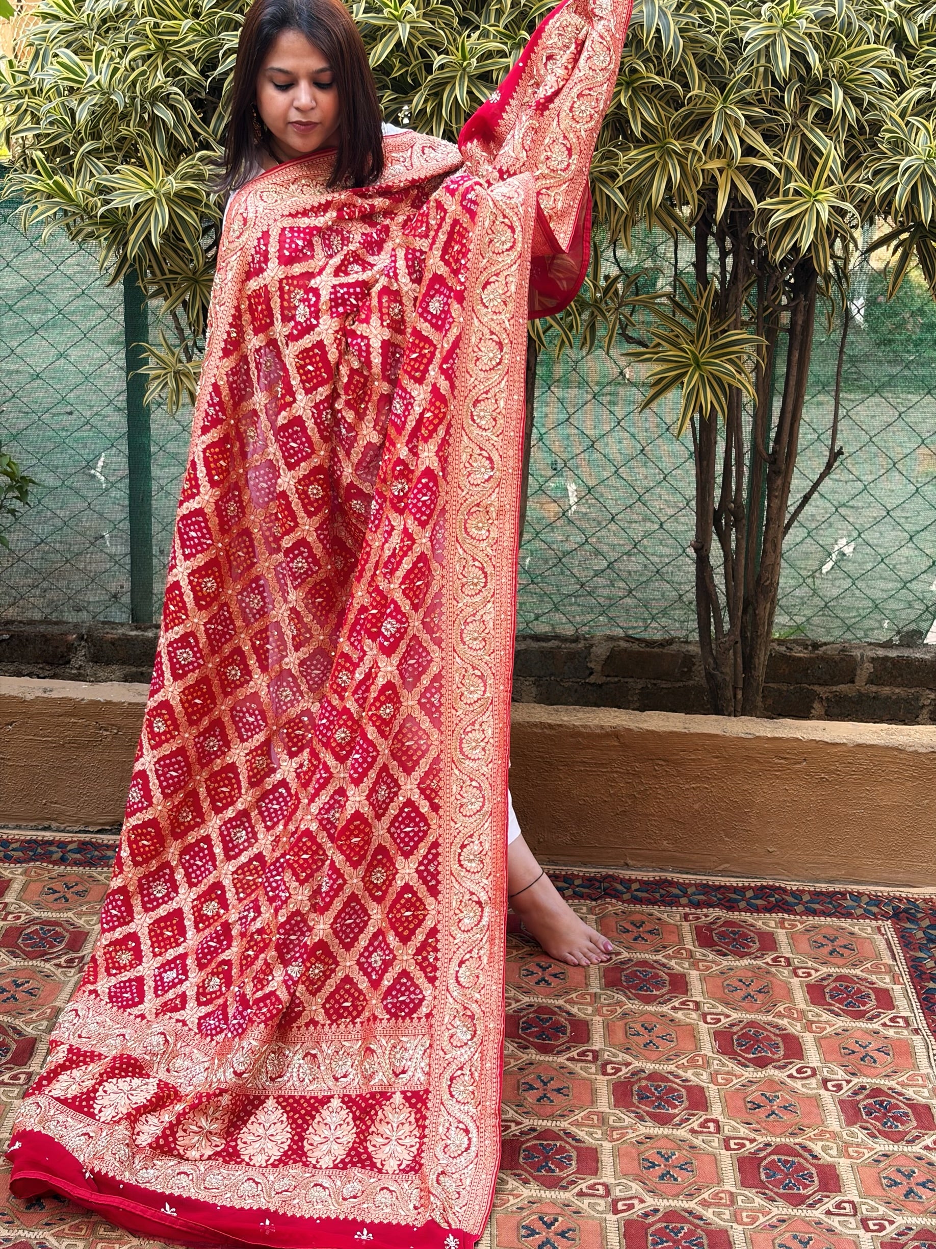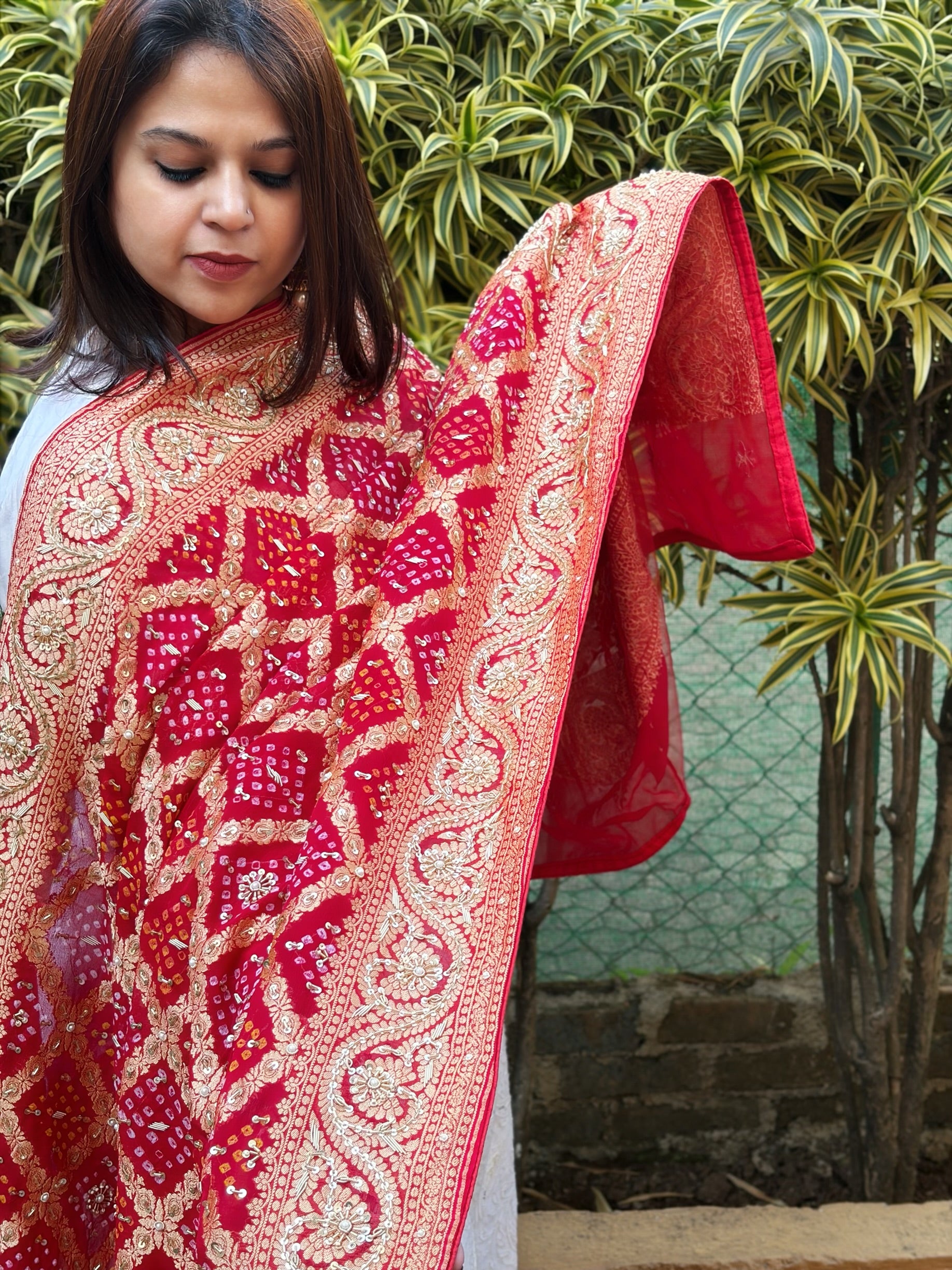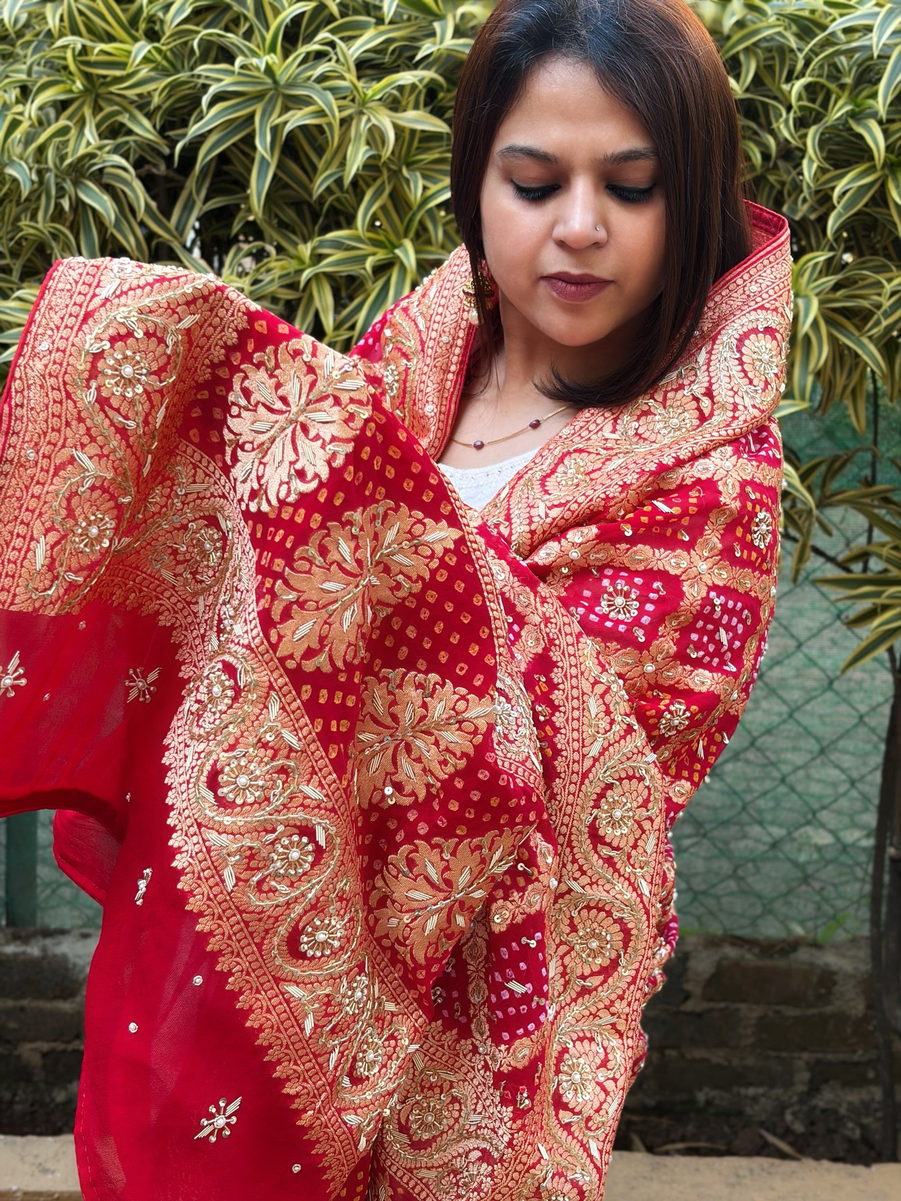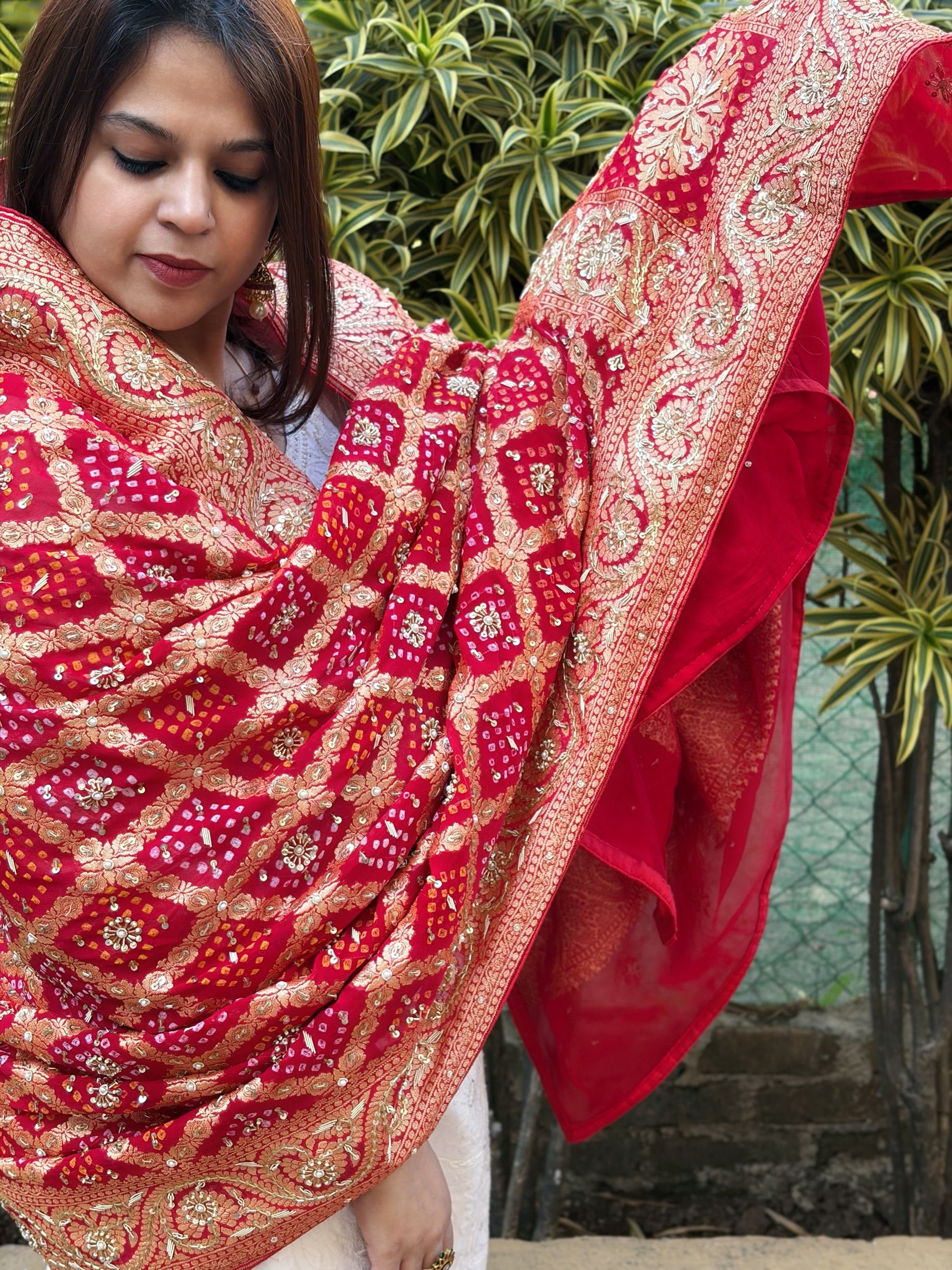 This timeless pure georgette dupatta features intricate handwoven neemzari bareek bandhani and delicate dabka and pearl handwork, making it the perfect addition to any Indian wedding ensemble.
