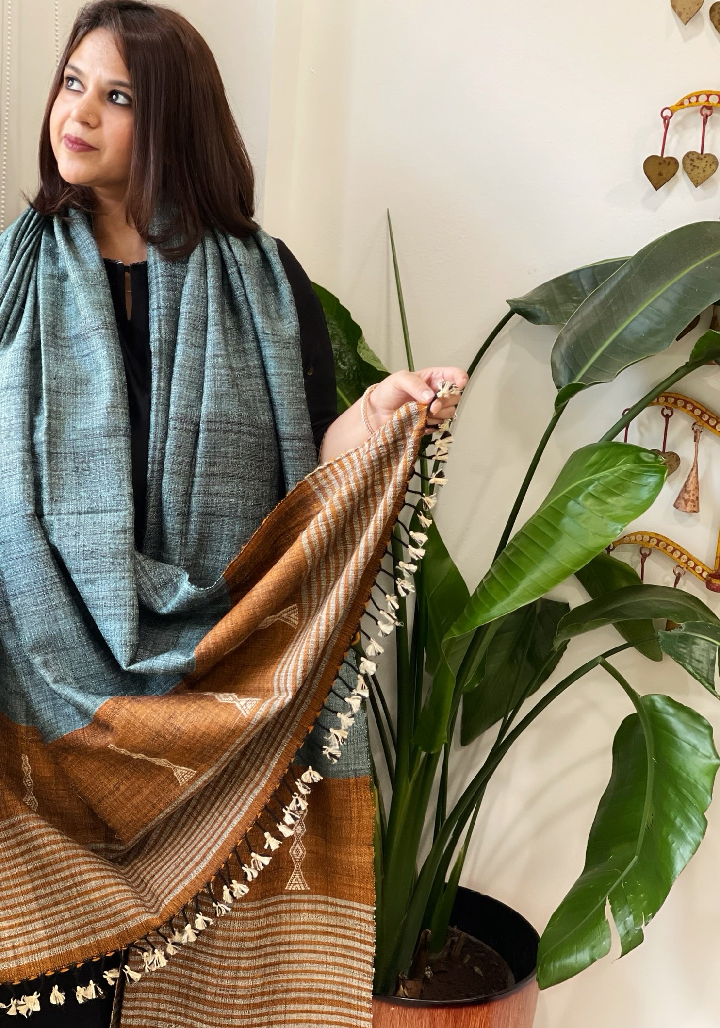 Expertly crafted with pure Tussar silk and wool, this handwoven shawl is the perfect accessory to make a winter statement. Its luxurious material offers both warmth and style, making it a must-have for any wardrobe.