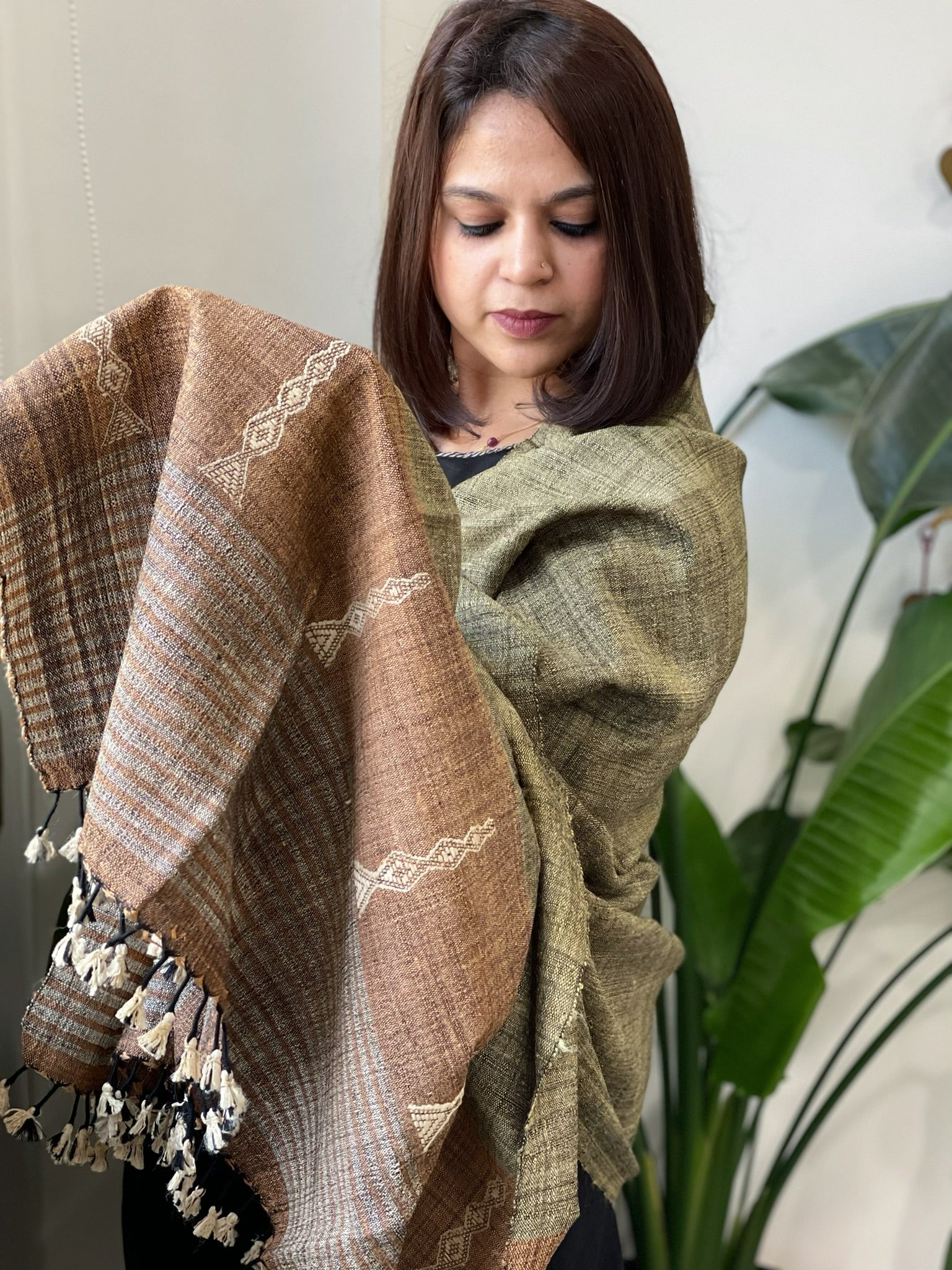 Expertly crafted with pure Tussar silk and wool, this handwoven shawl is the perfect accessory to make a winter statement. Its luxurious material offers both warmth and style, making it a must-have for any wardrobe.