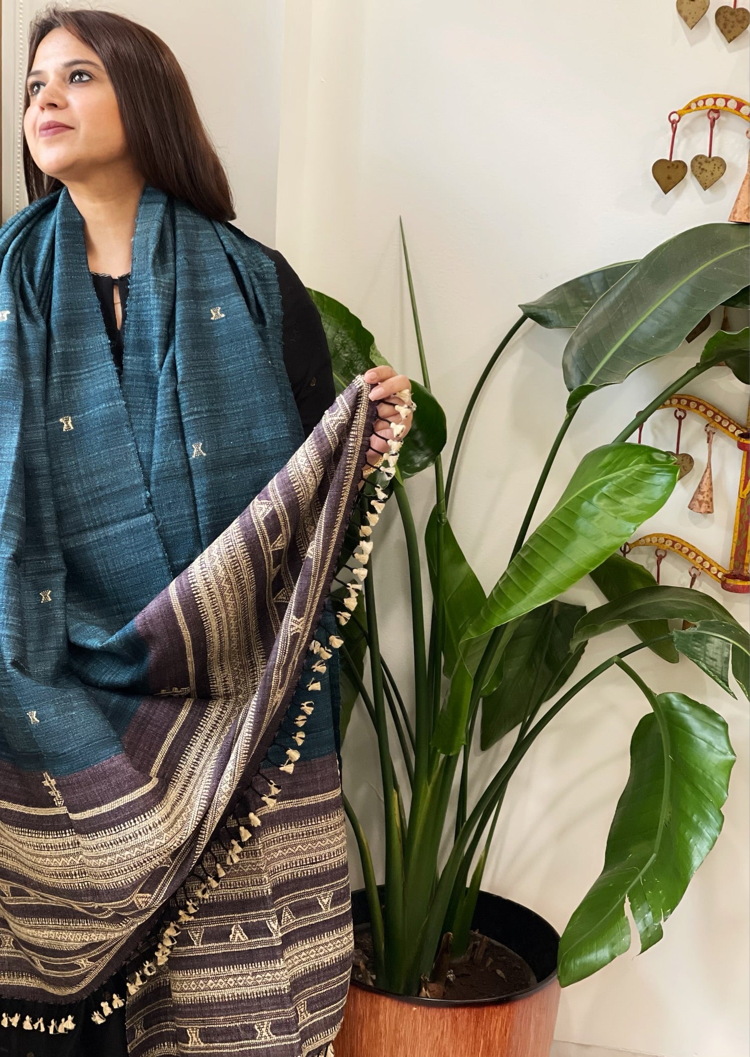 Teal Handwoven Bhujodi Shawl in Pure Tussar and Wool