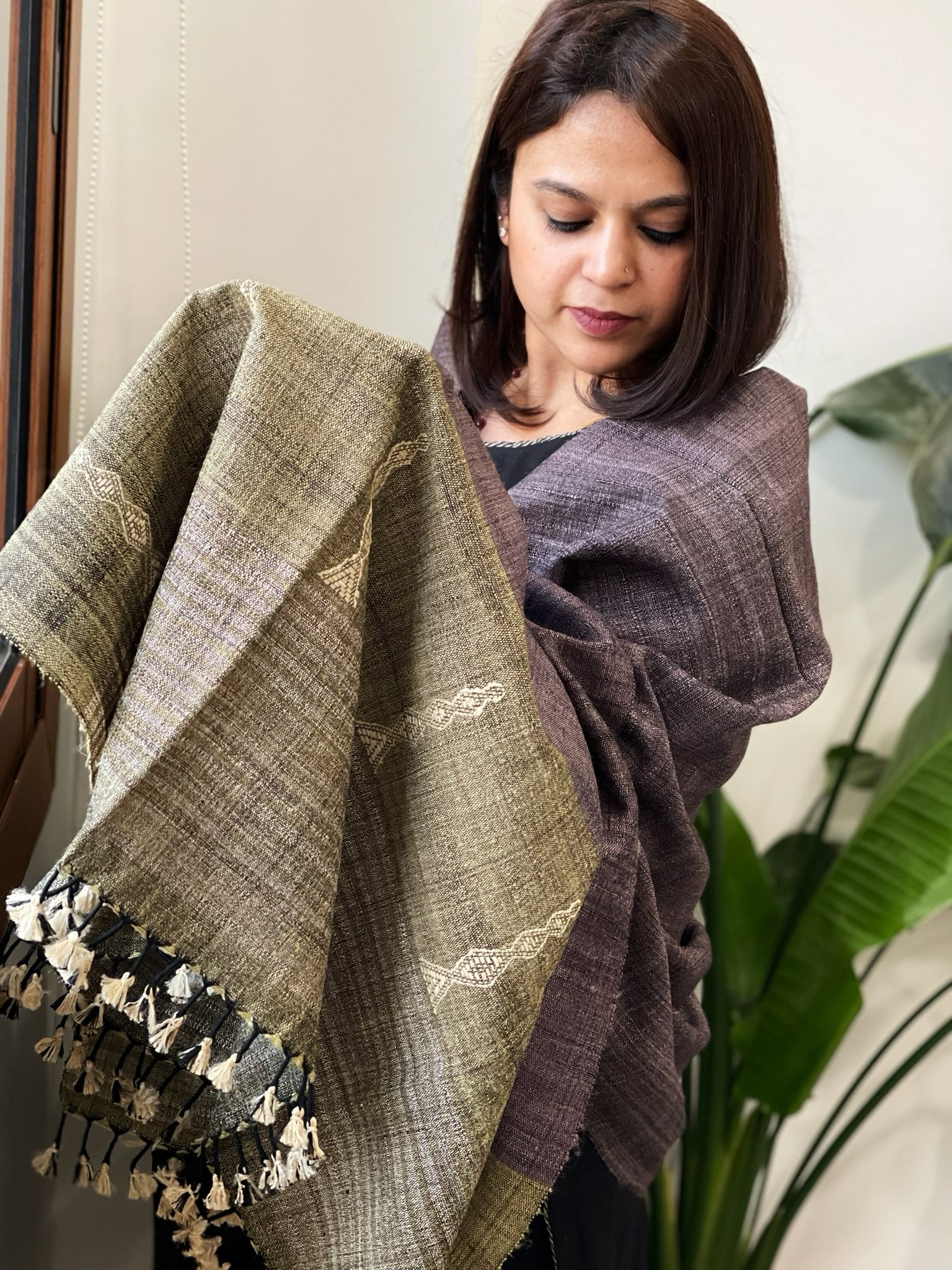 Expertly crafted with pure Tussar silk and wool, this handwoven shawl is the perfect accessory to make a winter statement. Its luxurious material offers both warmth and style, making it a must-have for any wardrobe.