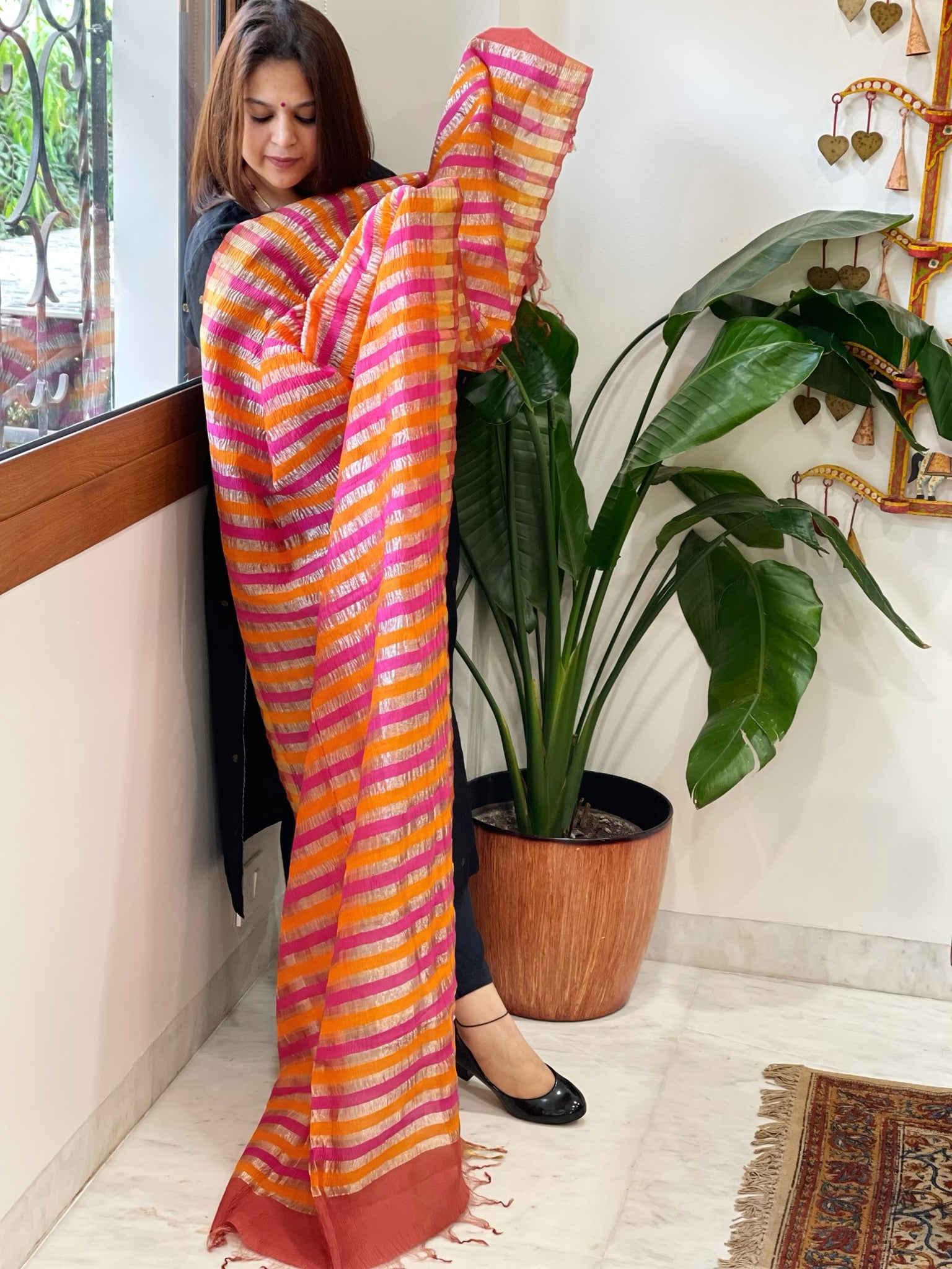 Pink, Orange Handwoven Chanderi Tissue Dupatta