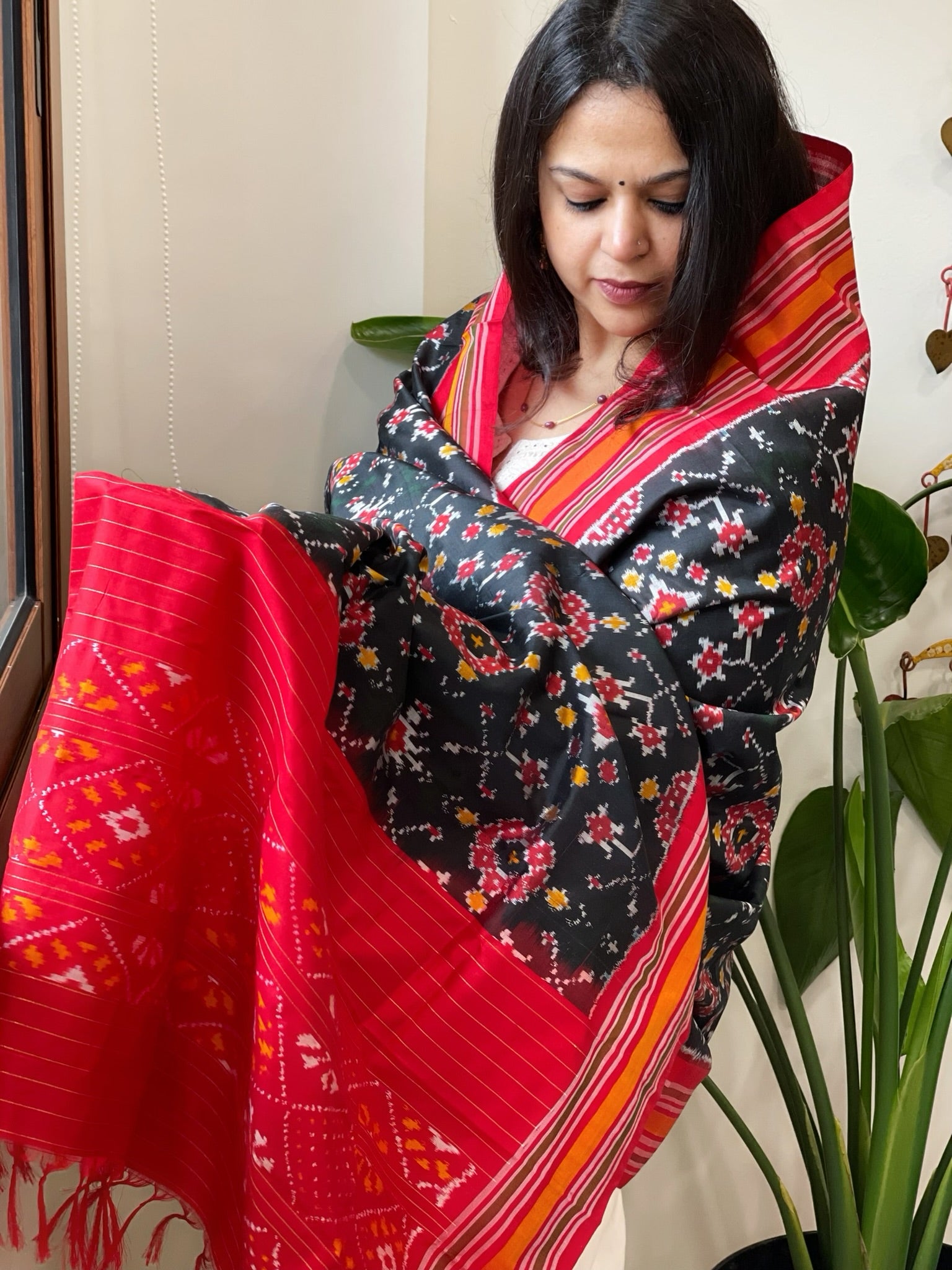 Expertly crafted from pure mulberry silk, this handwoven ikat dupatta is the epitome of grace and elegance. The intricate design and luxurious material make it a must-have accessory.