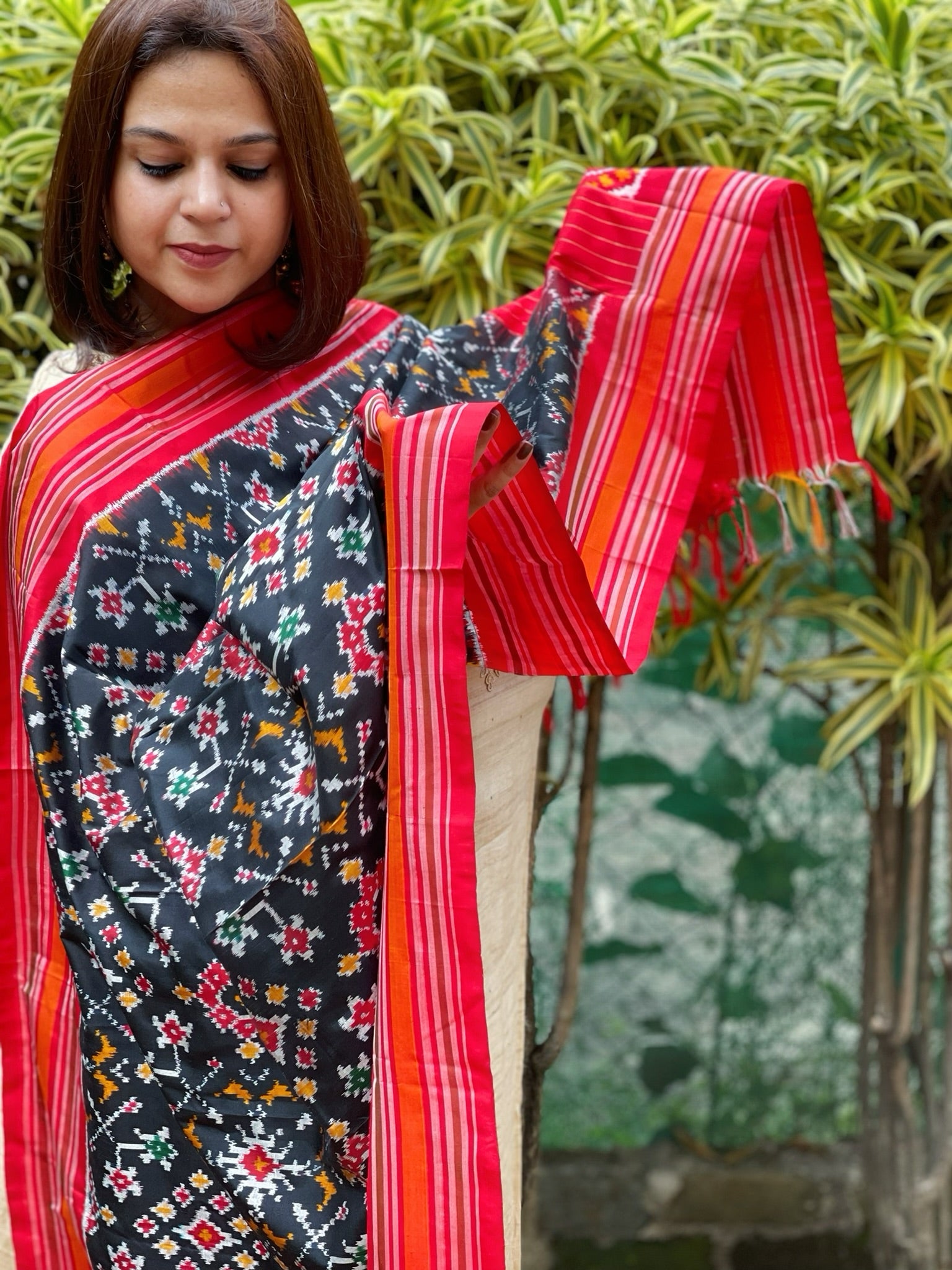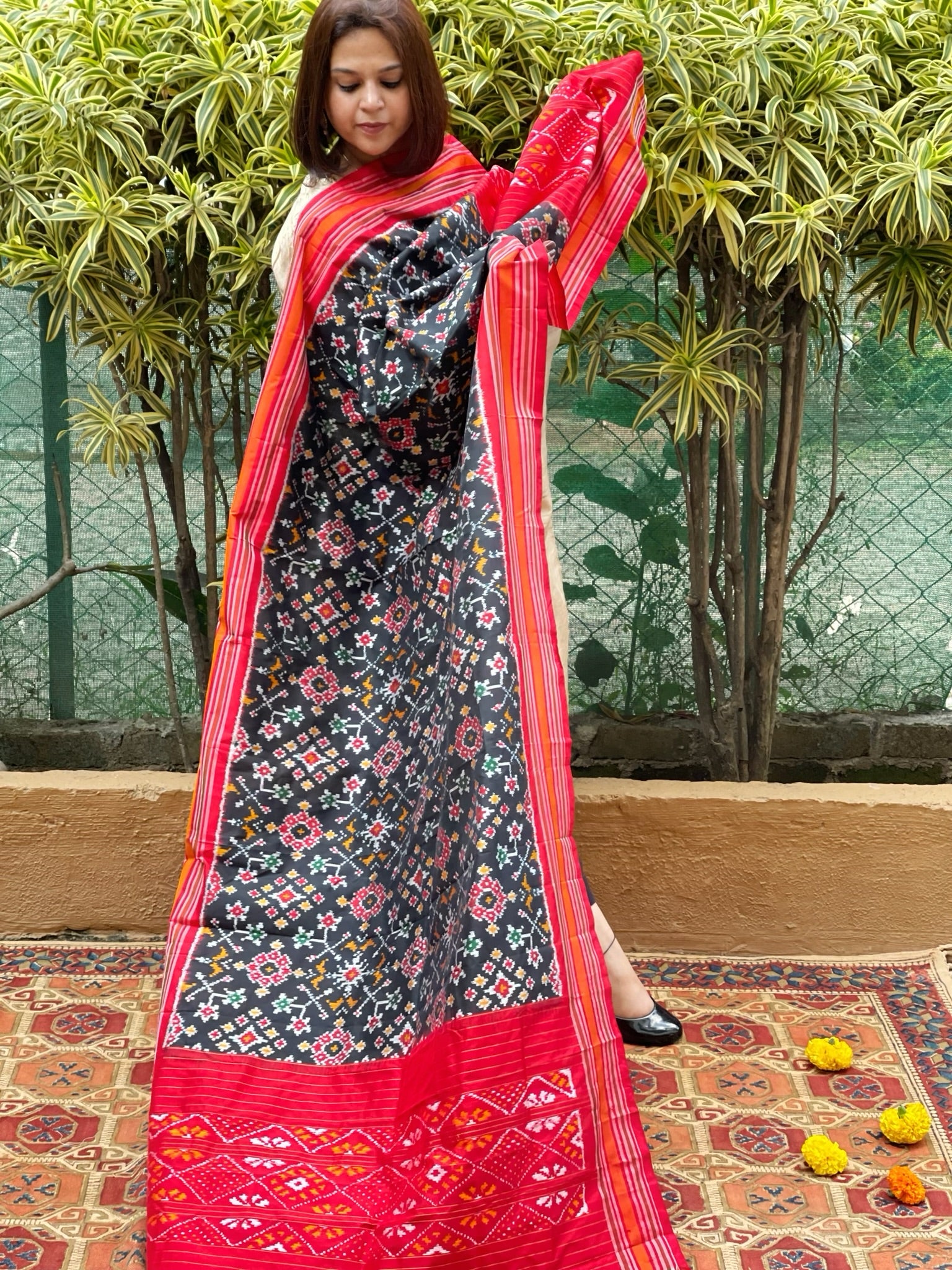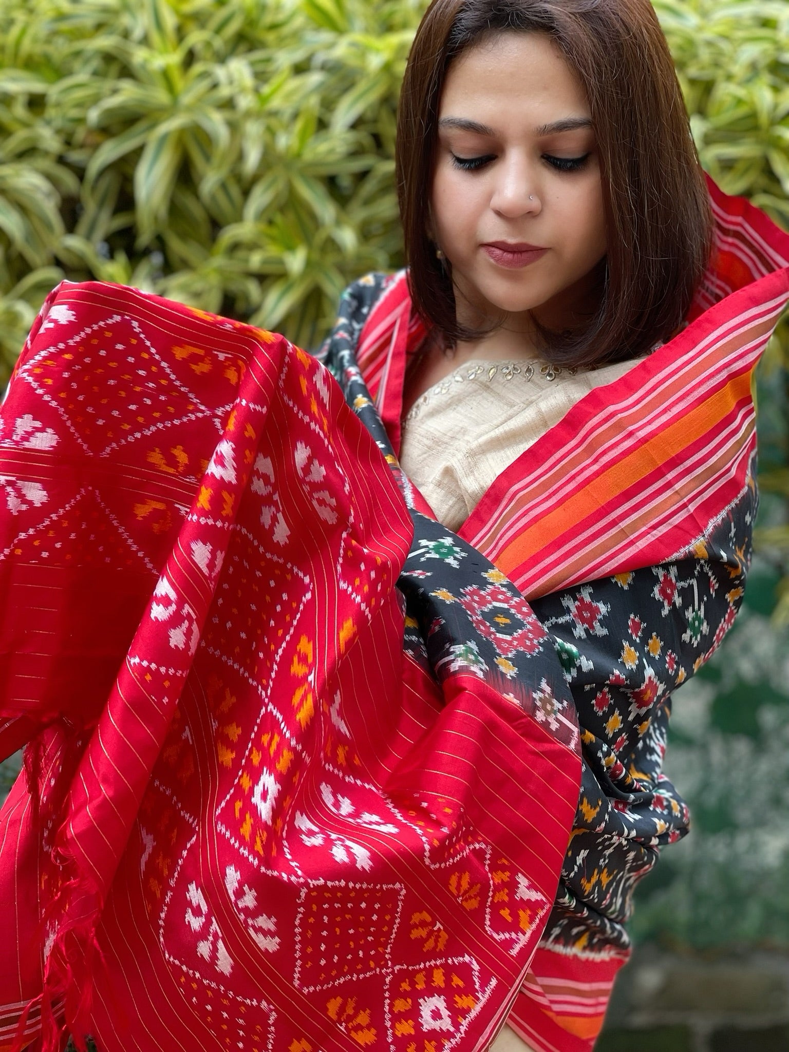 Expertly crafted from pure mulberry silk, this handwoven ikat dupatta is the epitome of grace and elegance. The intricate design and luxurious material make it a must-have accessory.