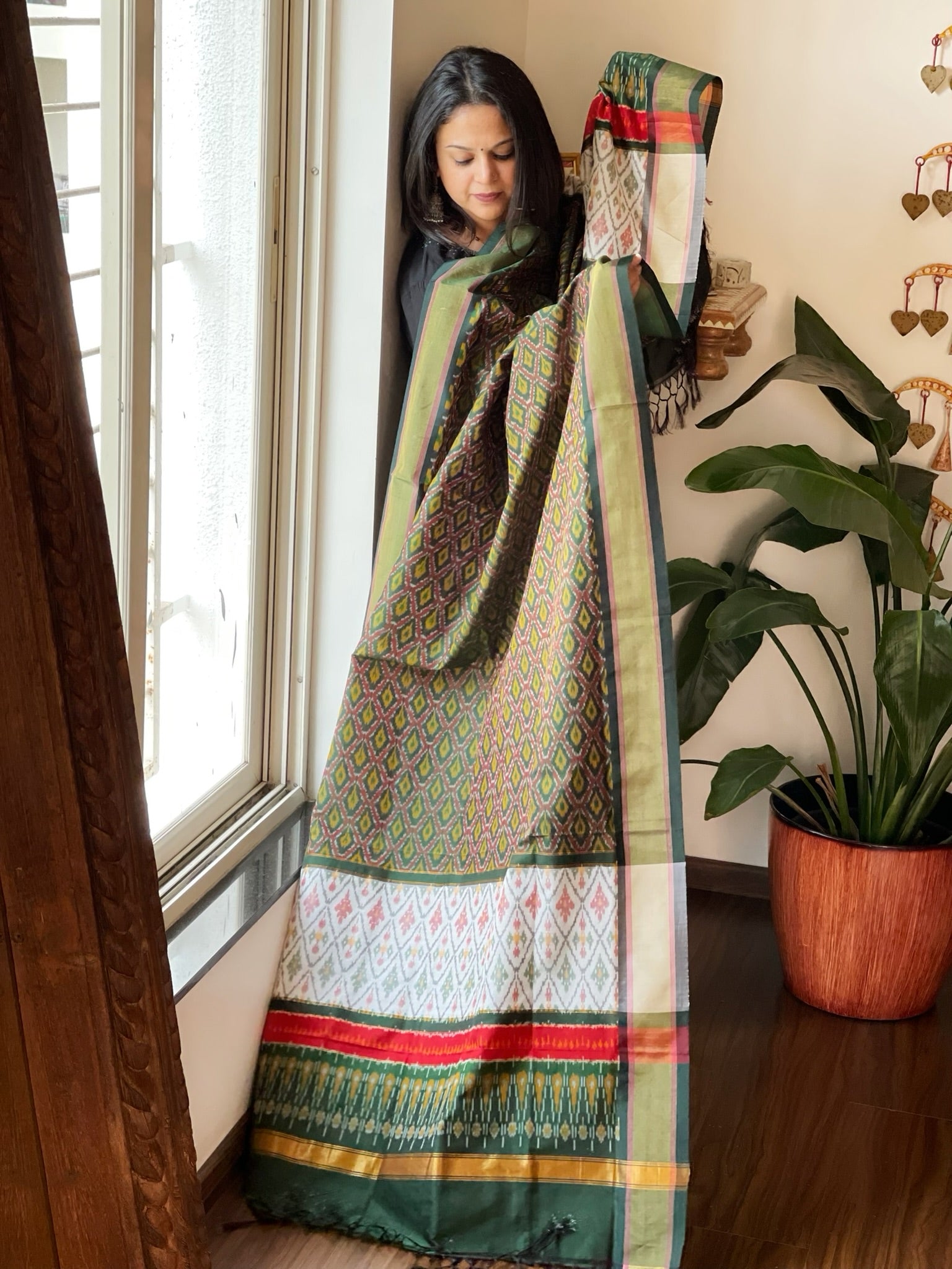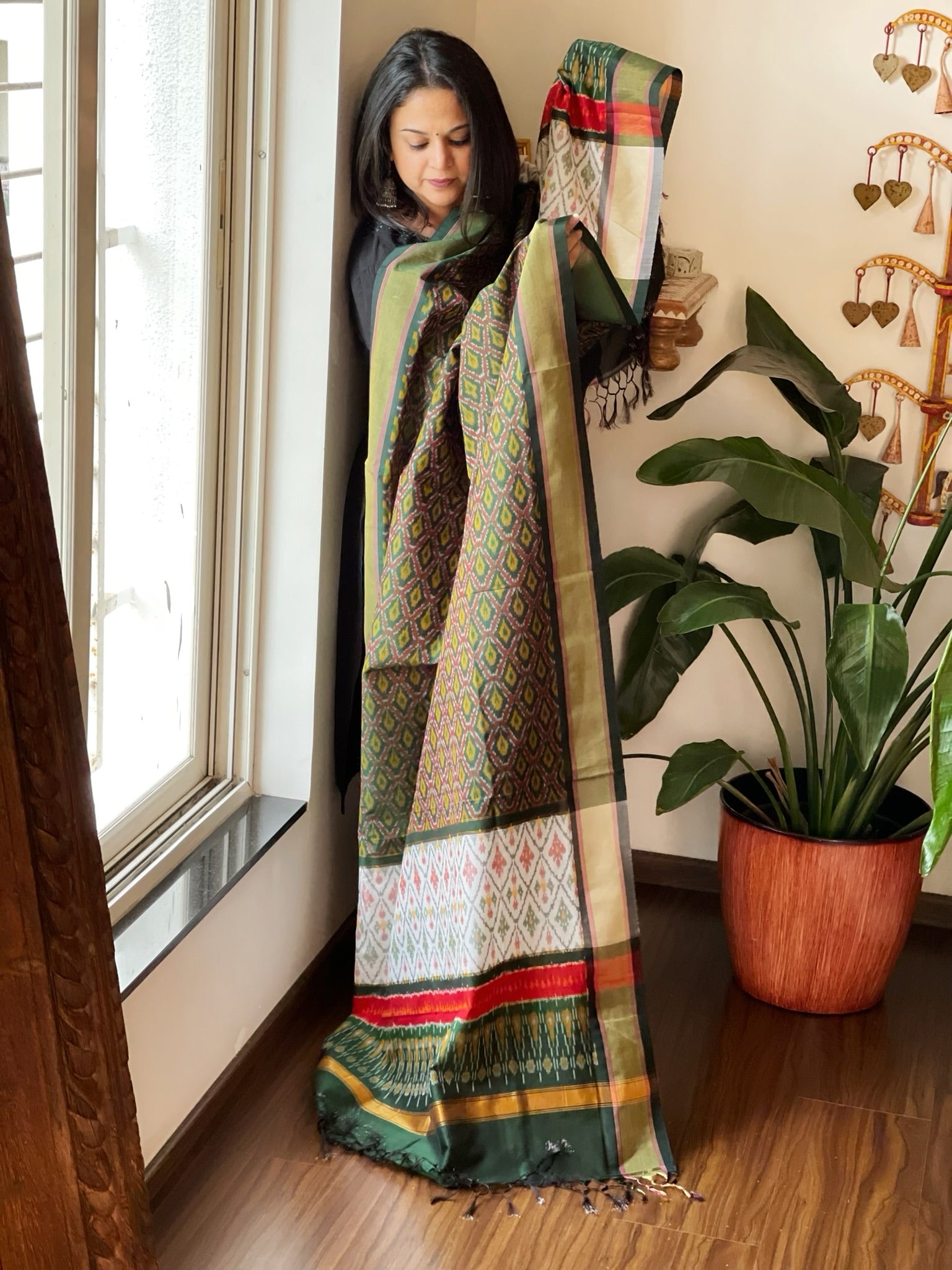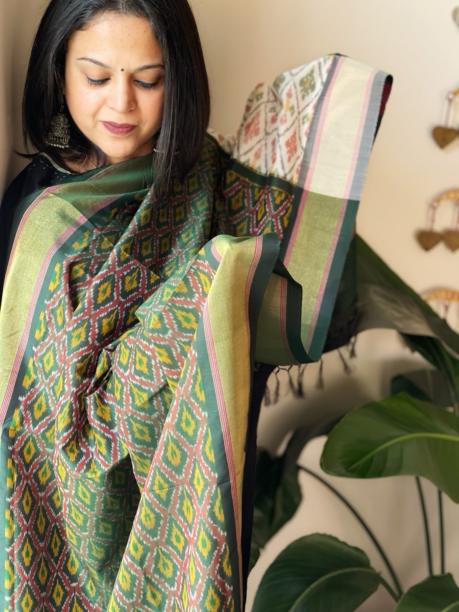 Expertly crafted with a blend of pure silk and cotton, this handwoven Ikat Dupatta exudes elegance and versatility. The authentic design showcases the traditional art of Ikat.