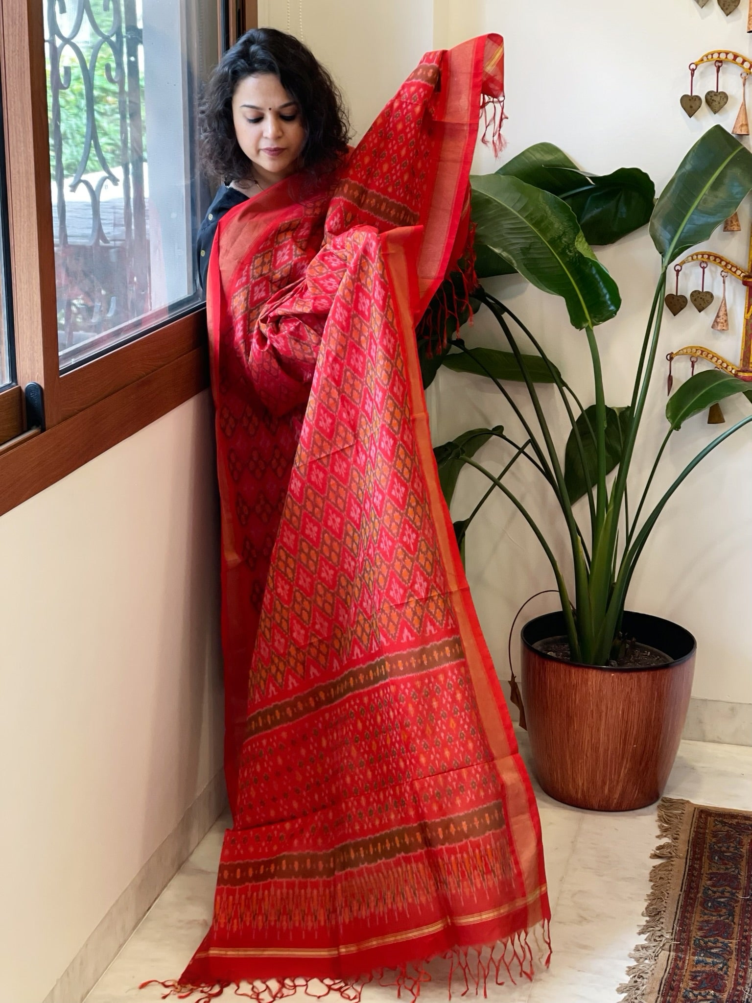 Expertly crafted with a blend of pure silk and cotton, this handwoven Ikat Dupatta exudes elegance and versatility. The authentic design showcases the traditional art of Ikat.