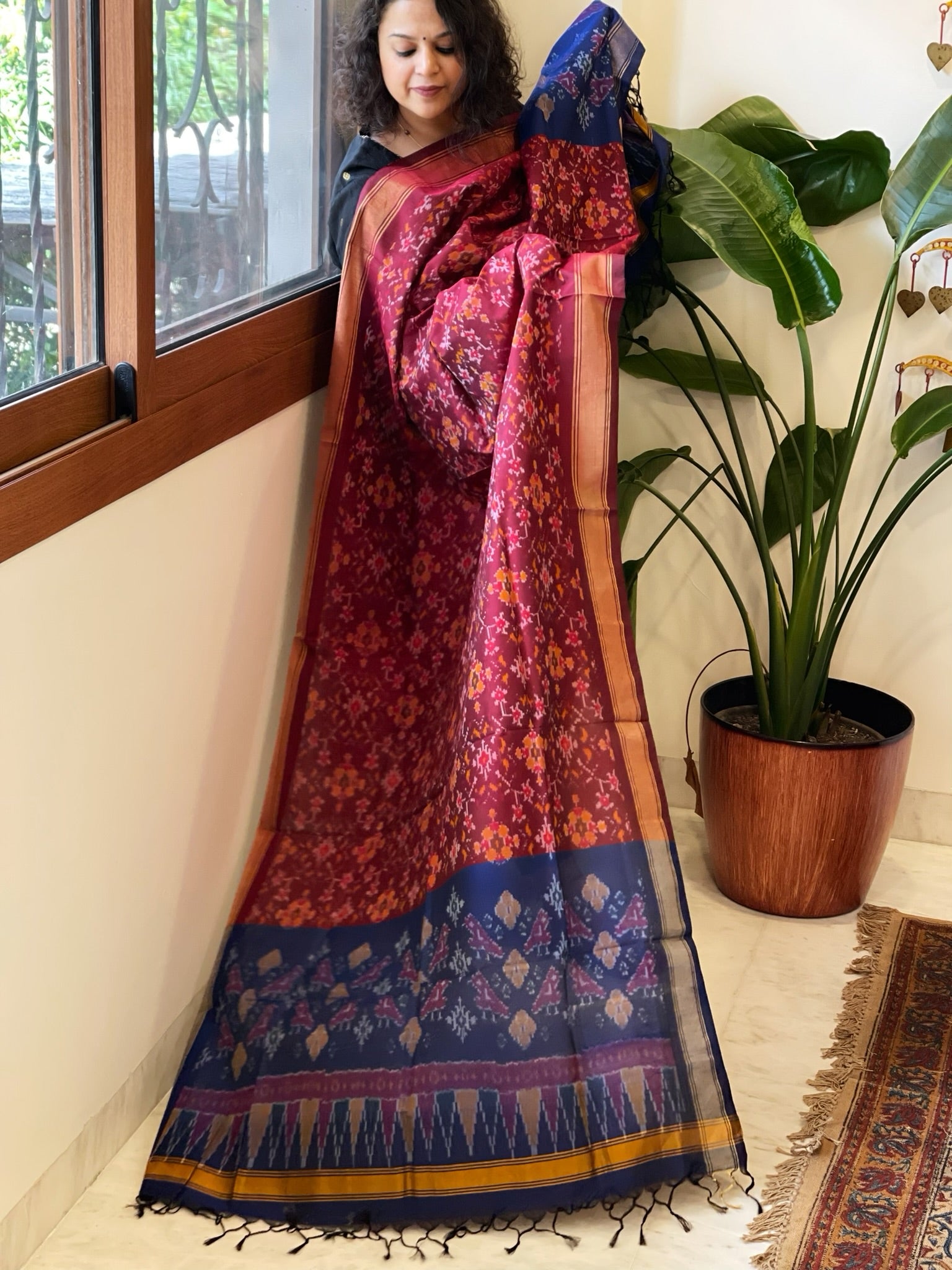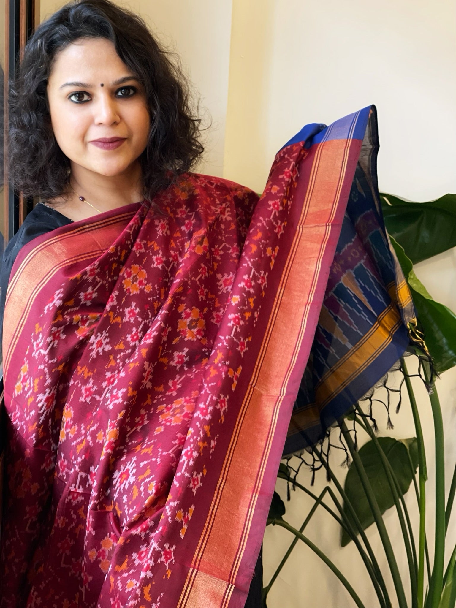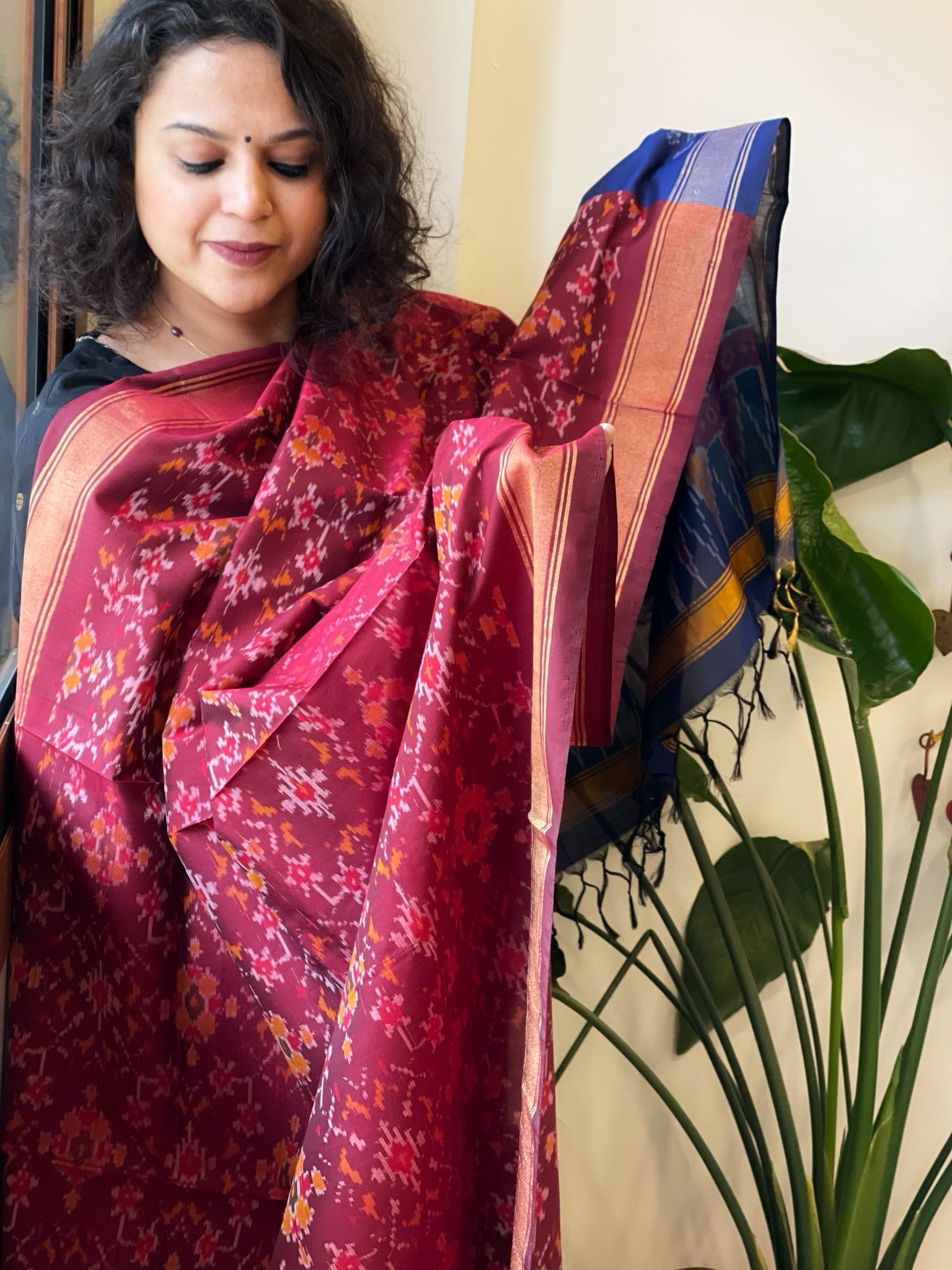 Maroon, Blue Handwoven Ikat Dupatta Pure Silk-Cotton