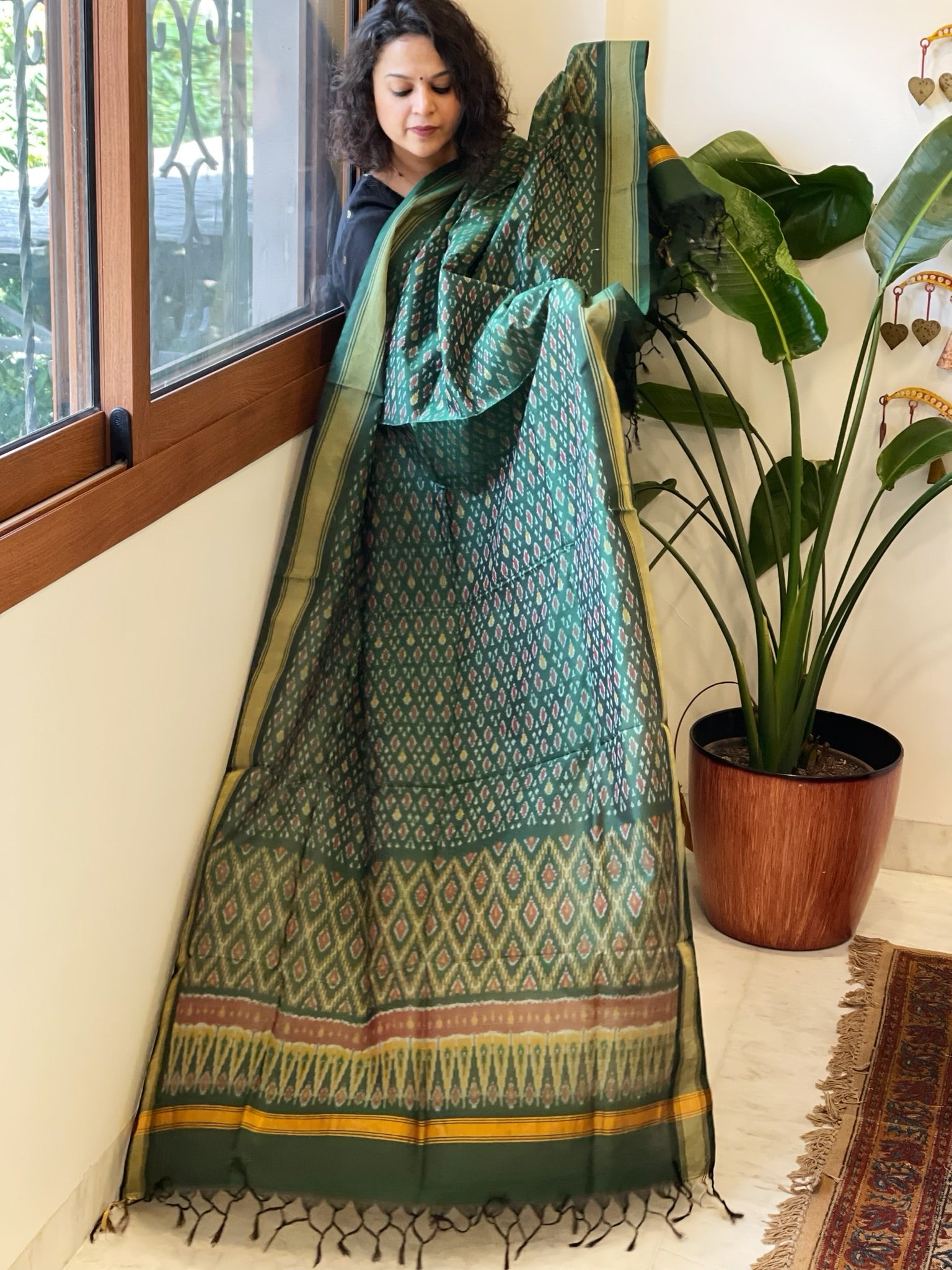 Teal Green Handwoven Ikat Dupatta Pure Silk-Cotton