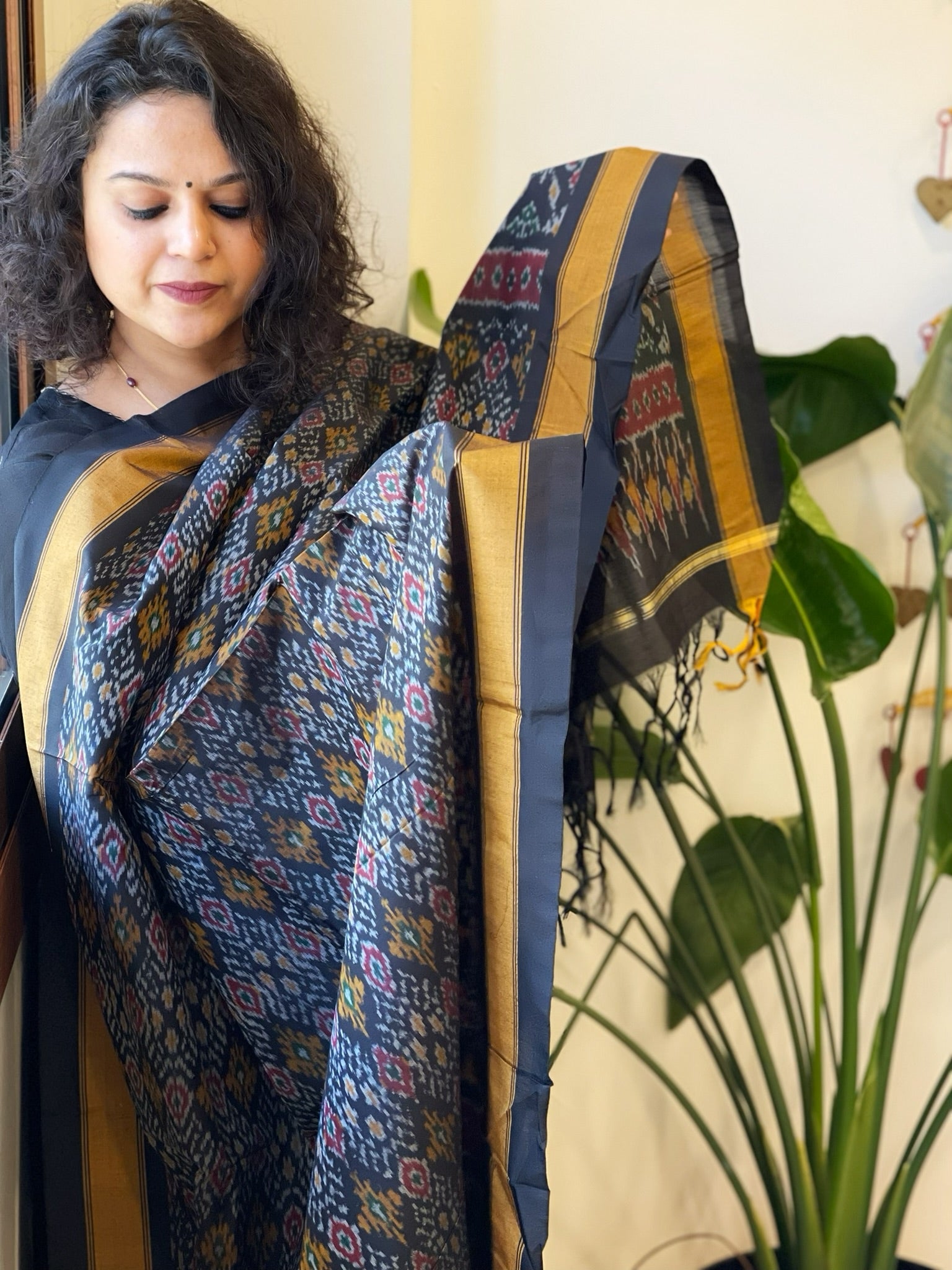 Expertly crafted with a blend of pure silk and cotton, this handwoven Ikat Dupatta exudes elegance and versatility. The authentic design showcases the traditional art of Ikat.