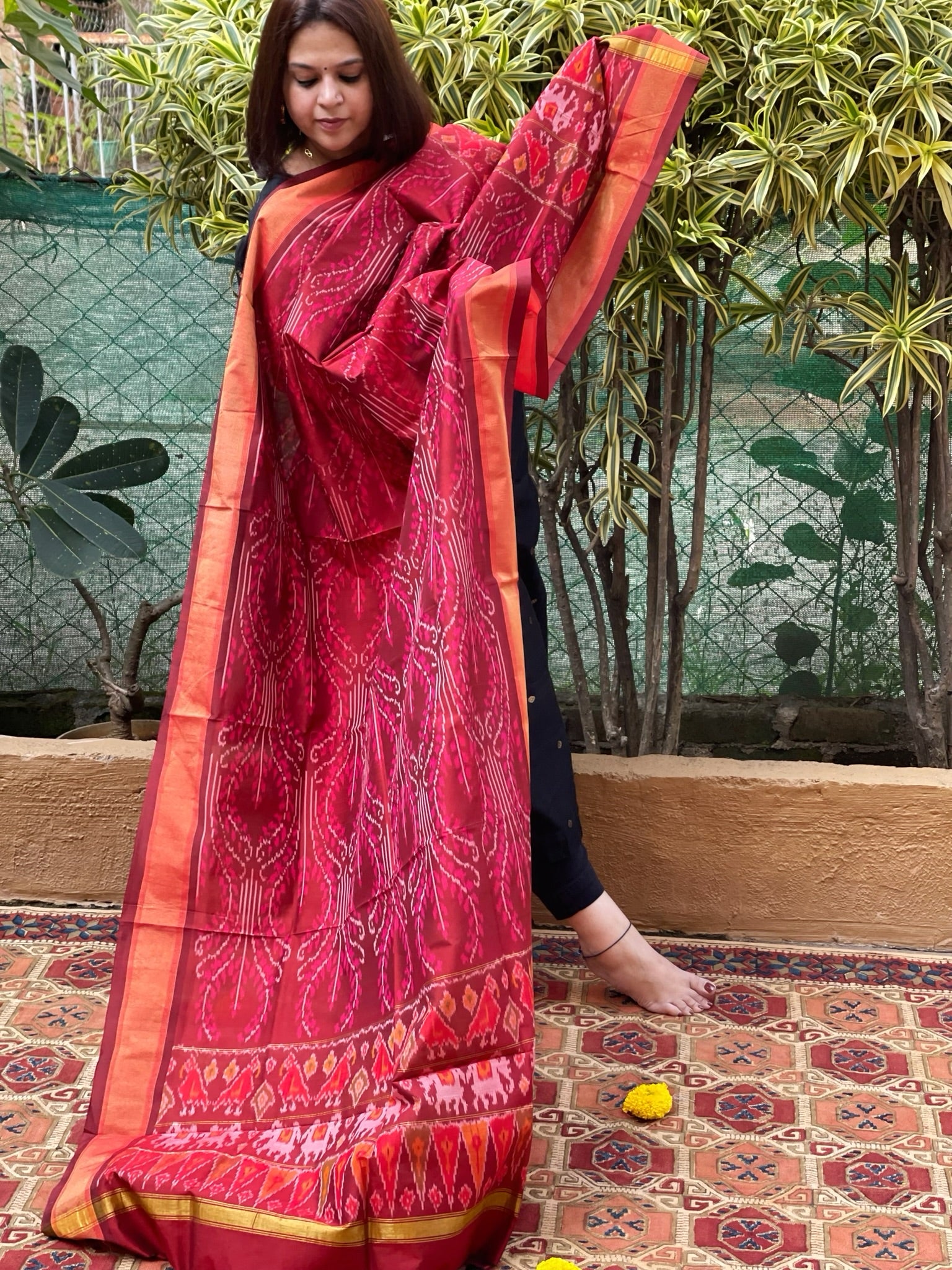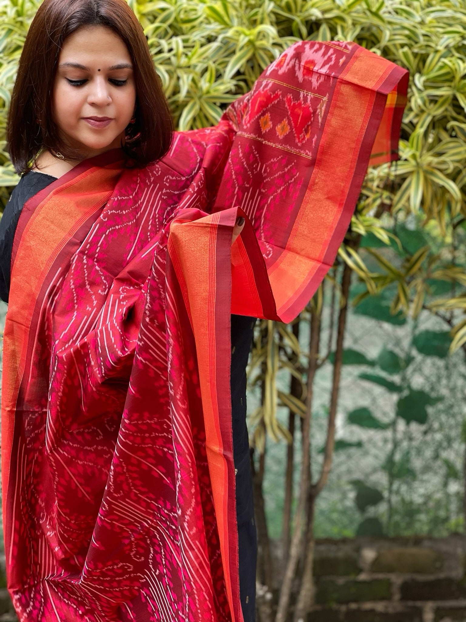 Expertly crafted with a blend of pure silk and cotton, this handwoven Ikat Dupatta exudes elegance and versatility. The authentic design showcases the traditional art of Ikat.