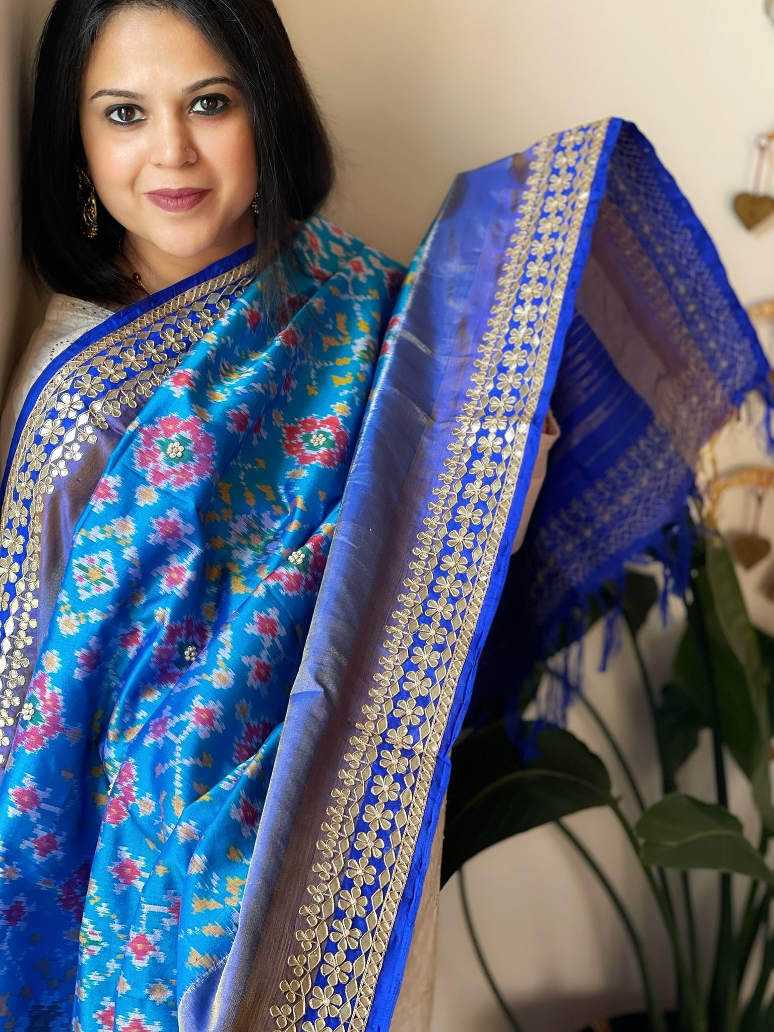 Blue Handwoven Ikat Patola with Gotapatti & Pearl Handwork dupatta in Pure Silk