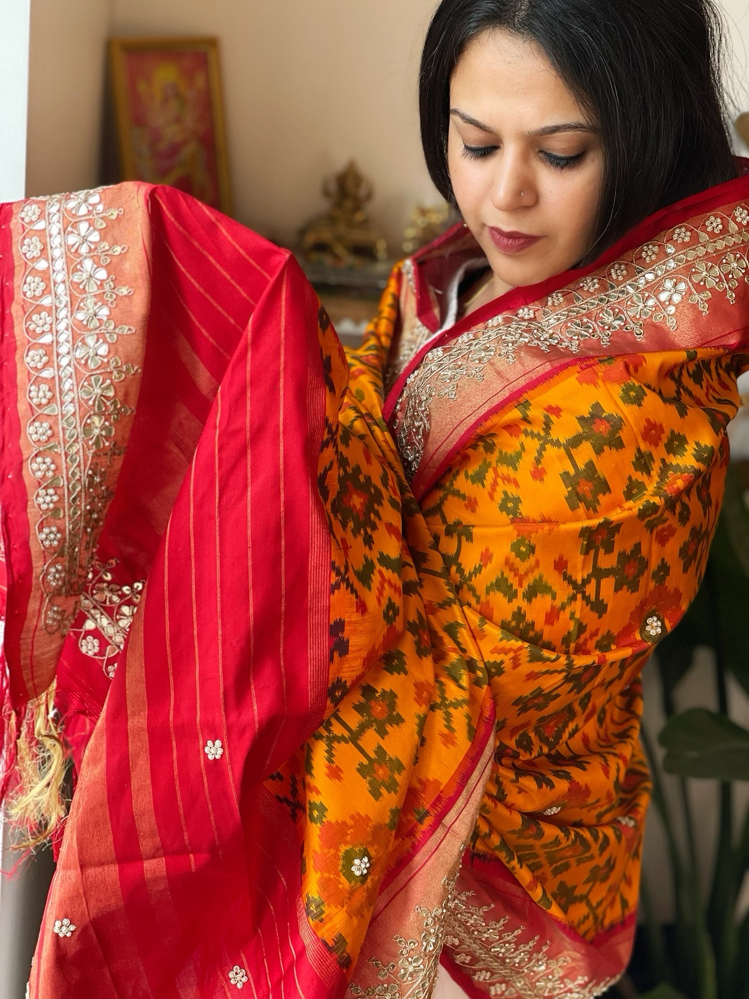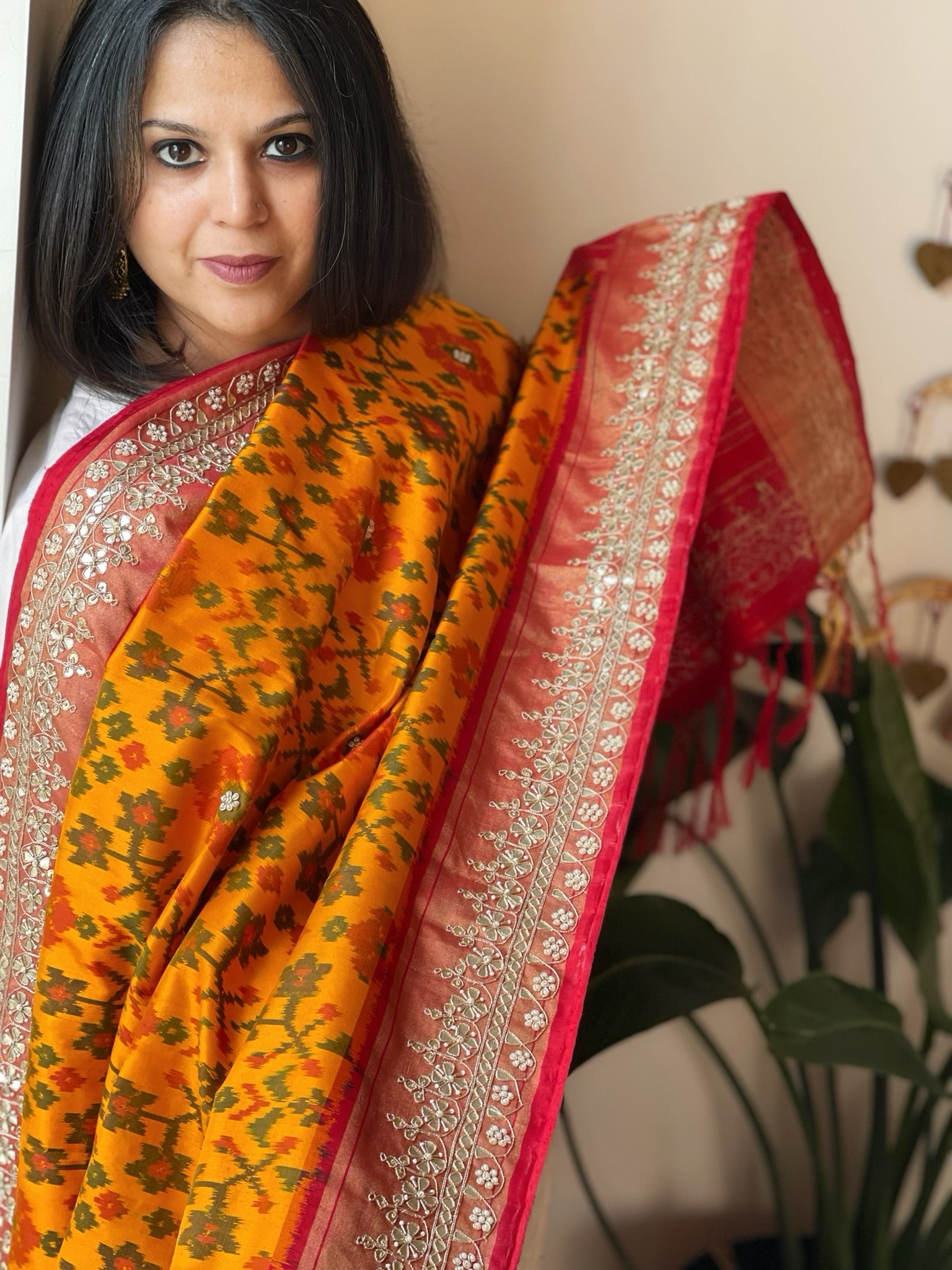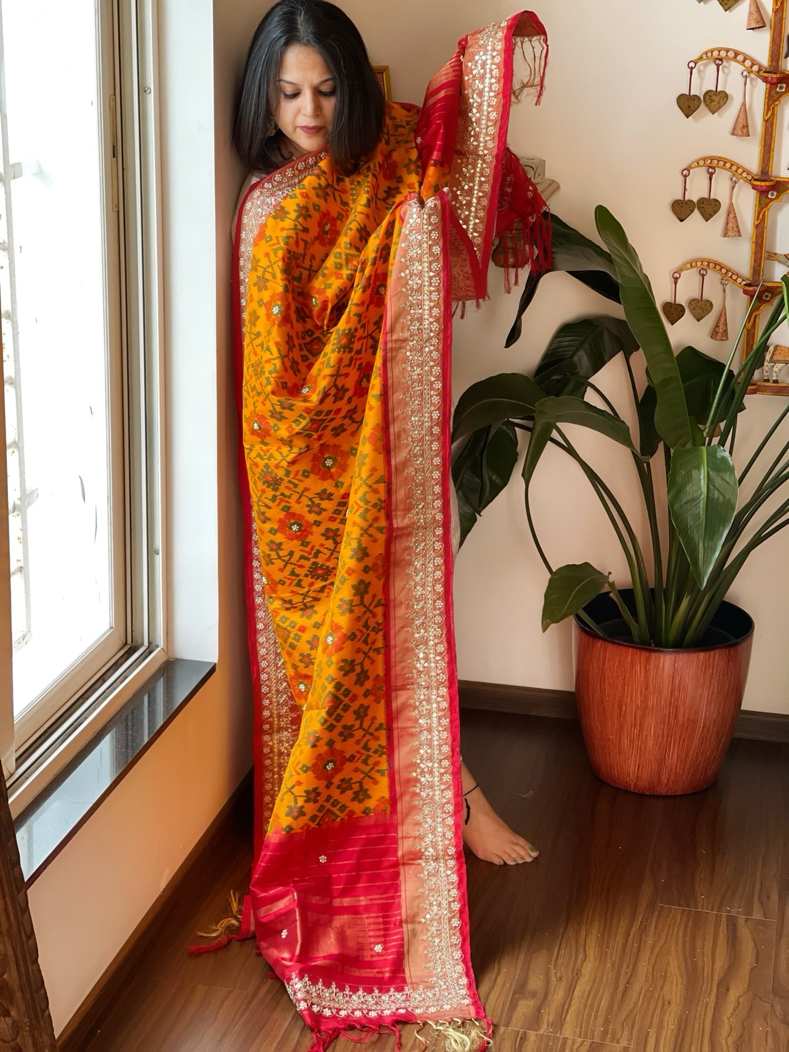 Yellow Handwoven Ikat Patola with Gotapatti & Pearl Handwork dupatta in Pure Silk