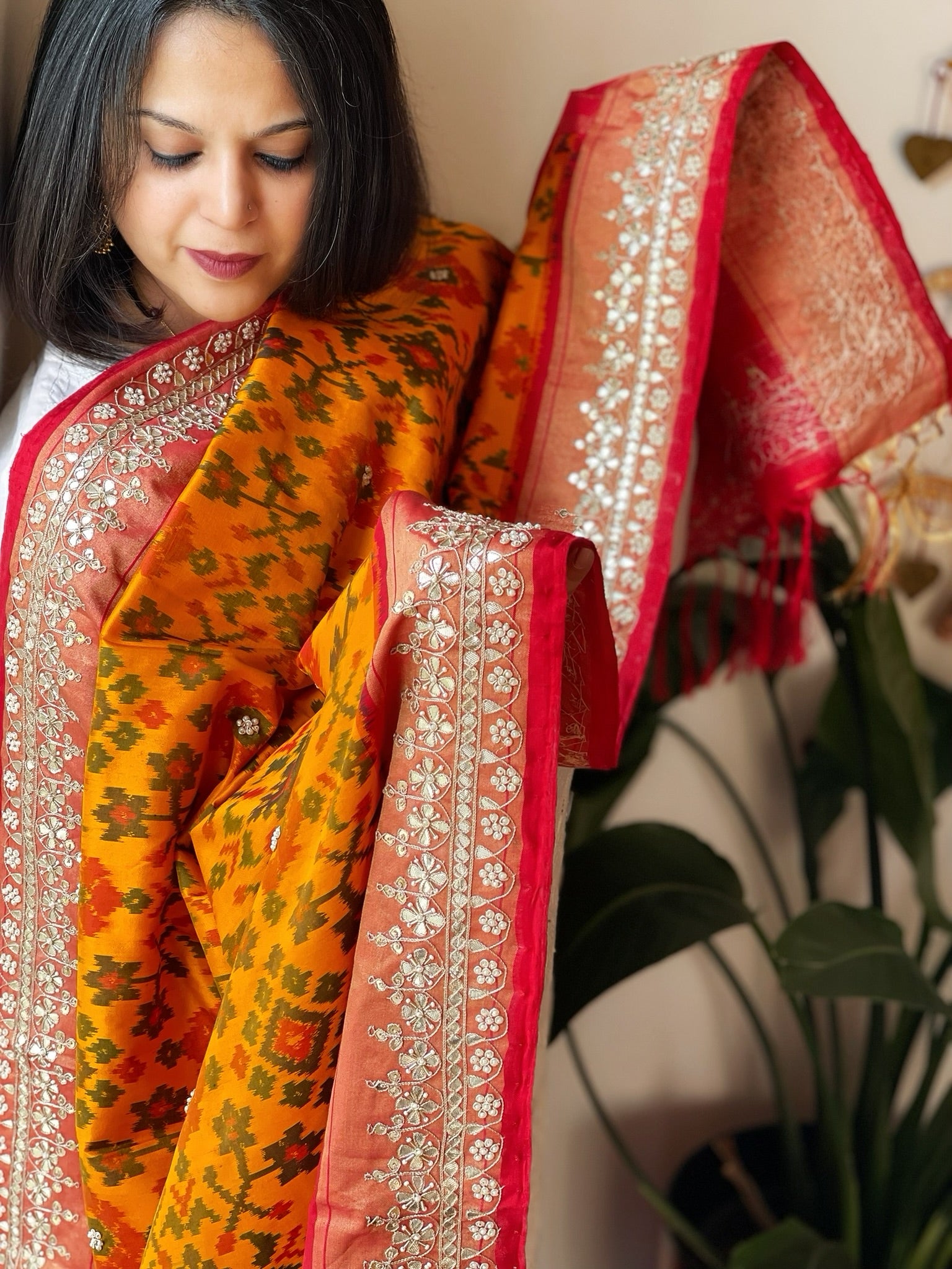 Expertly crafted with traditional Indian craftsmanship, this Handwoven Ikat Patola Dupatta is made of pure silk and features intricate gotapatti handwork. Its exclusive design and authentic quality make it a must-have for any wardrobe. Elevate your style with this stunning piece.