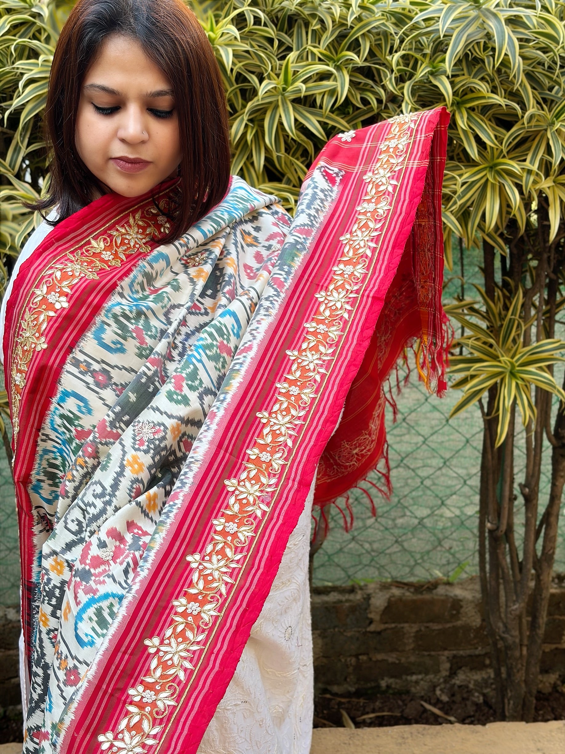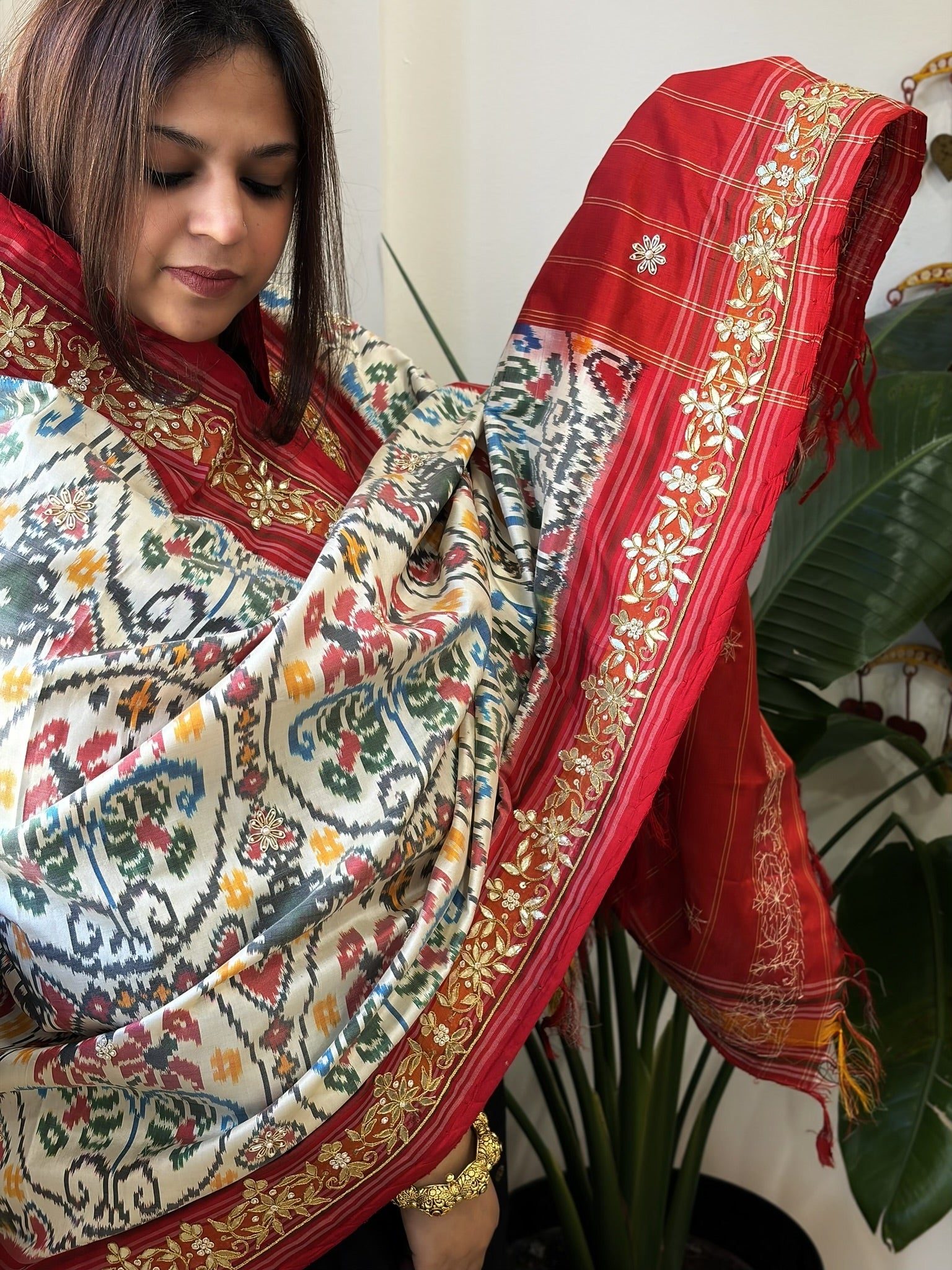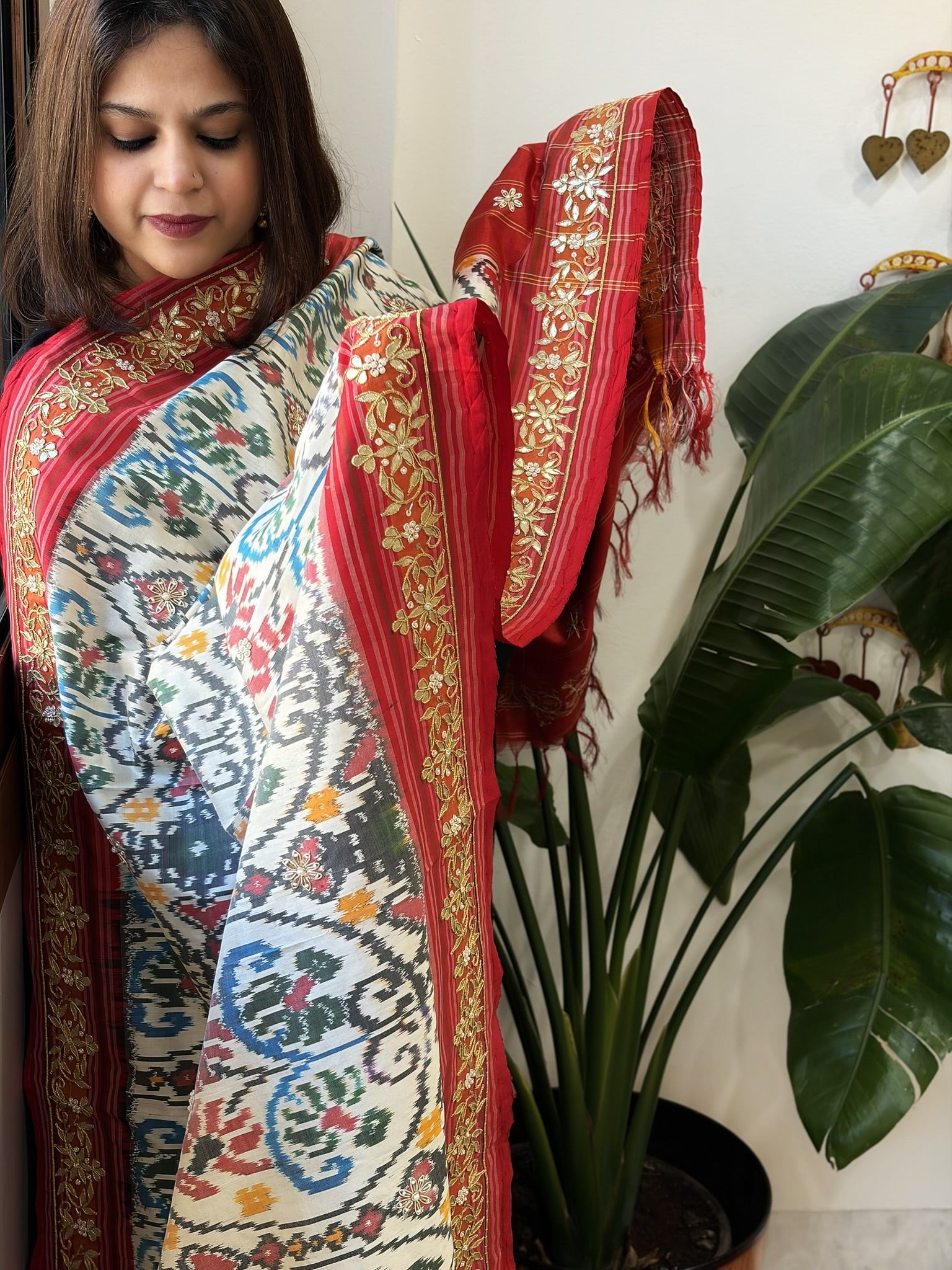 Ivory Handwoven Ikat Patola with Gotapatti & Pearl Handwork dupatta in Pure Silk