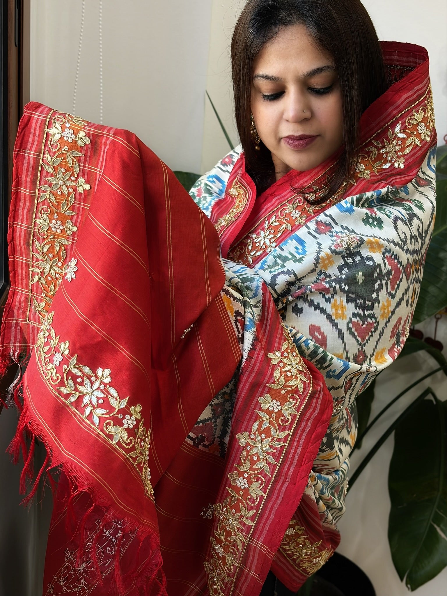 Expertly crafted with traditional Indian craftsmanship, this Handwoven Ikat Patola Dupatta is made of pure silk and features intricate gotapatti handwork. Its exclusive design and authentic quality make it a must-have for any wardrobe. Elevate your style with this stunning piece.
