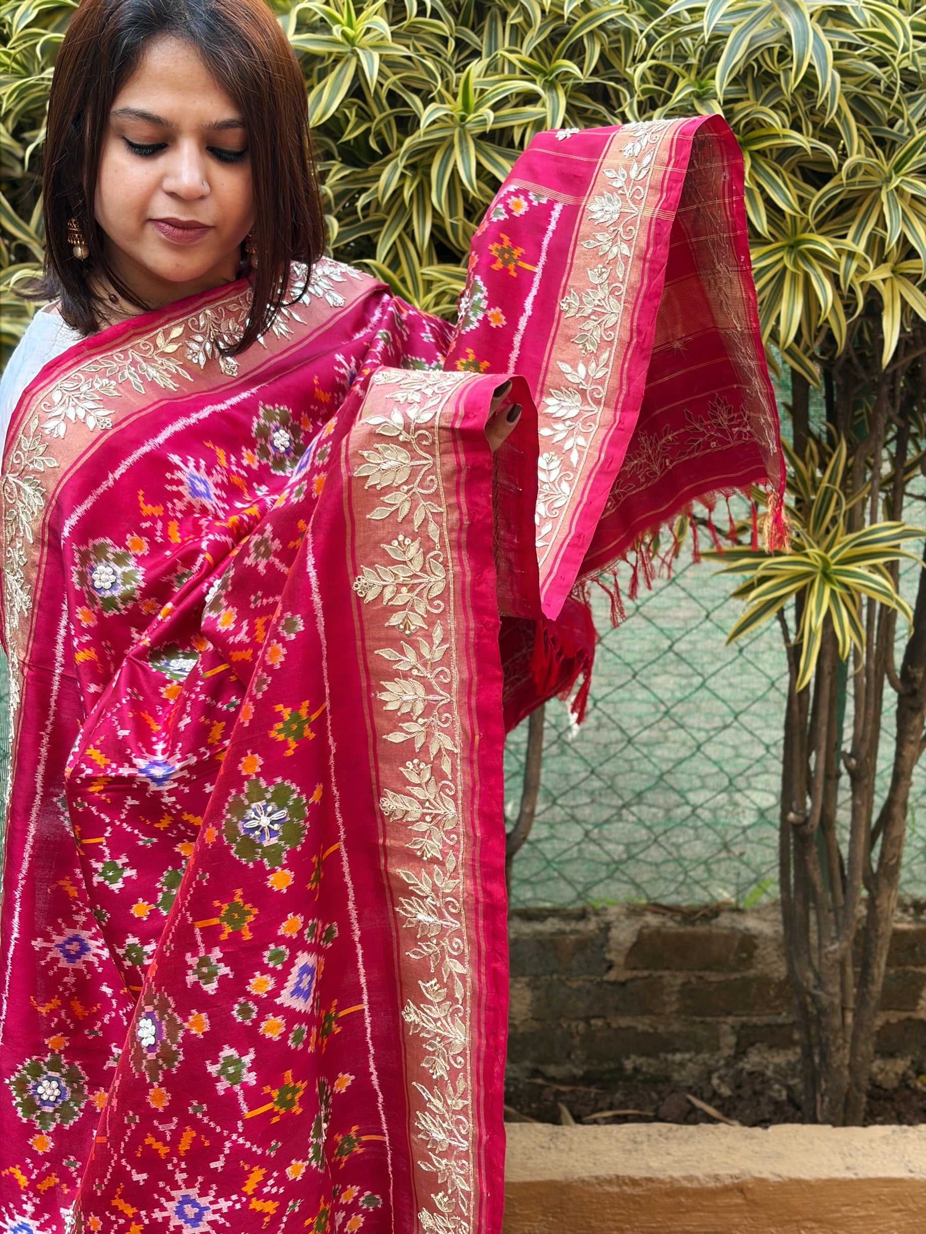Pink Handwoven Ikat Patola with Gotapatti & Pearl Handwork dupatta in Pure Silk
