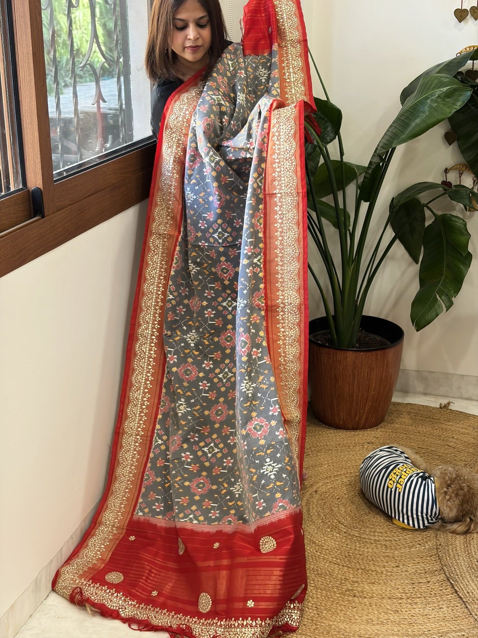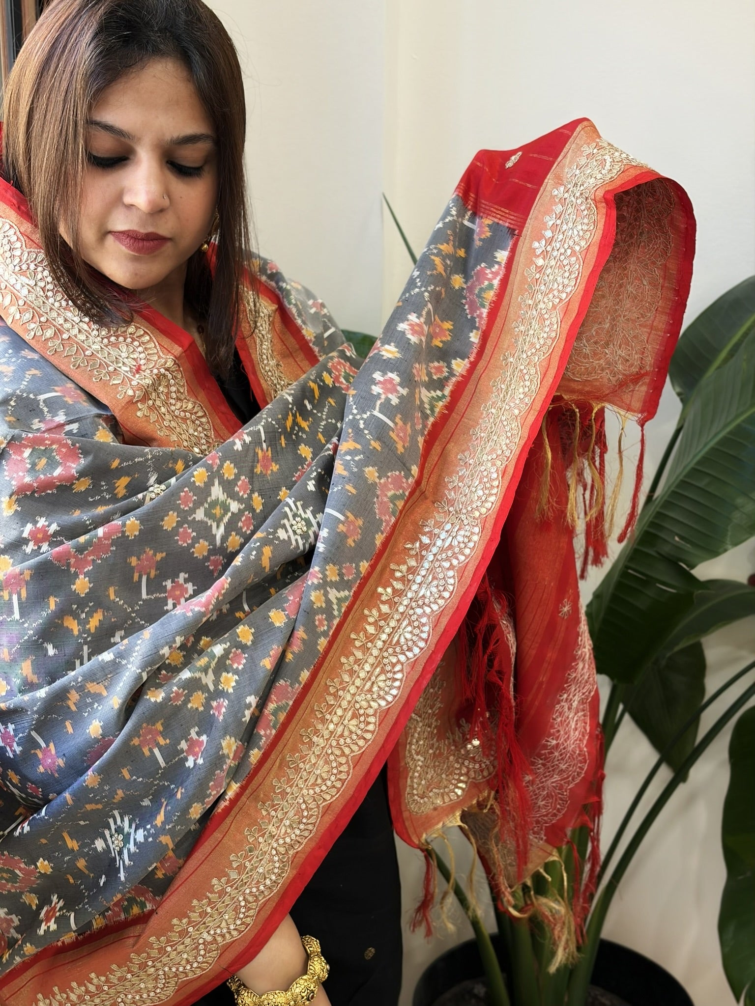 Expertly crafted with traditional Indian craftsmanship, this Handwoven Ikat Patola Dupatta is made of pure silk and features intricate gotapatti handwork. Its exclusive design and authentic quality make it a must-have for any wardrobe. Elevate your style with this stunning piece.