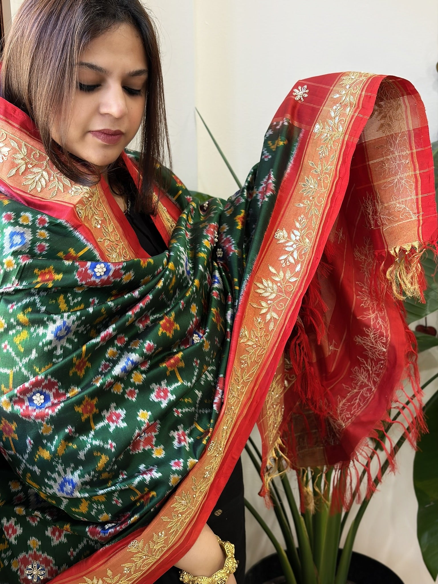 Green Handwoven Ikat Patola with Gotapatti & Pearl Handwork dupatta in Pure Silk