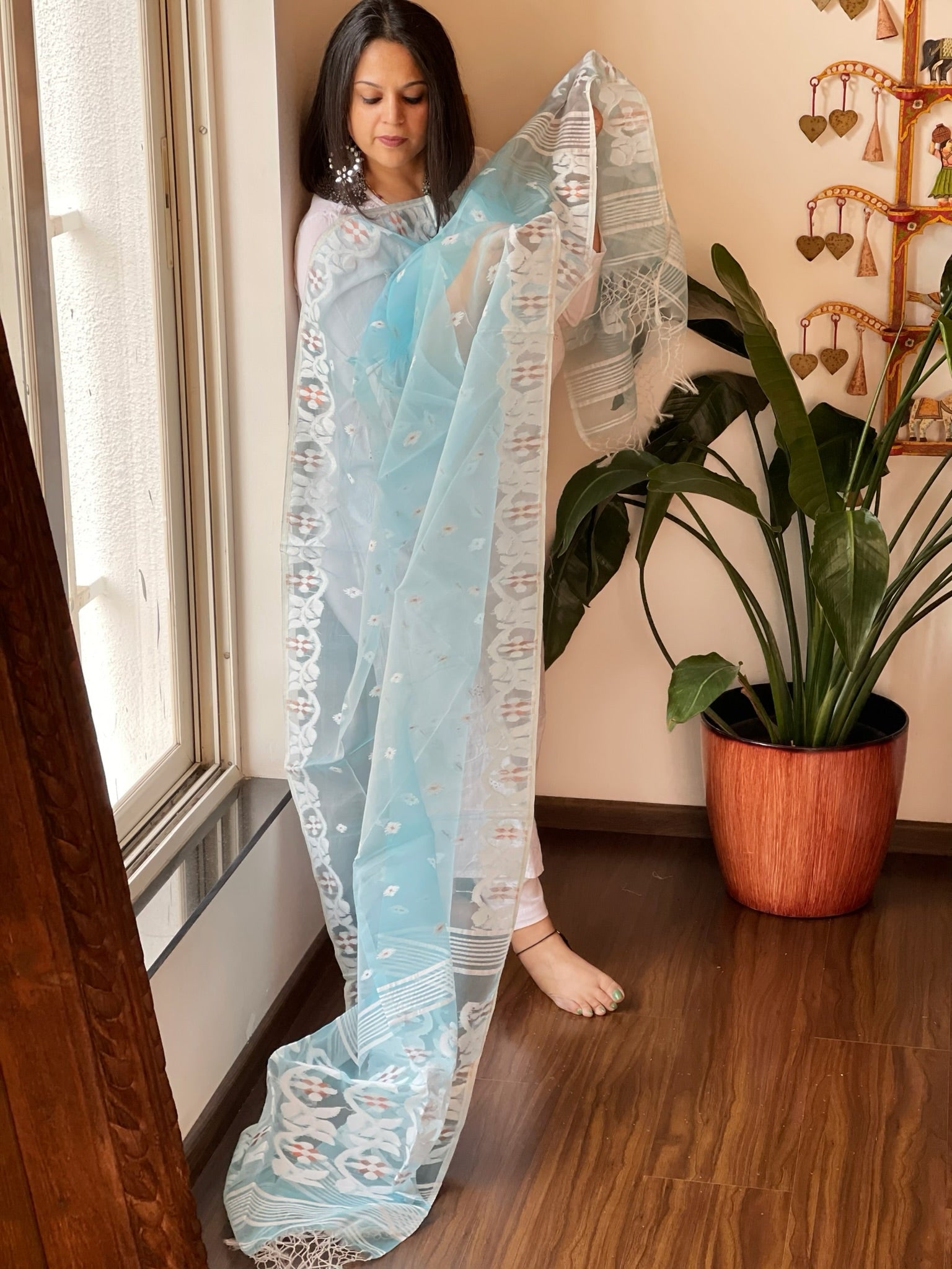 Lite Aqua Blue Handwoven Jamdani Dupatta in Pure Muslin