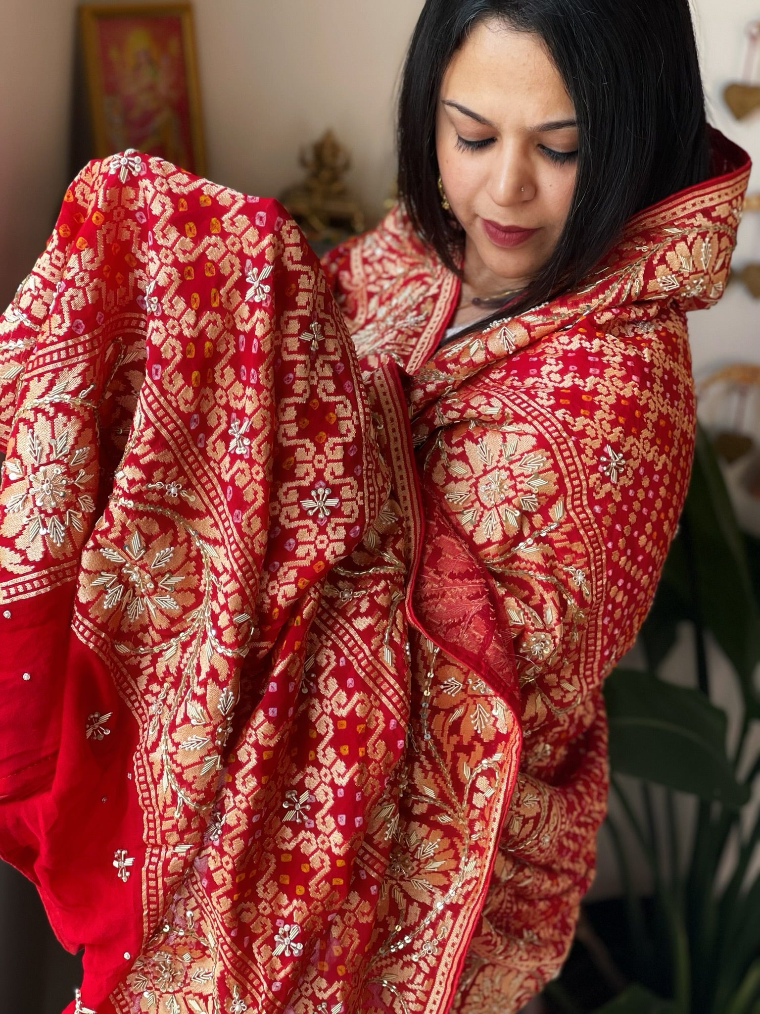 This timeless pure georgette dupatta features intricate handwoven neemzari bareek bandhani and delicate dabka and pearl handwork, making it the perfect addition to any Indian wedding ensemble.