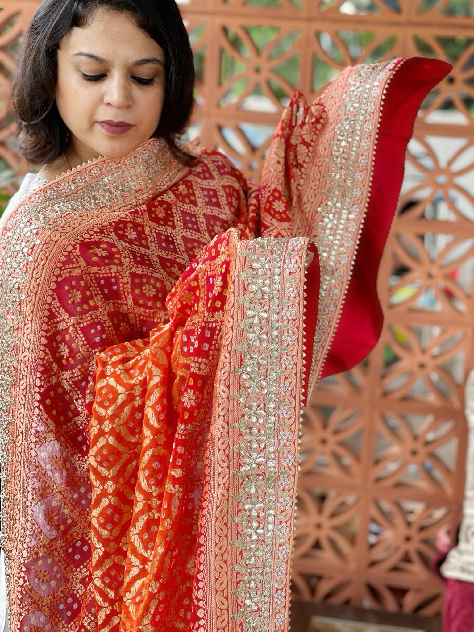 This timeless pure georgette dupatta features intricate handwoven neemzari bareek bandhani and delicate gotapatti handwork, making it the perfect addition to any Indian wedding ensemble.