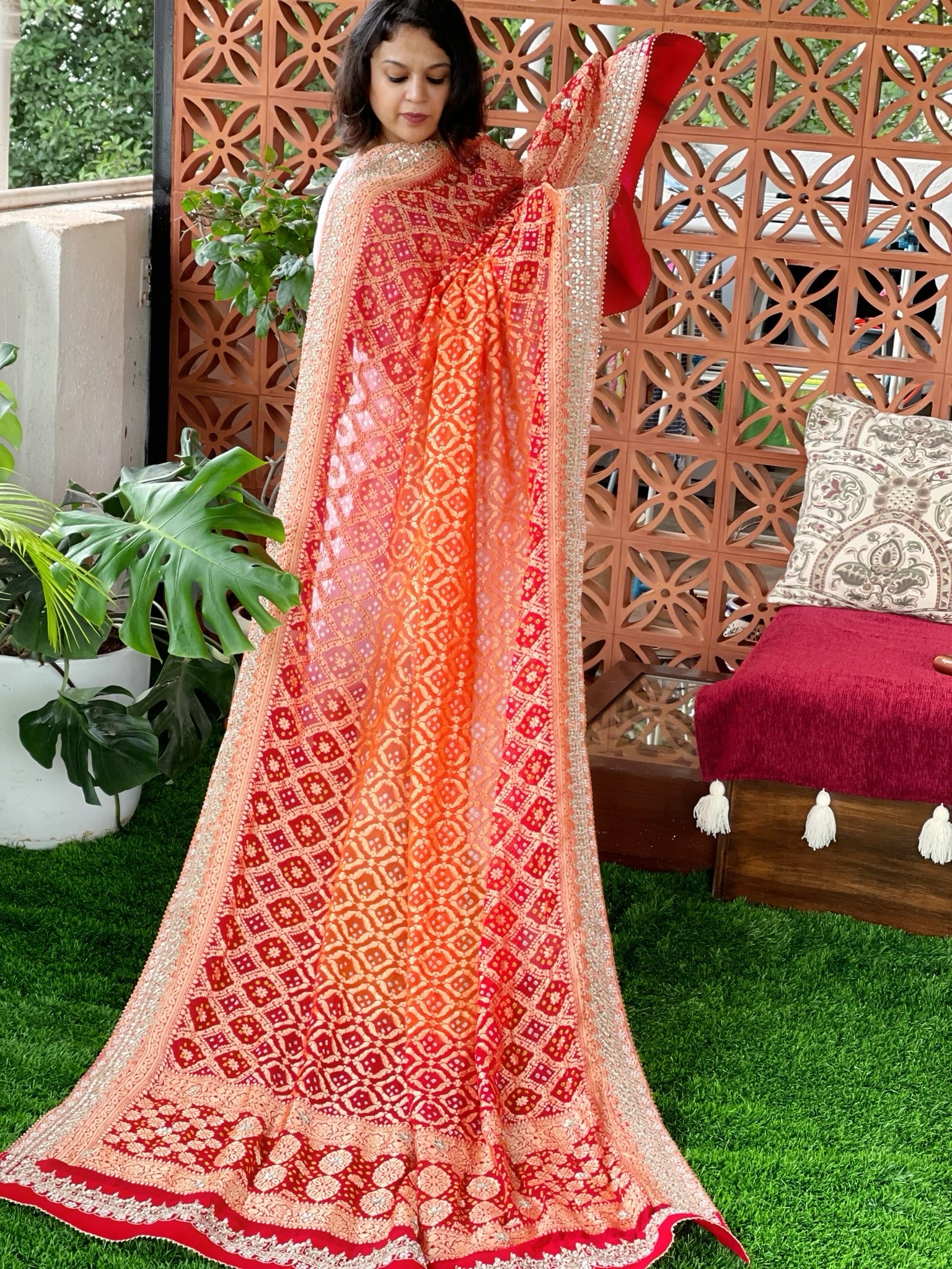 Red, Orange Handwoven NeemZari Bareek Bandhani with Gotapatti Handwork in Pure Georgette