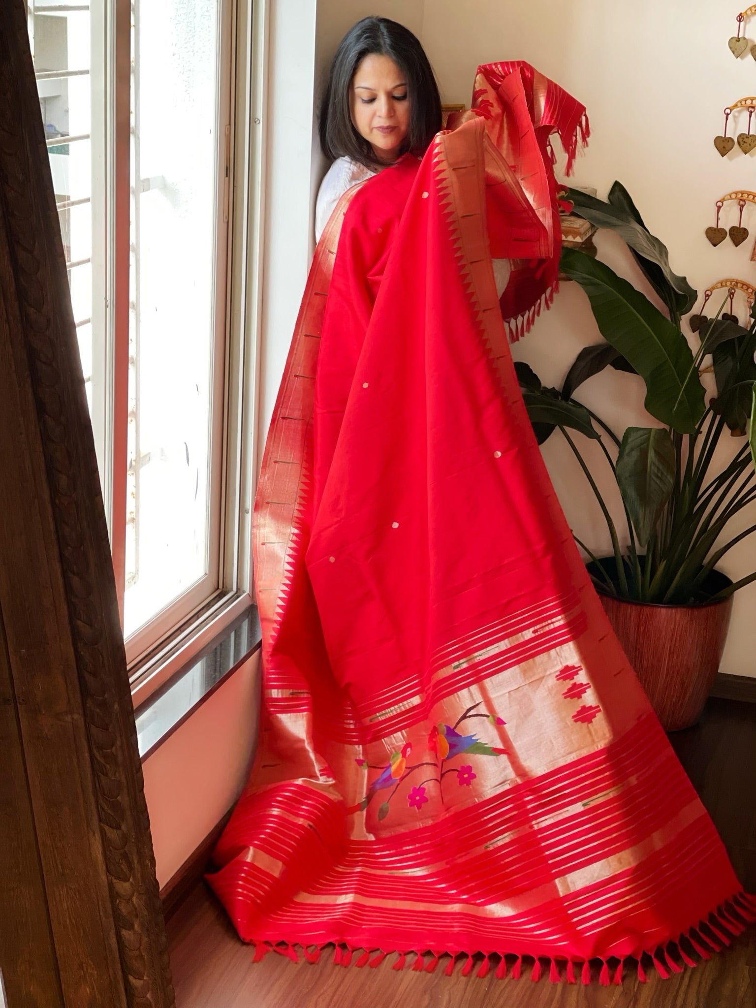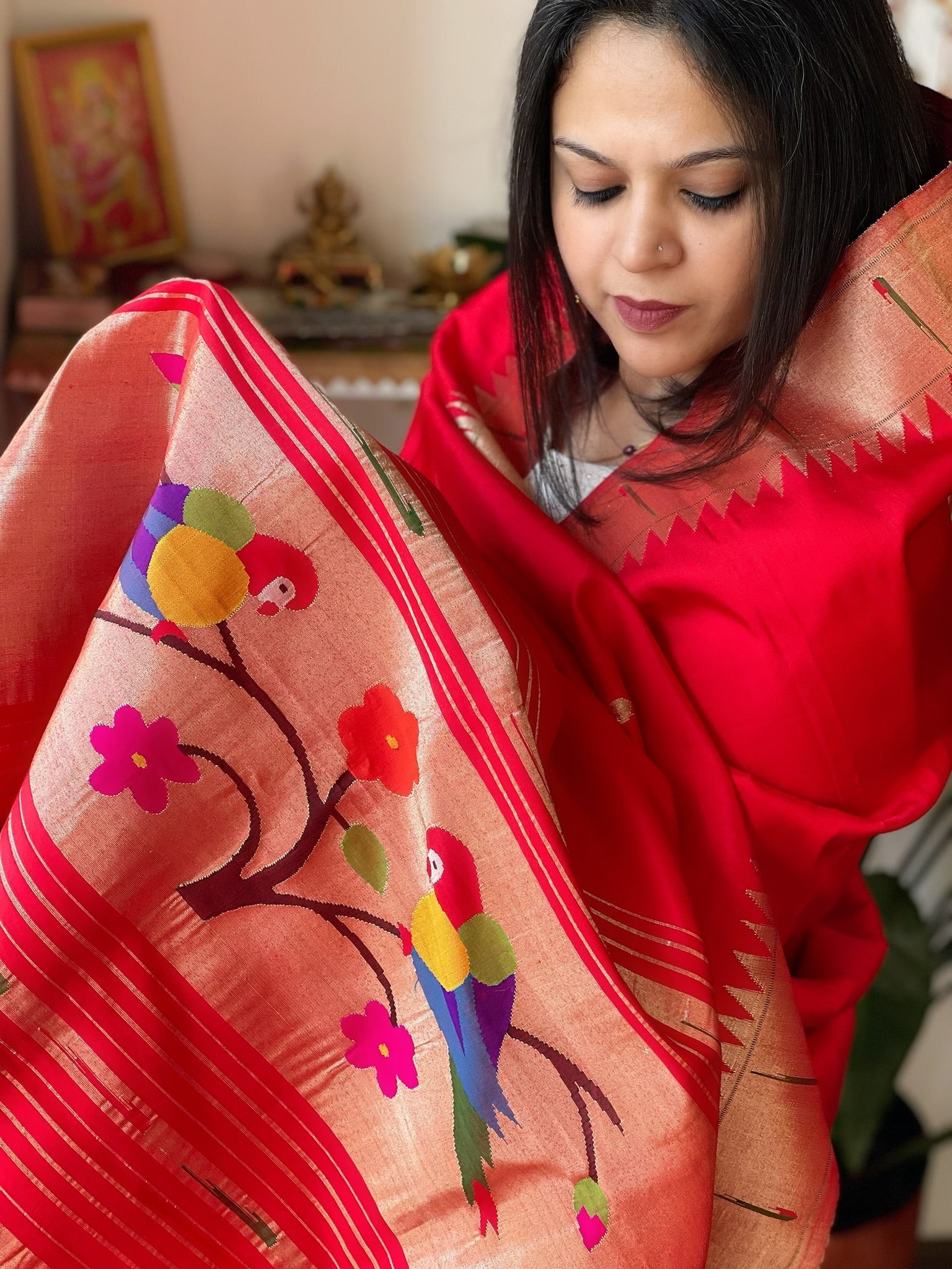 Expertly handwoven in pure silk, Masakalee's Paithani Dupatta showcases the exquisite craft of Maharashtra. With its luxurious texture and traditional design, it is the perfect addition to elevate any outfit. Experience the rich heritage and quality of this masterpiece.