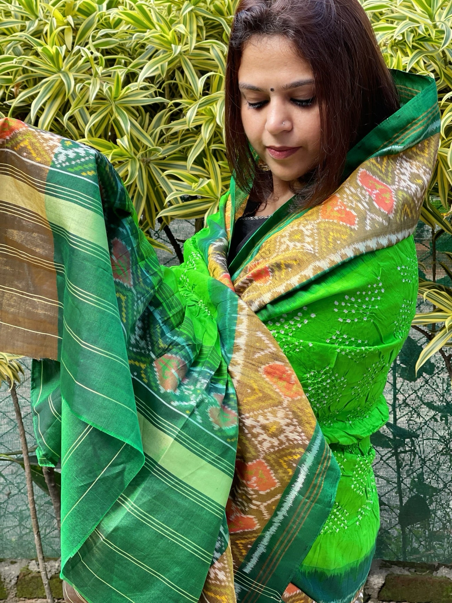 Parrot Green, Dark Green Handwoven Patola with Rai Bandhej Dupatta in Pure Silk