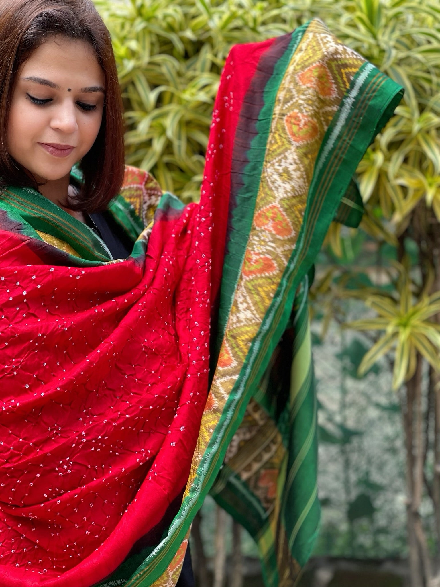 Red, Green Handwoven Patola with Rai Bandhej Dupatta in Pure Silk