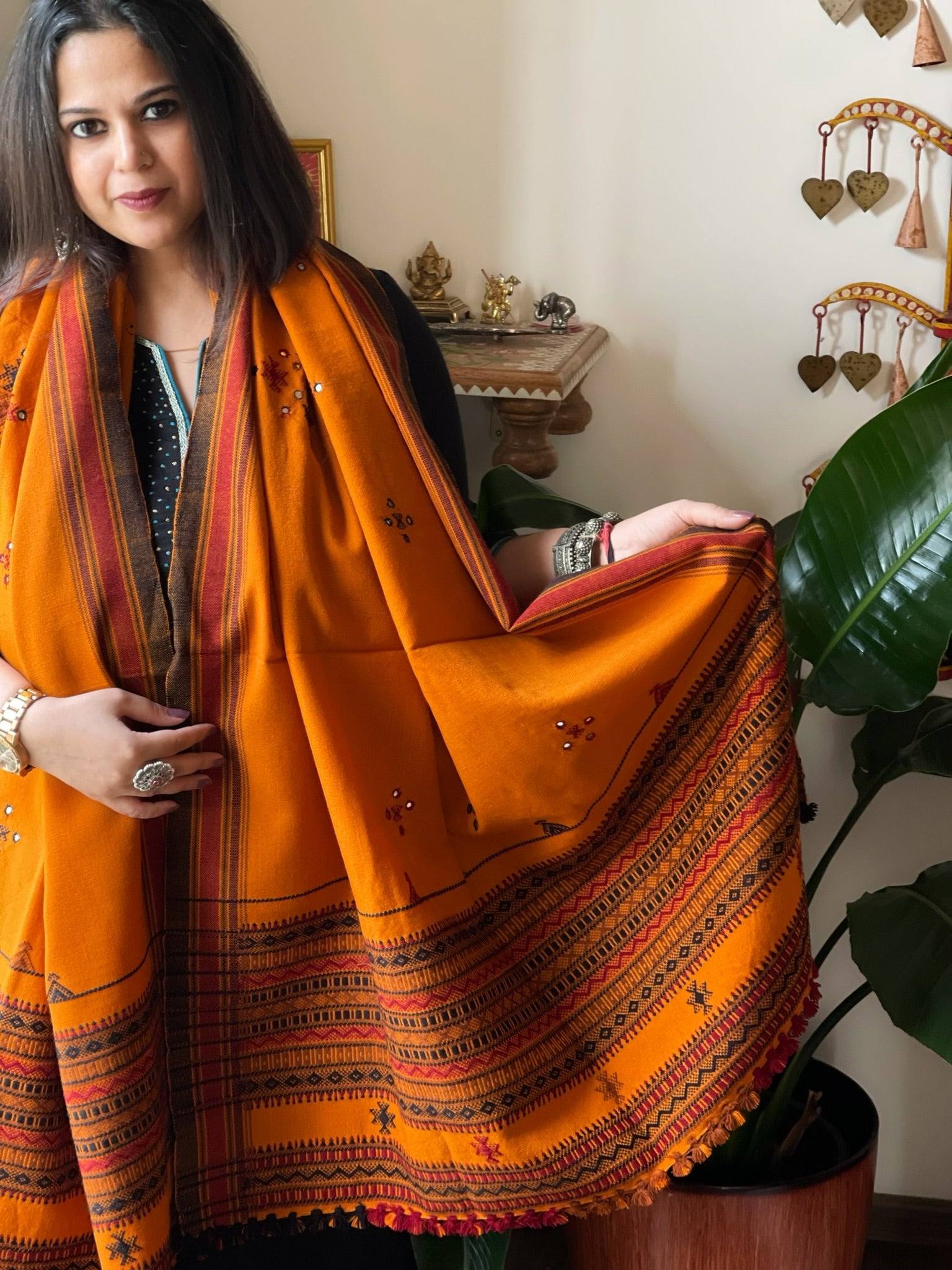 Experience the warmth and beauty of our Handwoven Woollen Shawl! Made with Pure Desi Wool and adorned with intricate Mirror Handwork, it's the perfect addition to your winter wardrobe. Stay cosy and stylish in any weather with this versatile shawl.