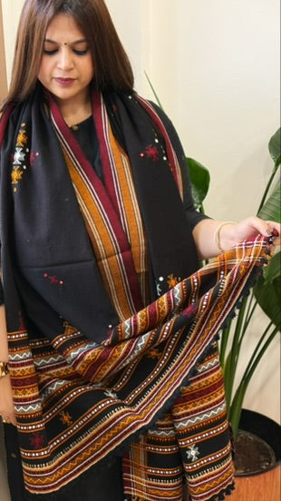 Black Handwoven Woollen Shawl with Mirror Handwork