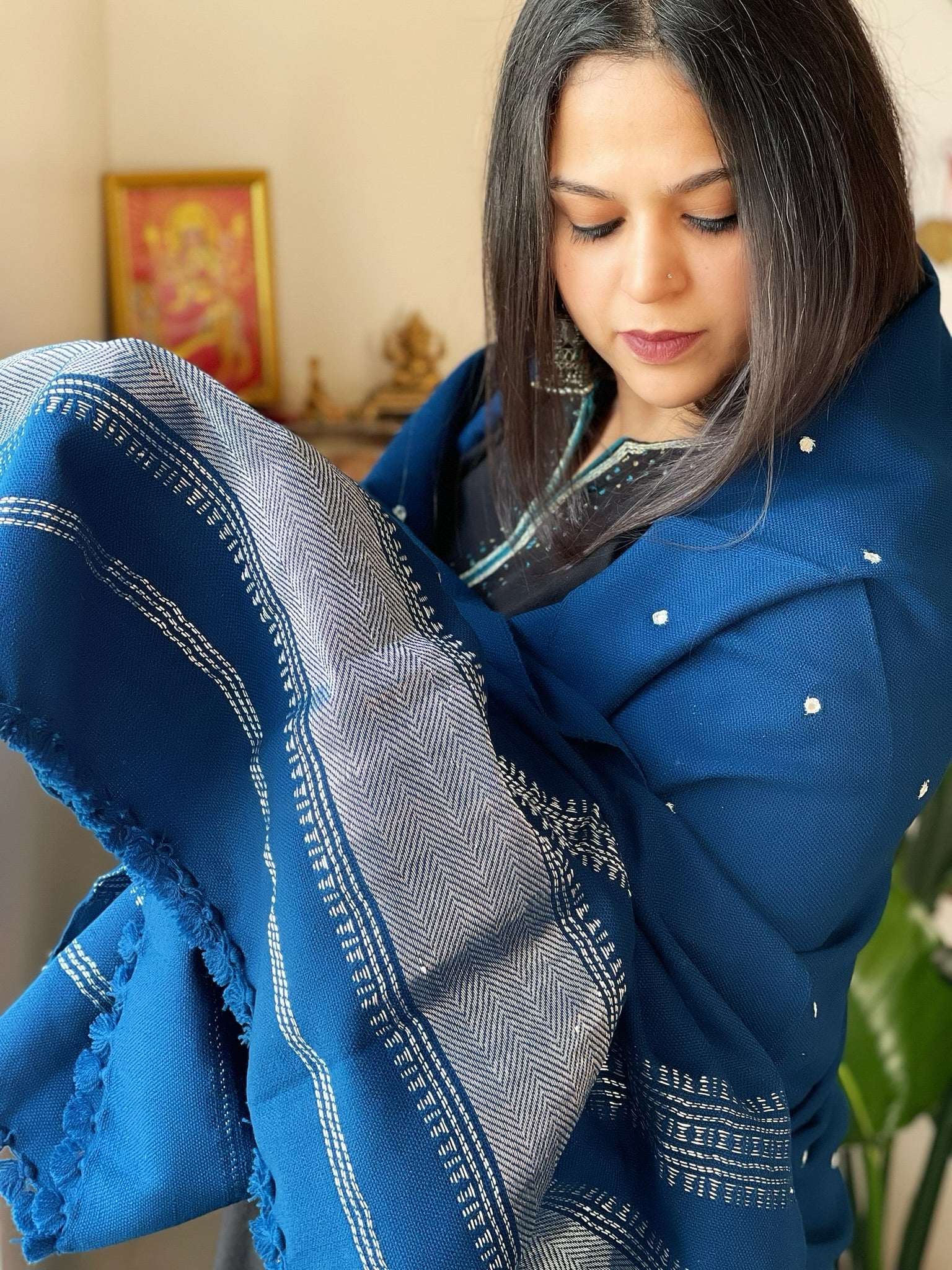 Teal Blue Handwoven Woollen Shawl with Mirror Handwork and Zari Pallu