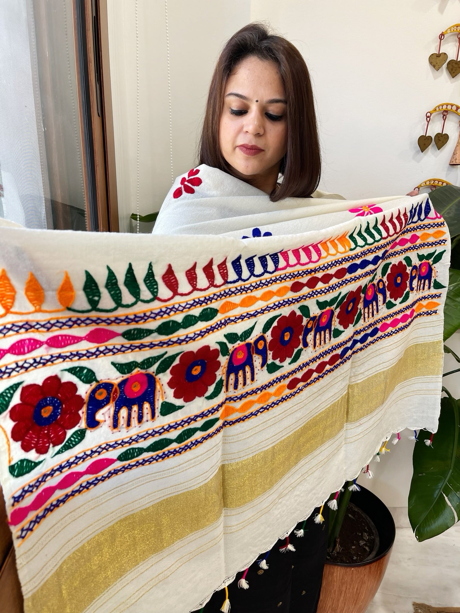 Cream Handwoven Woollen Shawl with Thread and Foil Mirror Handwork