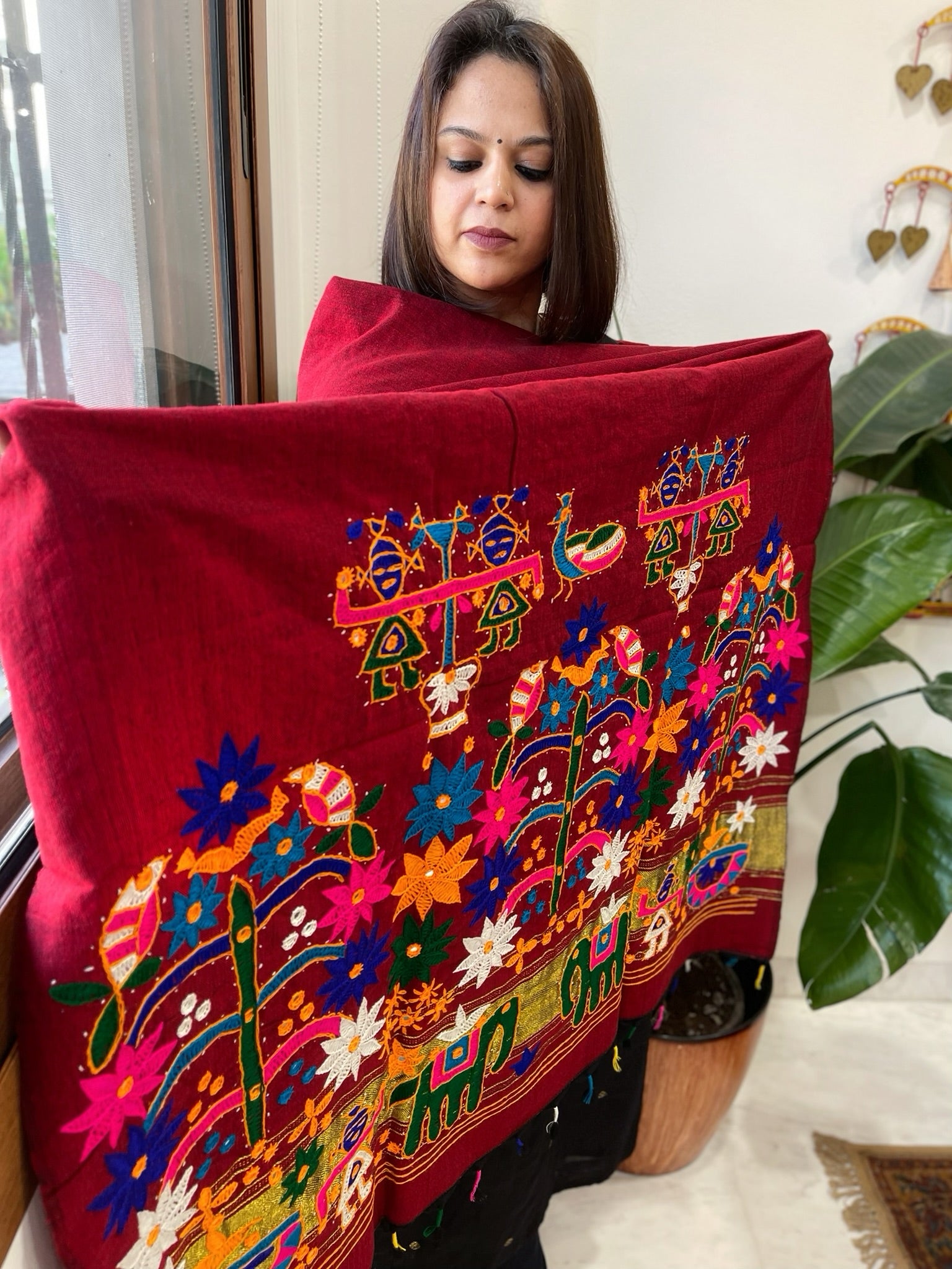Experience the warmth and beauty of our Handwoven Woollen Shawl! Made with Pure Merino Wool and adorned with intricate Foil Mirror and Thread Handwork, it's the perfect addition to your winter wardrobe. Stay cosy and stylish in any weather with this versatile shawl.