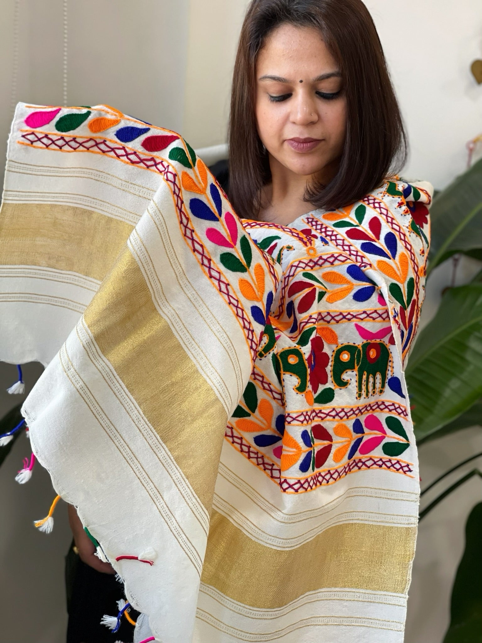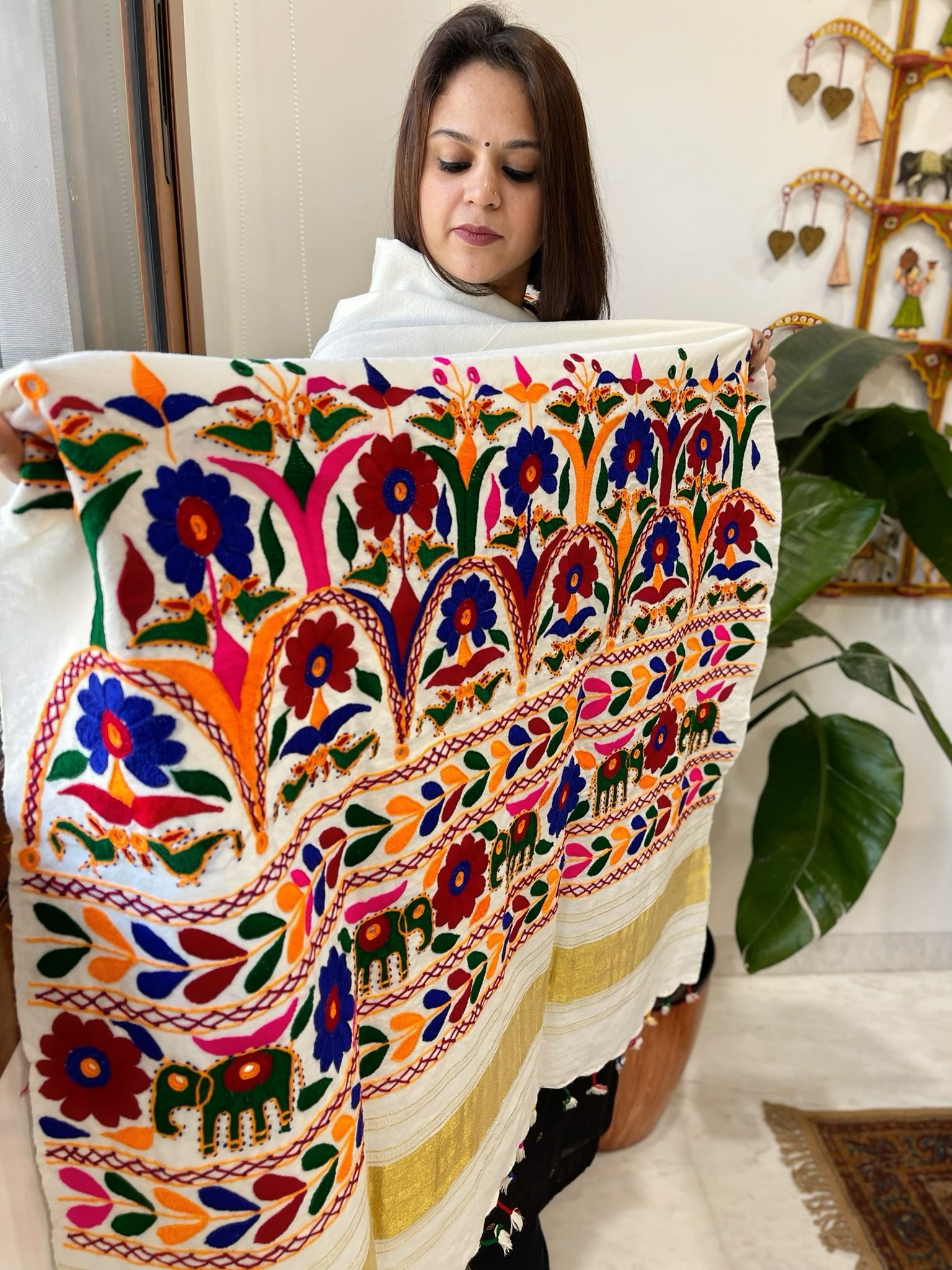 Cream Handwoven Woollen Shawl with Thread and Foil Mirror Handwork