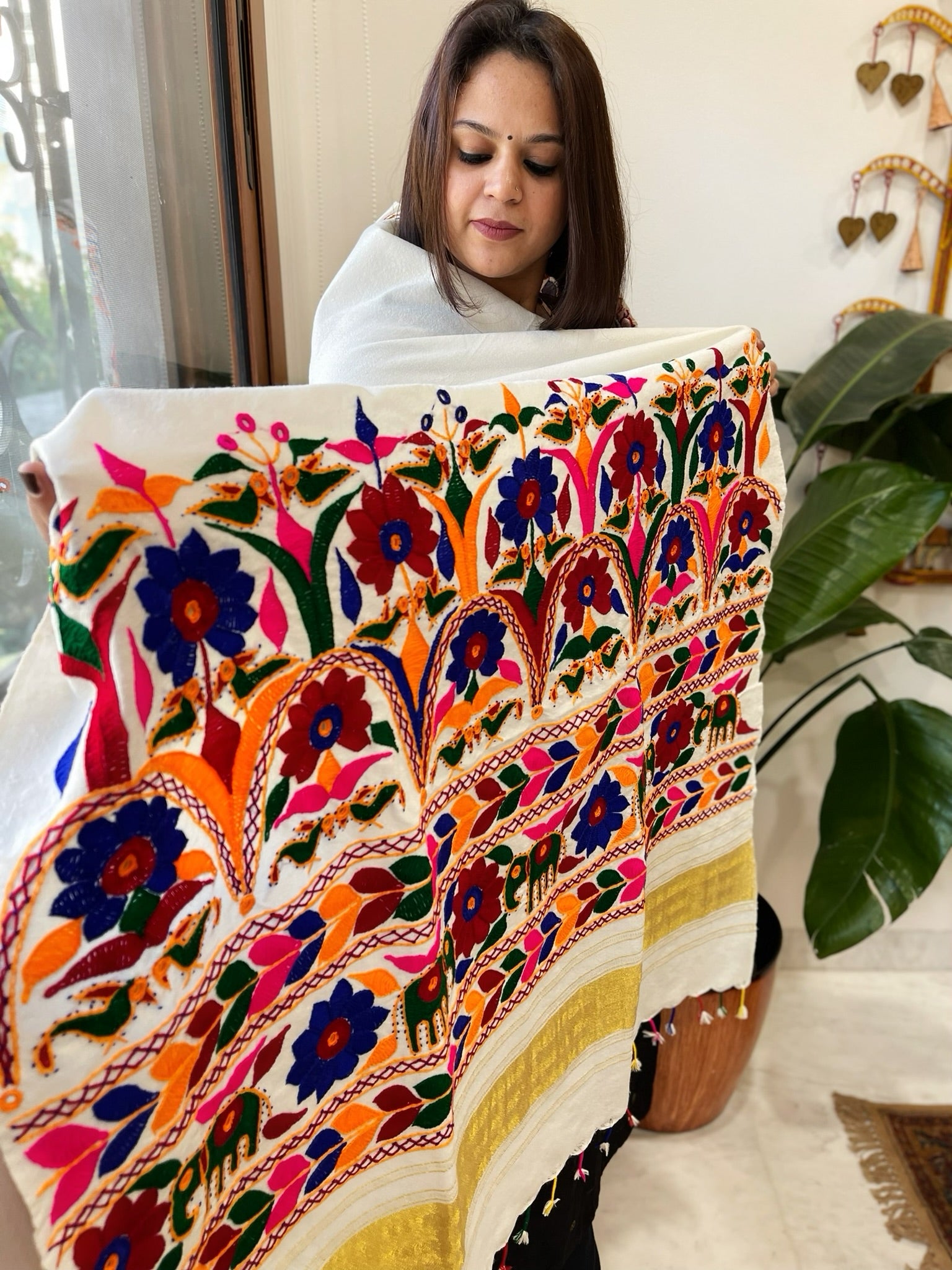 Cream Handwoven Woollen Shawl with Thread and Foil Mirror Handwork