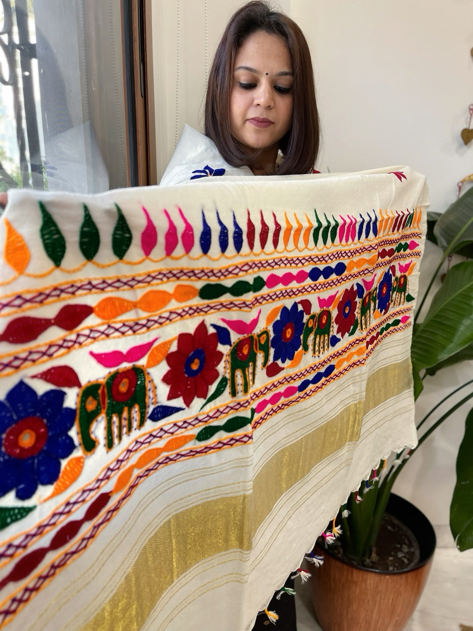 Experience the warmth and beauty of our Handwoven Woollen Shawl! Made with Pure Merino Wool and adorned with intricate Foil Mirror and Thread Handwork, it's the perfect addition to your winter wardrobe. Stay cosy and stylish in any weather with this versatile shawl.