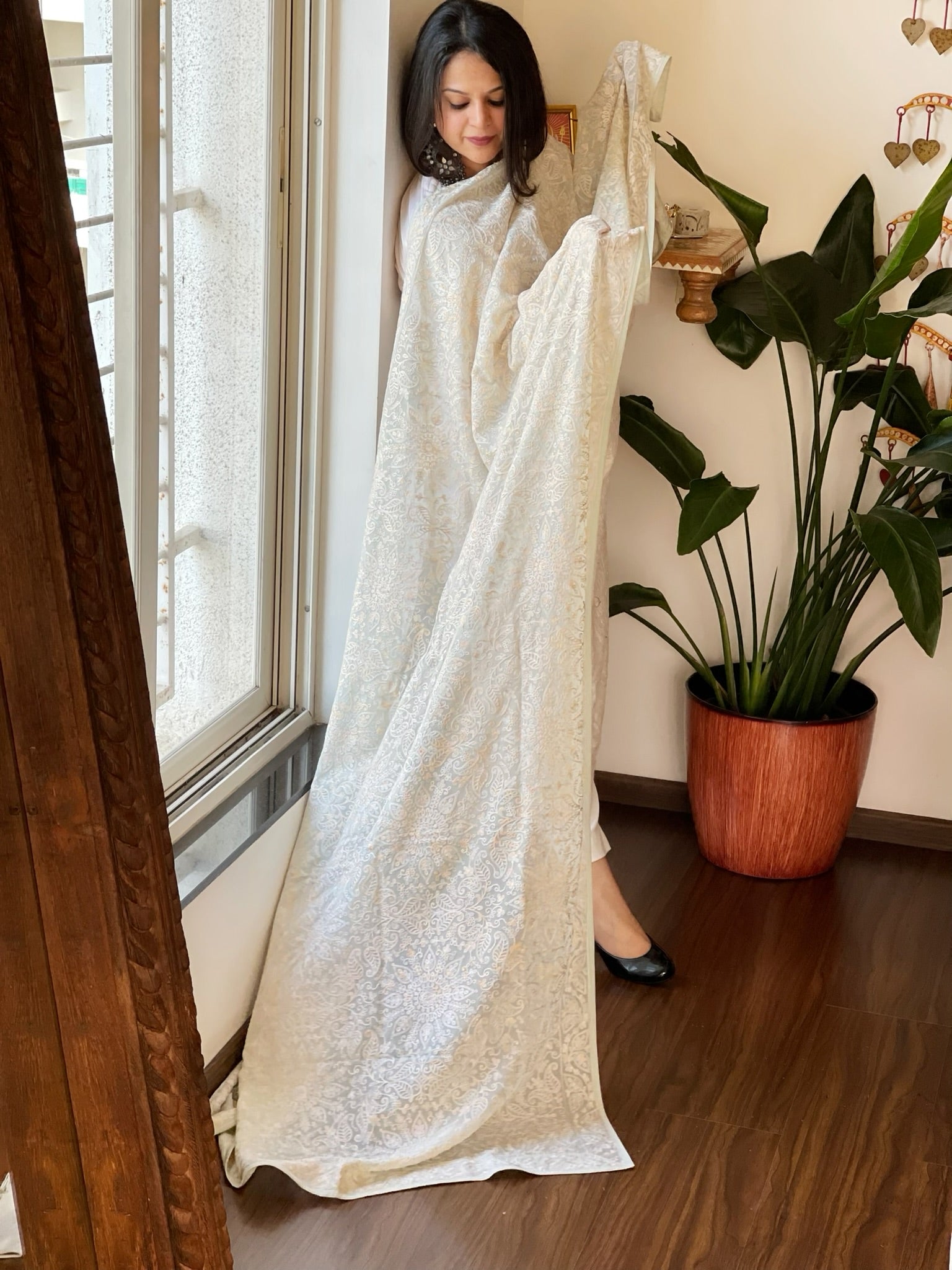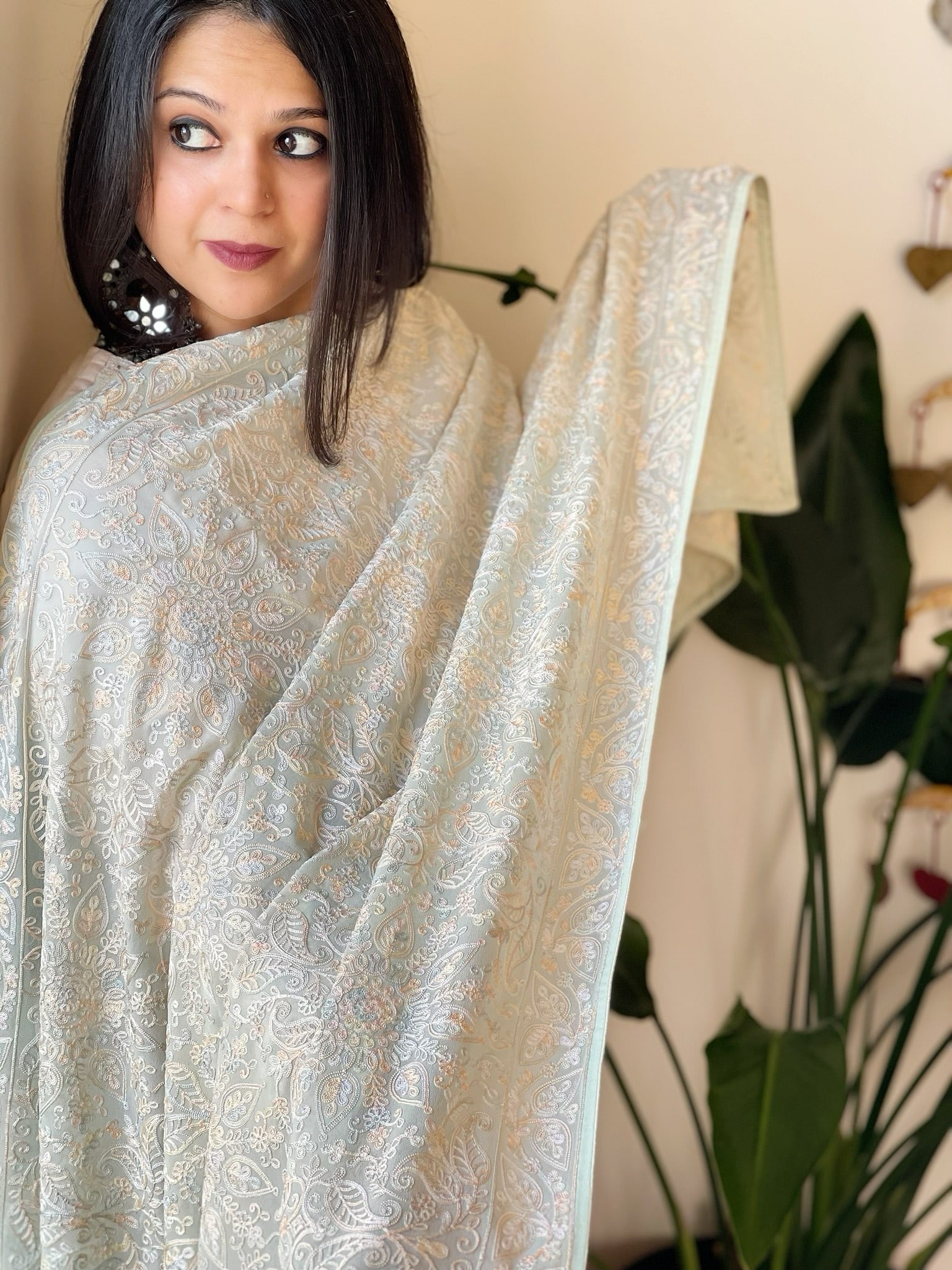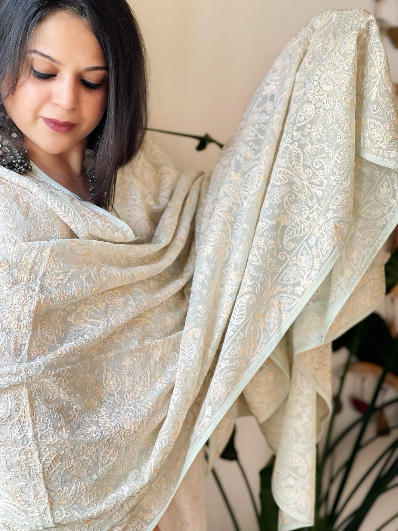 Expertly crafted, this ice blue georgette embroidered dupatta showcases stunning kashmiri thread work. Its pastel colors add a touch of elegance and versatility, making it a perfect addition to any outfit. Elevate your style with this gorgeous piece.