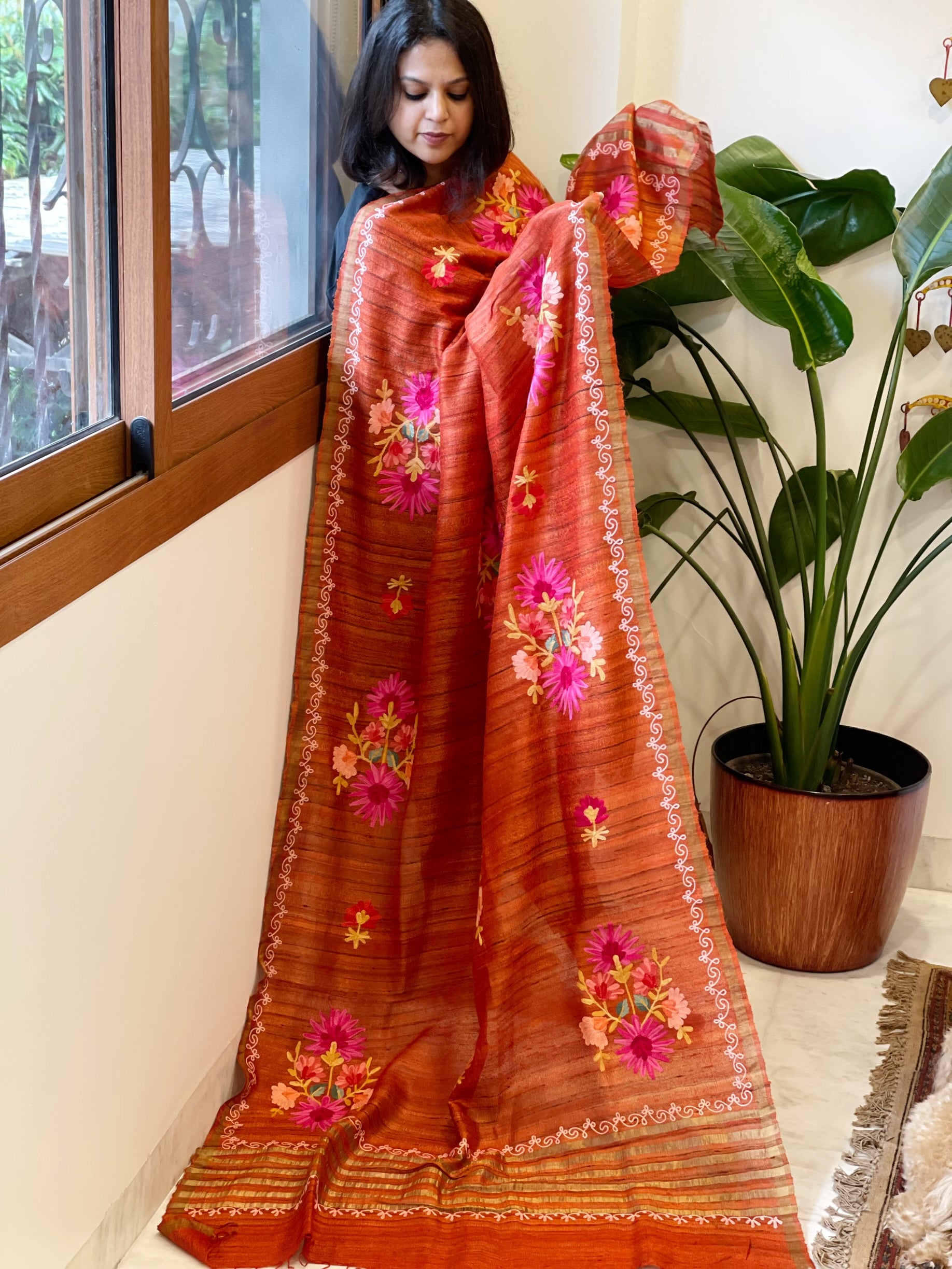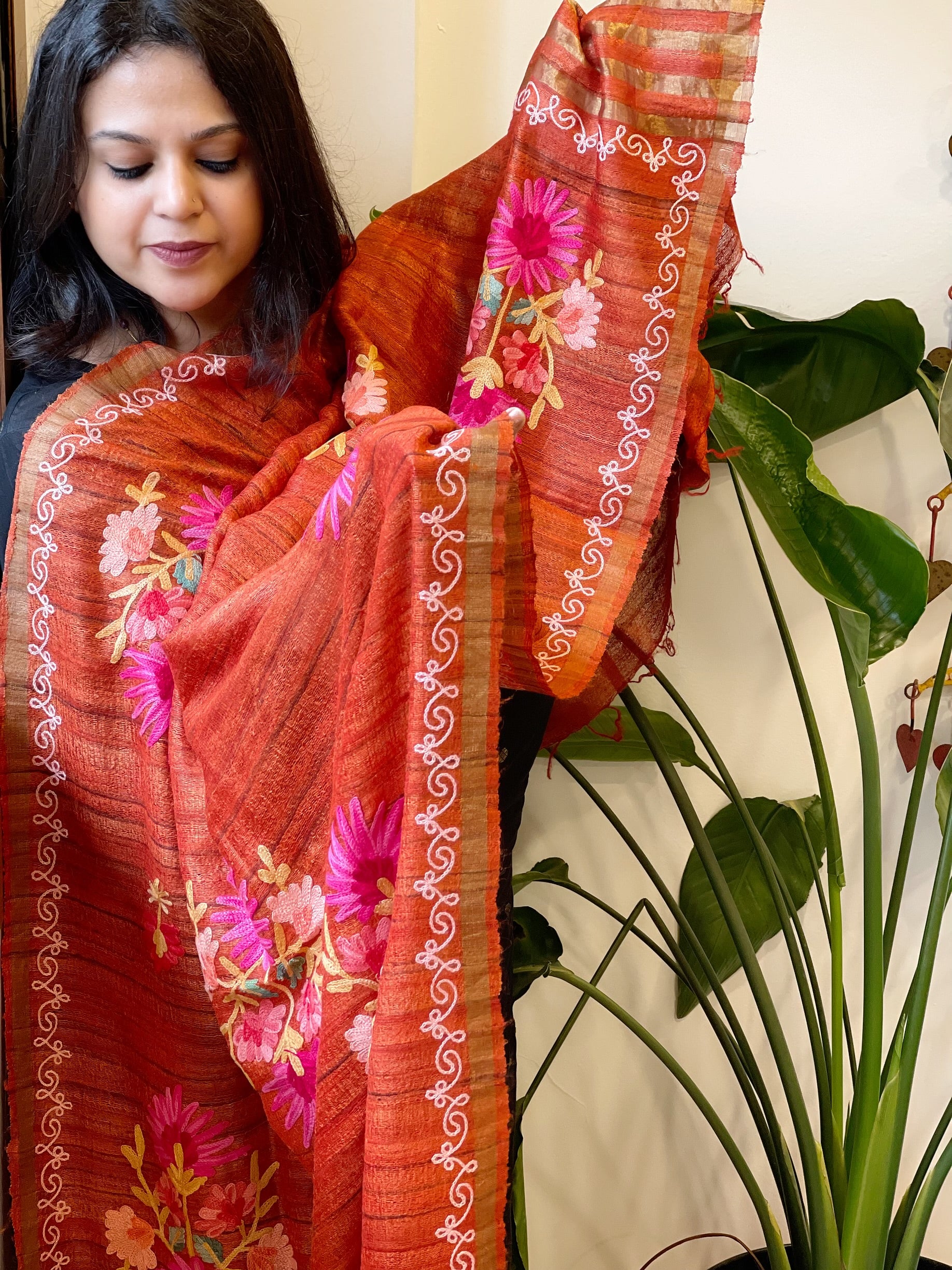 Kashmiri Aari Embroidered Dupatta in Geecha Silk