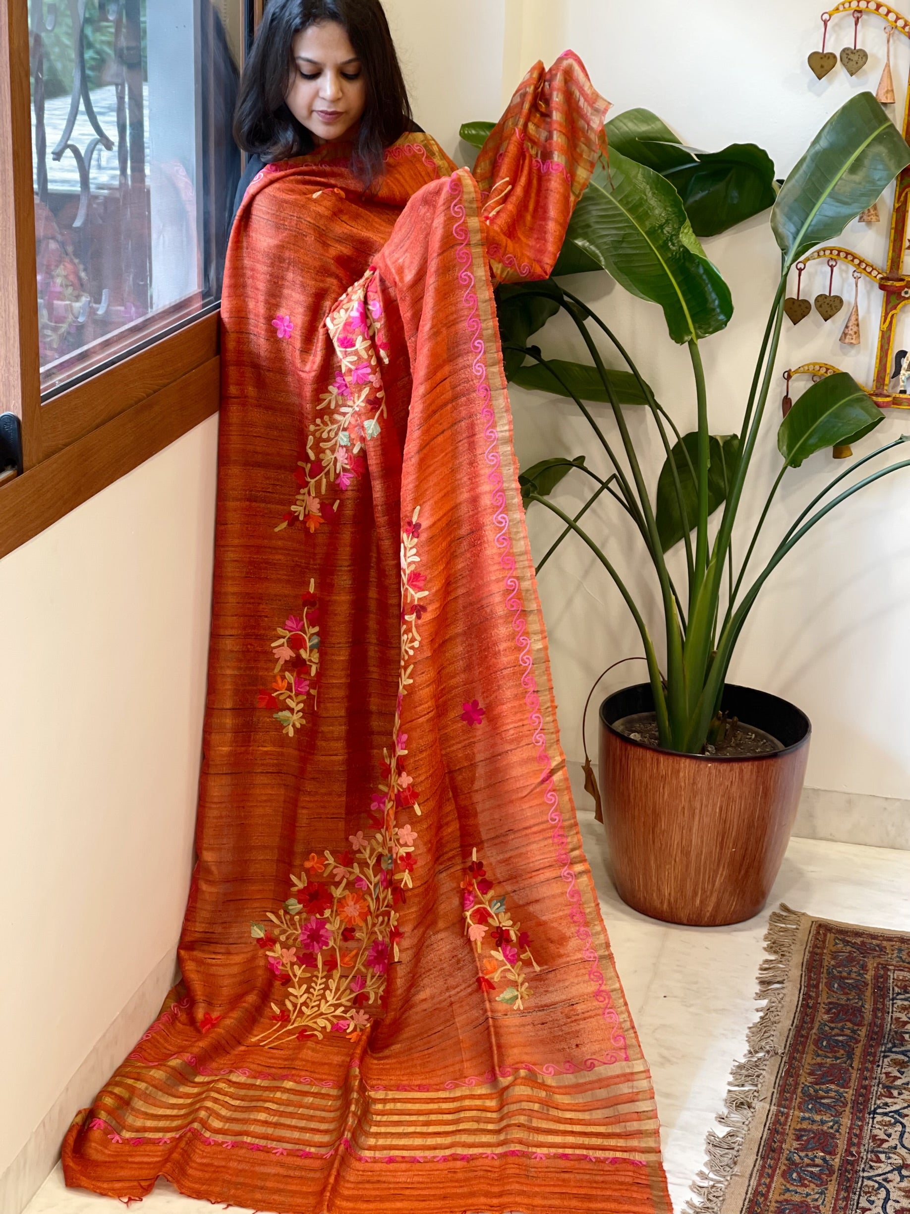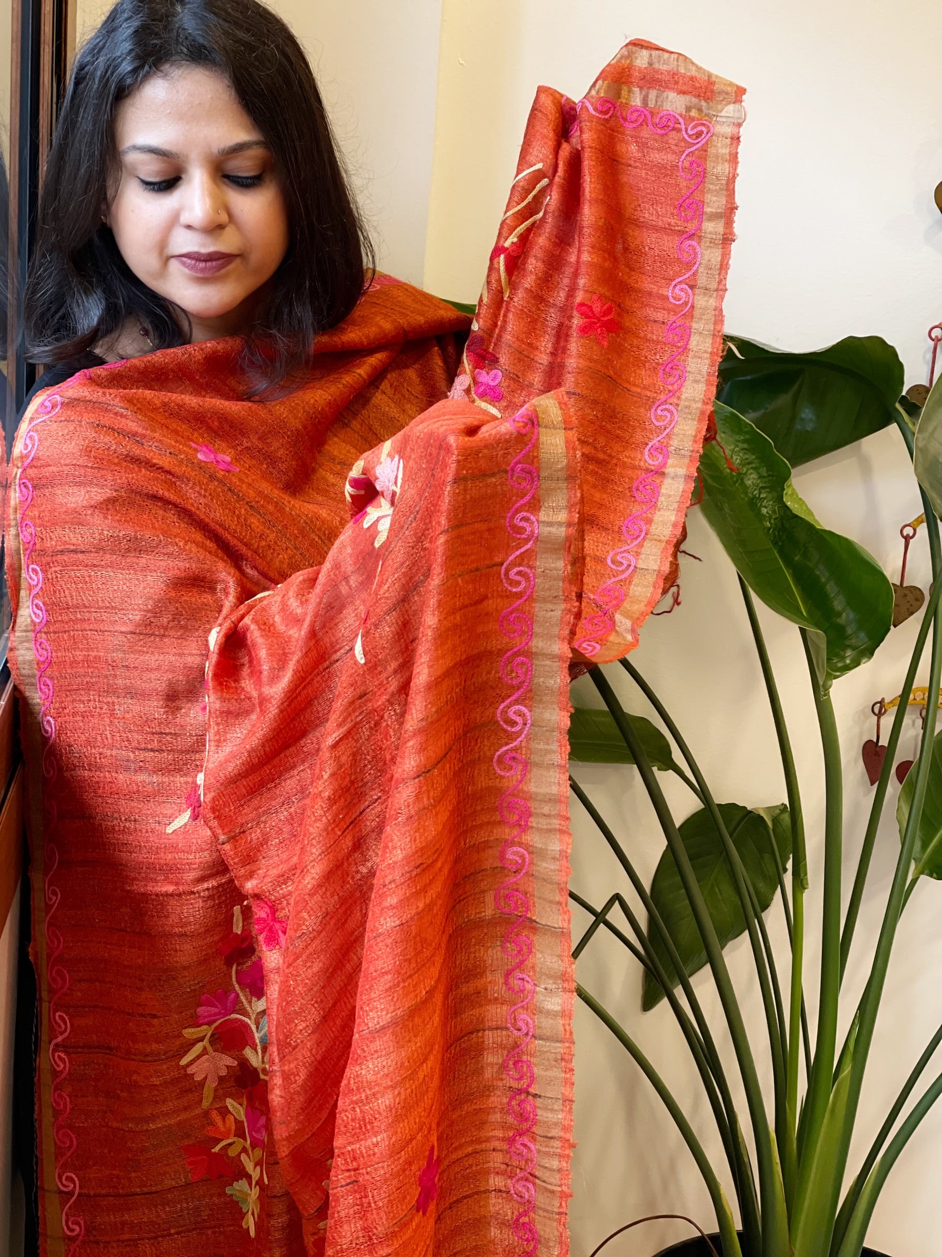 Unleash elegance and sophistication in this Kashmiri Aari Dupatta. Made from pure Geecha Silk, its intricate embroidery and stunning colors make it a timeless classic. A must-have for your wardrobe, this head-turner exudes sheer luxury and opulence. Perfect for any occasion, elevate your style with this exquisite piece.