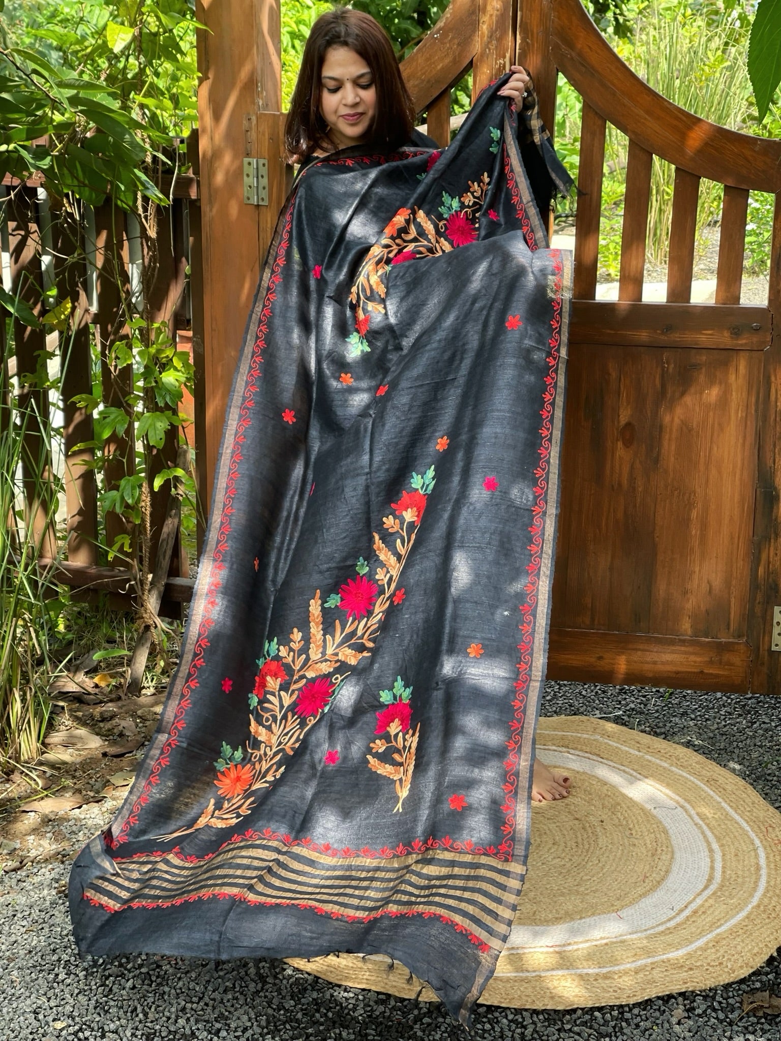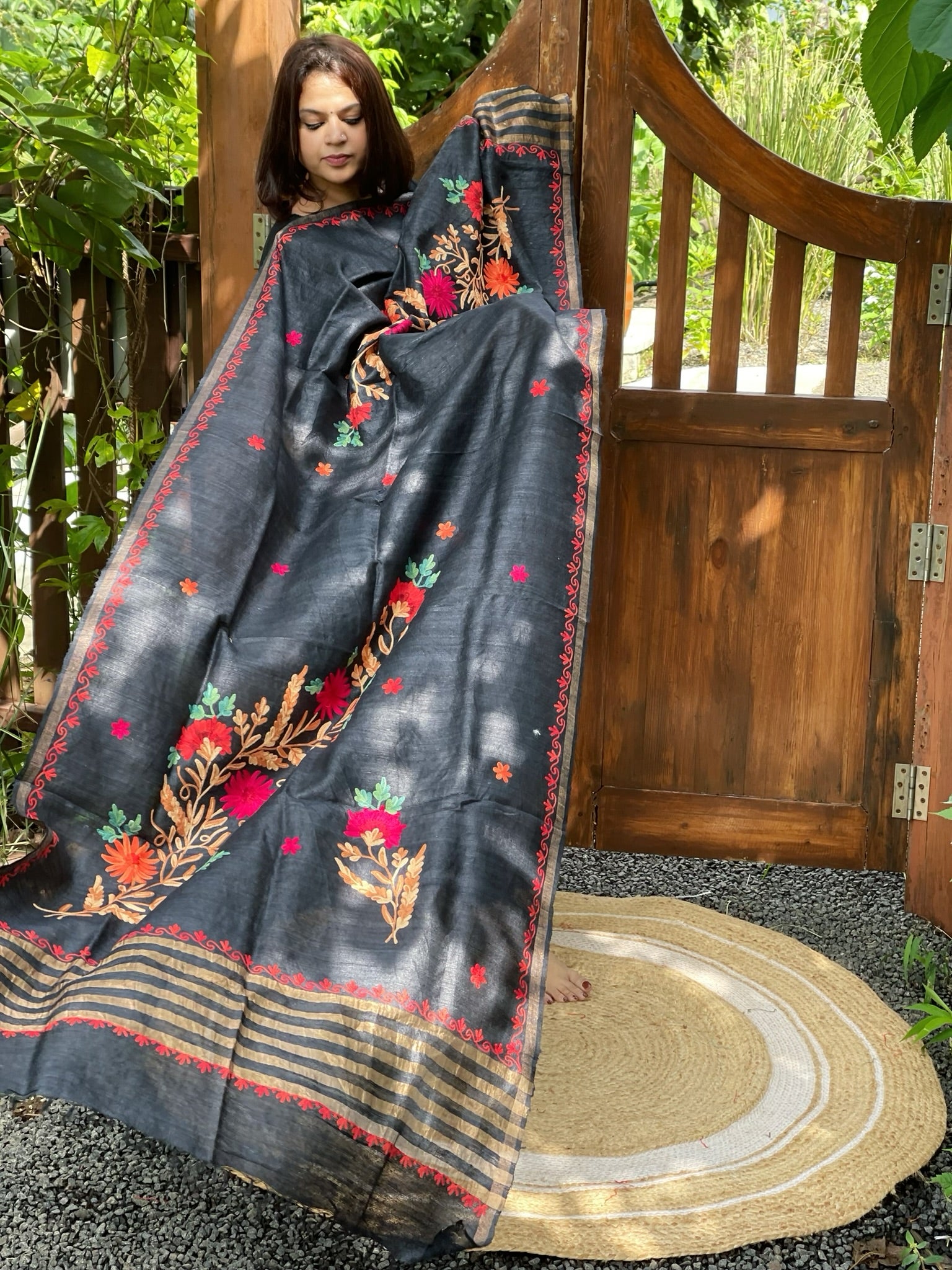 Unleash elegance and sophistication in this Kashmiri Aari Dupatta. Made from pure Geecha Silk, its intricate embroidery and stunning colors make it a timeless classic. A must-have for your wardrobe, this head-turner exudes sheer luxury and opulence. Perfect for any occasion, elevate your style with this exquisite piece.