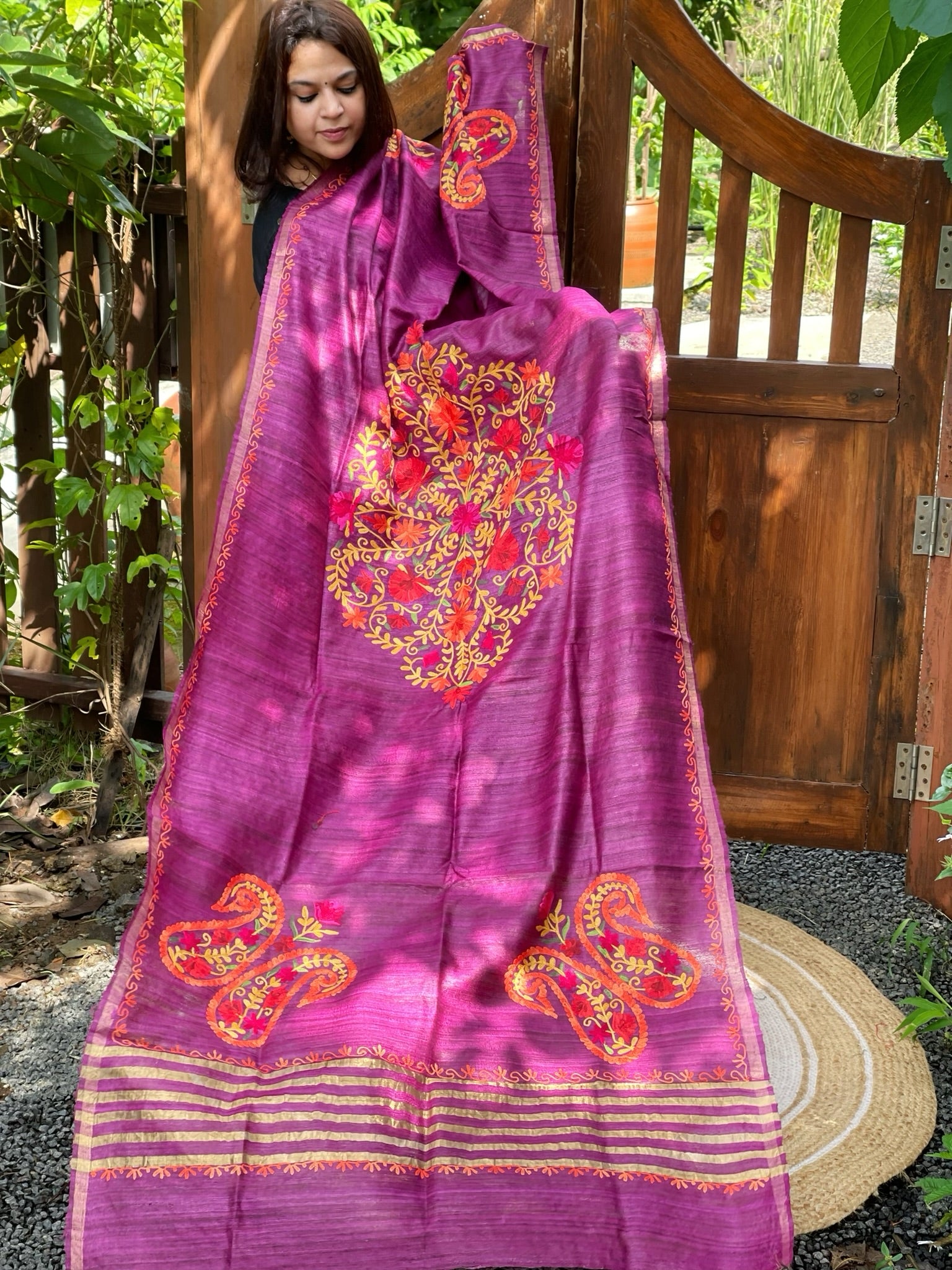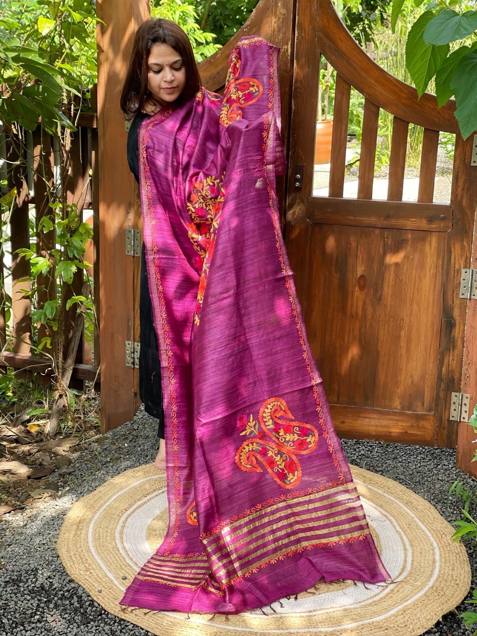Unleash elegance and sophistication in this Kashmiri Aari Dupatta. Made from pure Geecha Silk, its intricate embroidery and stunning colors make it a timeless classic. A must-have for your wardrobe, this head-turner exudes sheer luxury and opulence. Perfect for any occasion, elevate your style with this exquisite piece.