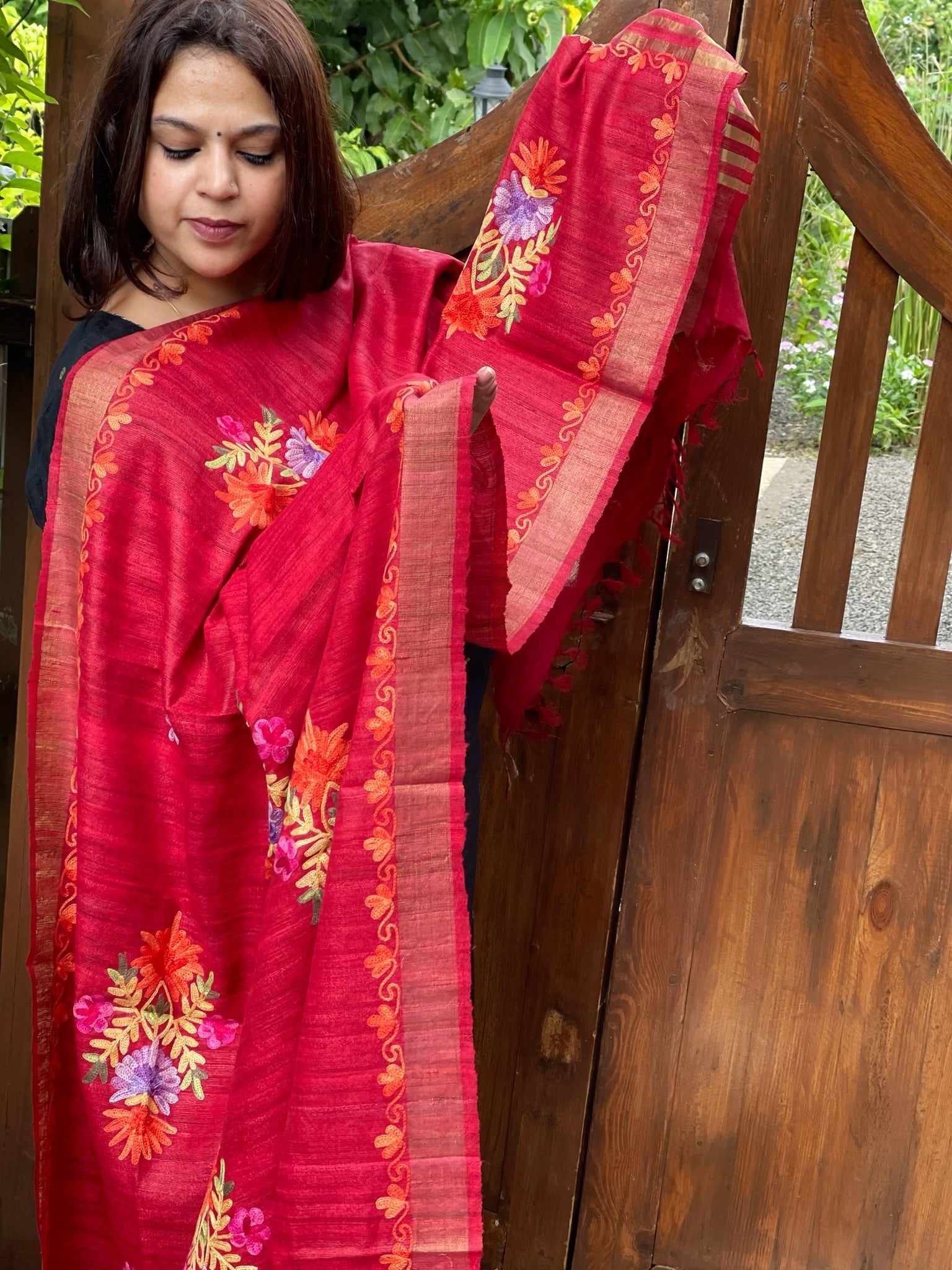 Unleash elegance and sophistication in this Kashmiri Aari Dupatta. Made from pure Geecha Silk, its intricate embroidery and stunning colors make it a timeless classic. A must-have for your wardrobe, this head-turner exudes sheer luxury and opulence. Perfect for any occasion, elevate your style with this exquisite piece.