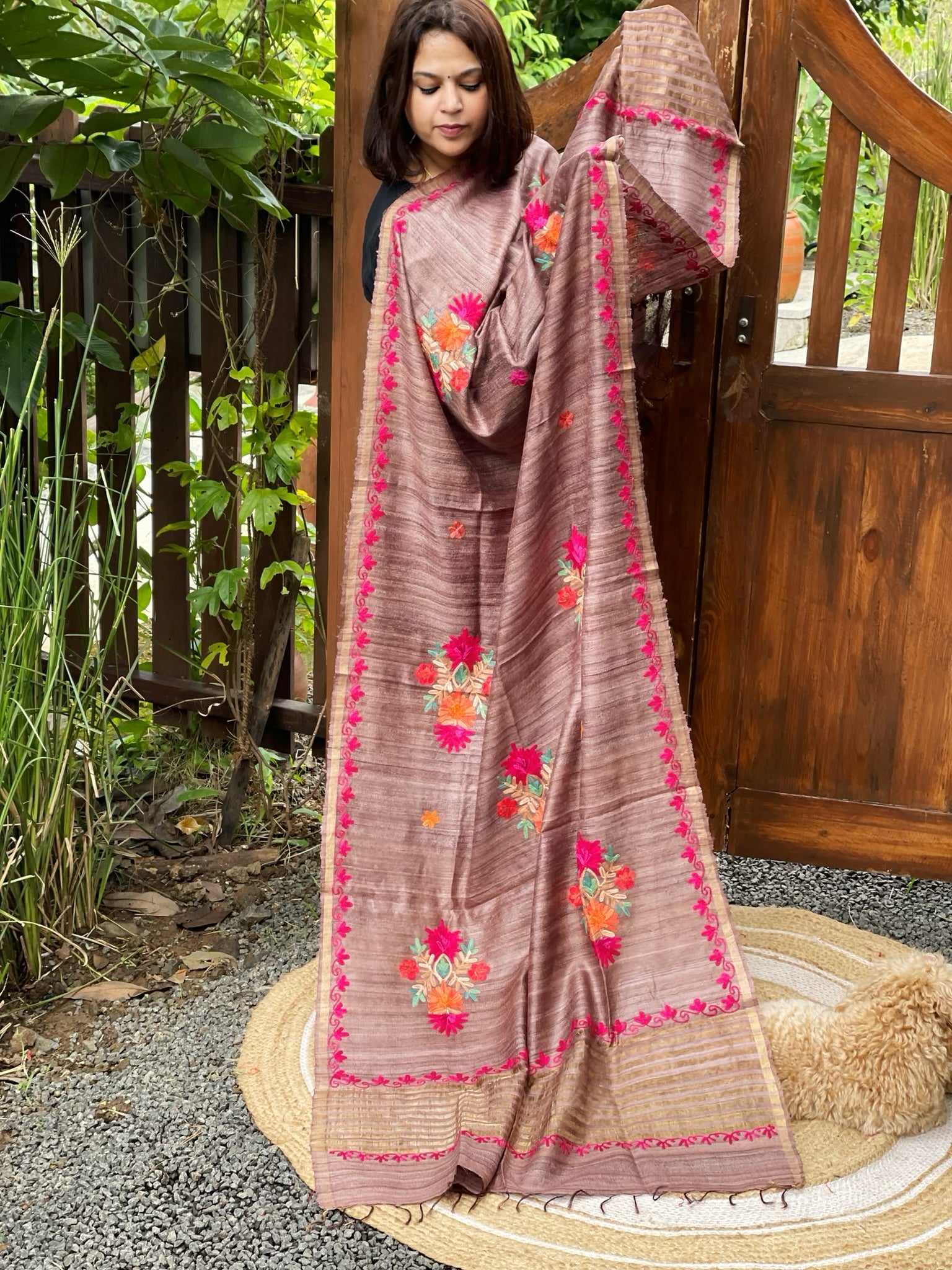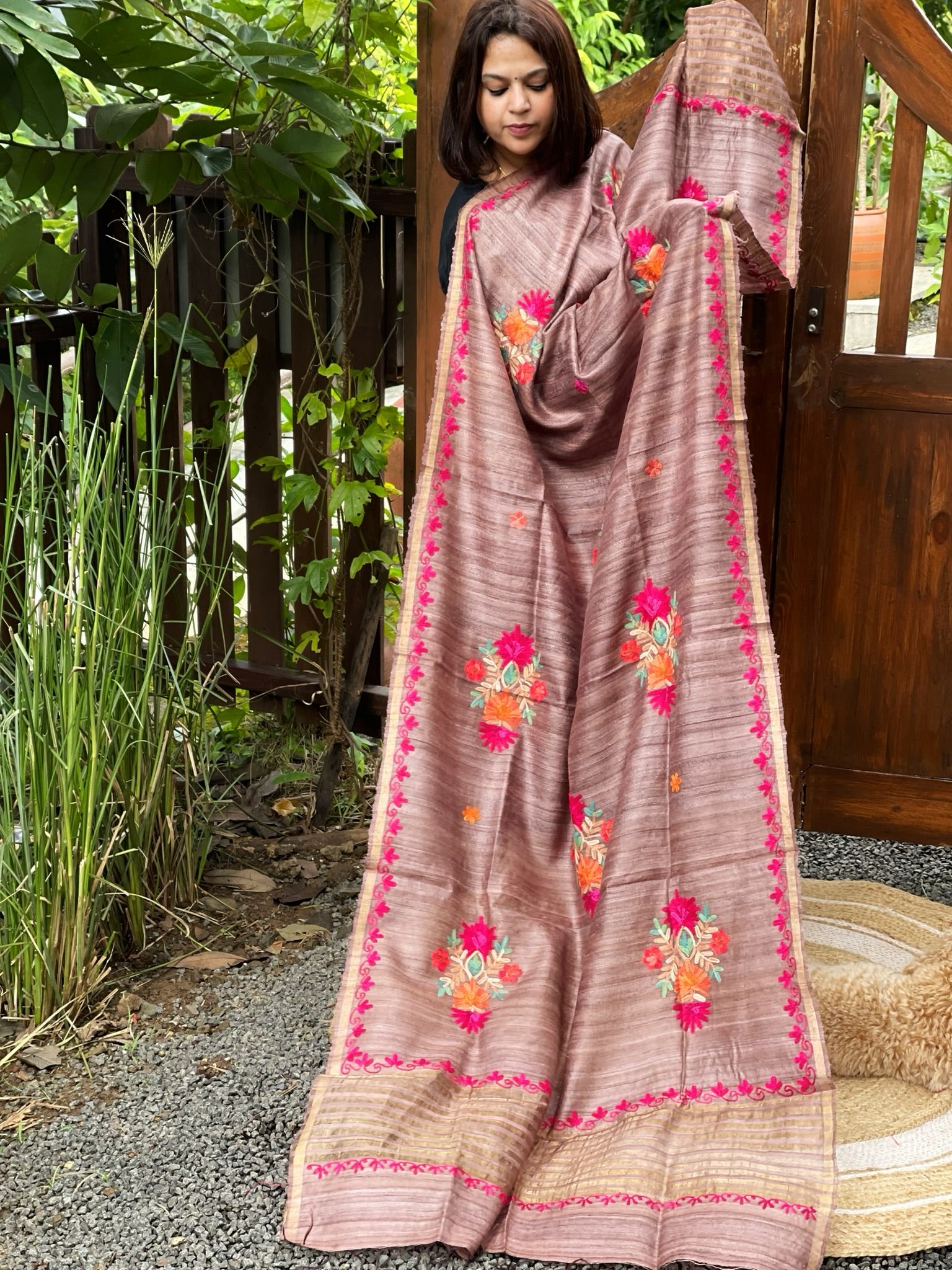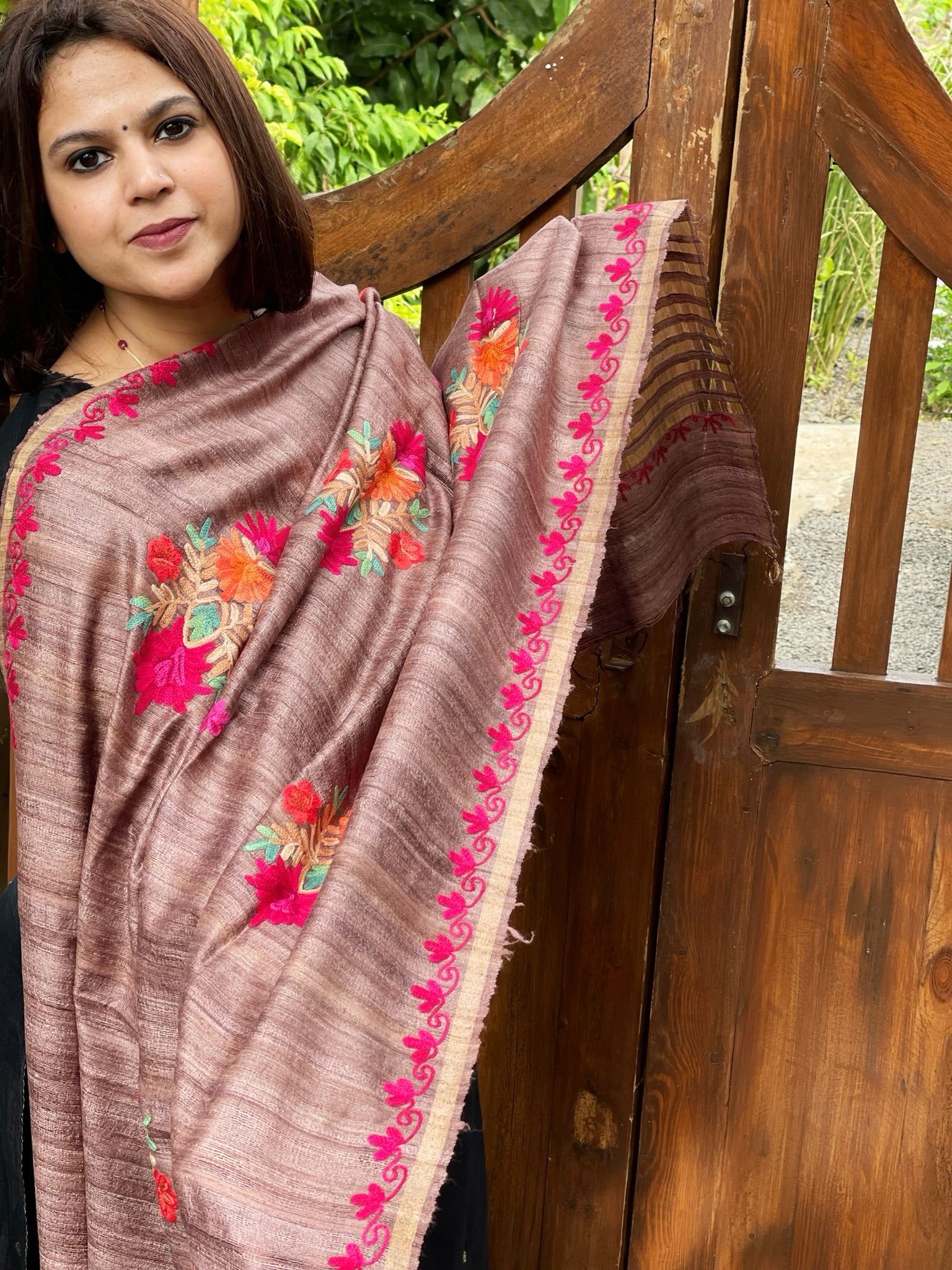 Lite Chocolate Kashmiri Aari Embroidered Dupatta in Geecha Silk